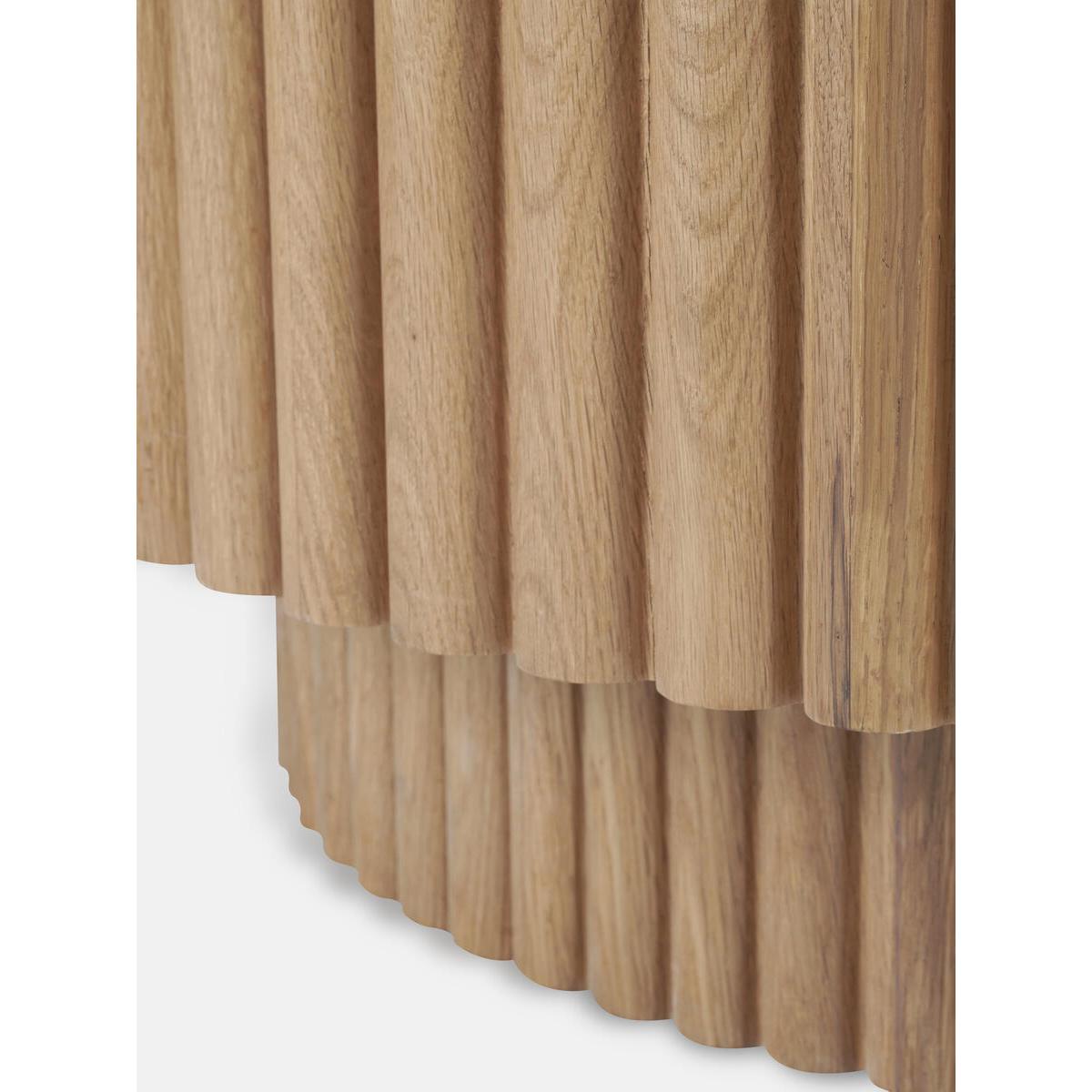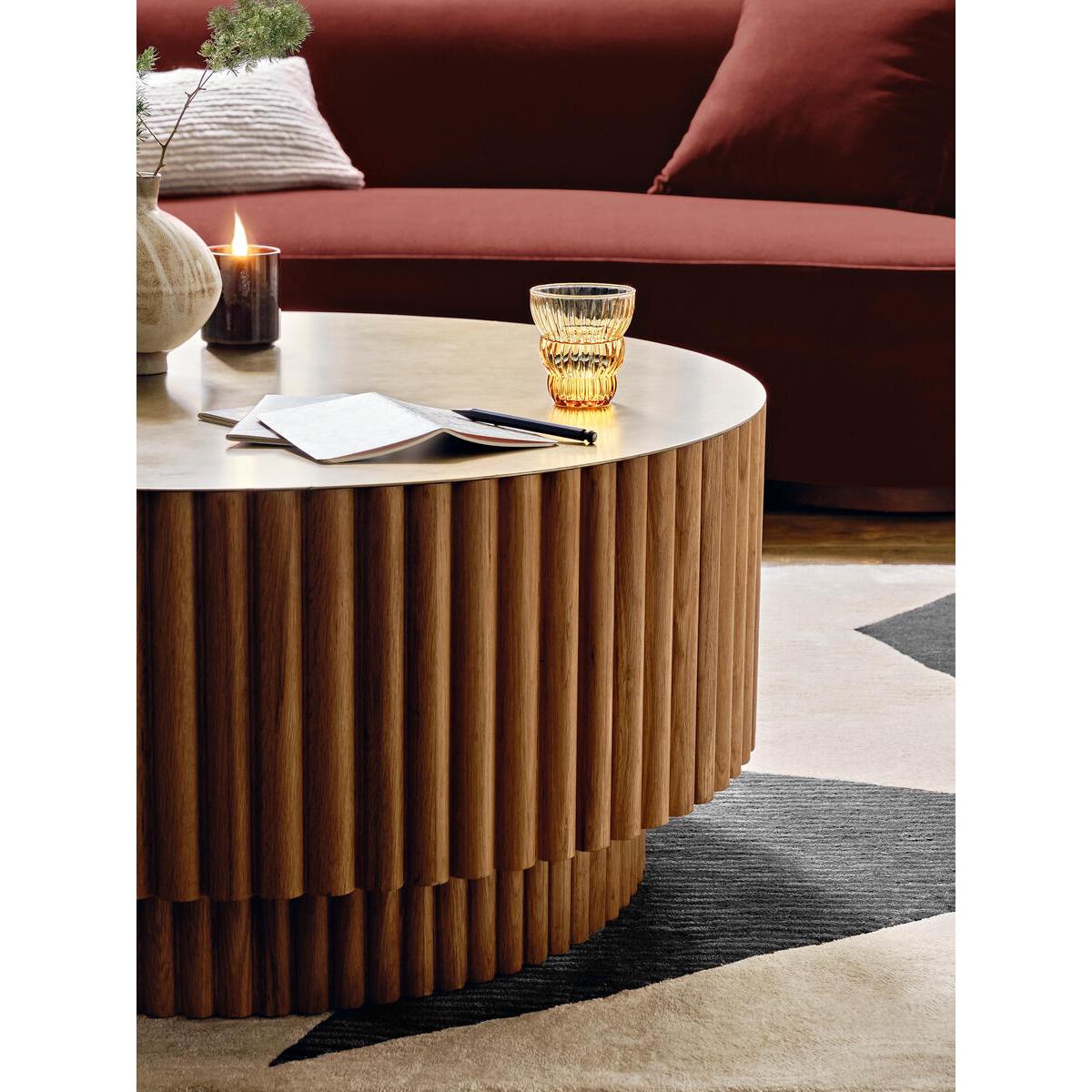 I’m a fan of the barrel table for its simple, sculptural form and fluted wood detail - it brings warmth and texture without overwhelming a room. It works particularly well in Scandi, mid-century and contemporary schemes, where its round shape softens angular sofas and shelving. For styling, keep the surface clear of clutter: pair a low vase of foliage with a small stack of art books and a single candle on a tray. The generous diameter also makes it ideal for sharing drinks and snacks in a cosy living space.