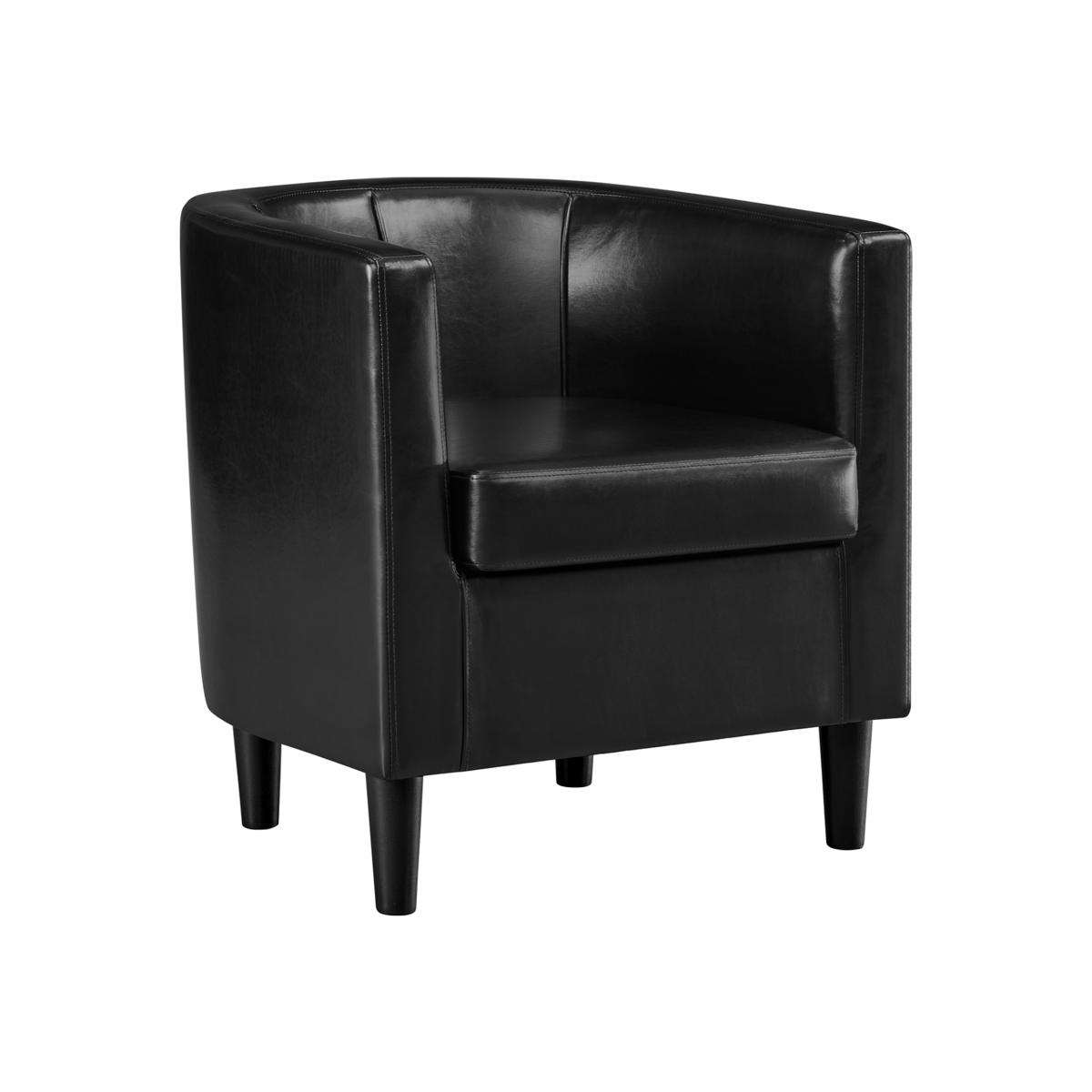 I’m a fan of this tub chair because its clean lines and compact form make it a versatile addition to both modern and industrial-leaning spaces. The black faux leather surface pairs well with raw timber or metal accents, so it slips effortlessly into a Scandi loft or a monochrome living room. For a cosy corner, balance it with a light lambswool throw and a slimline side table, then layer in a brass lamp to soften its stark silhouette.