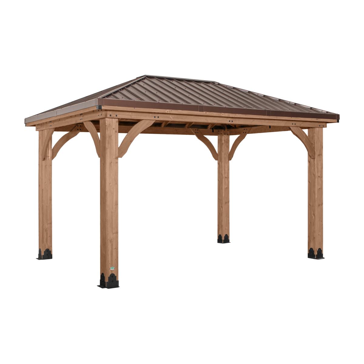 Meet the Barrington Gazebo from Backyard Discovery and transform your garden into the perfect sanctuary. The heavy-gauge galvanised steel hip roof combines classic style with durable construction, providing protection from rain, snow, and sun. Designed for exceptional stability and resilience, this wooden gazebo is Pro-Tect tested and proven to withstand up to 3.5 tonnes or 76 centimetres of snow, and 100 mph winds*. The pre-stained finish adds a charming aesthetic while the beautiful cedar wood frame is resistant to rot and decay, ensuring the Barrington is a long-lasting addition to your back garden. This versatile outdoor gazebo is perfect for enhancing any garden while easily accommodating comfortable furniture and decorative elements to match your style. Whether you're seeking a private hideaway, a dedicated outdoor space for yoga or exercise, or a charming venue for garden parties, the Barrington patio gazebo adapts effortlessly to your needs. Assembly is streamlined with pre-cut, pre-stained, and pre-drilled components, while the interactive BILT app provides step-by-step guidance. Bring the Barrington Gazebo home today and create your dream garden sanctuary. Please Note: *Product must be anchored as specified in the Backyard Discovery instruction manual Size - 4.3 x 3m (14ft x 10ft)
