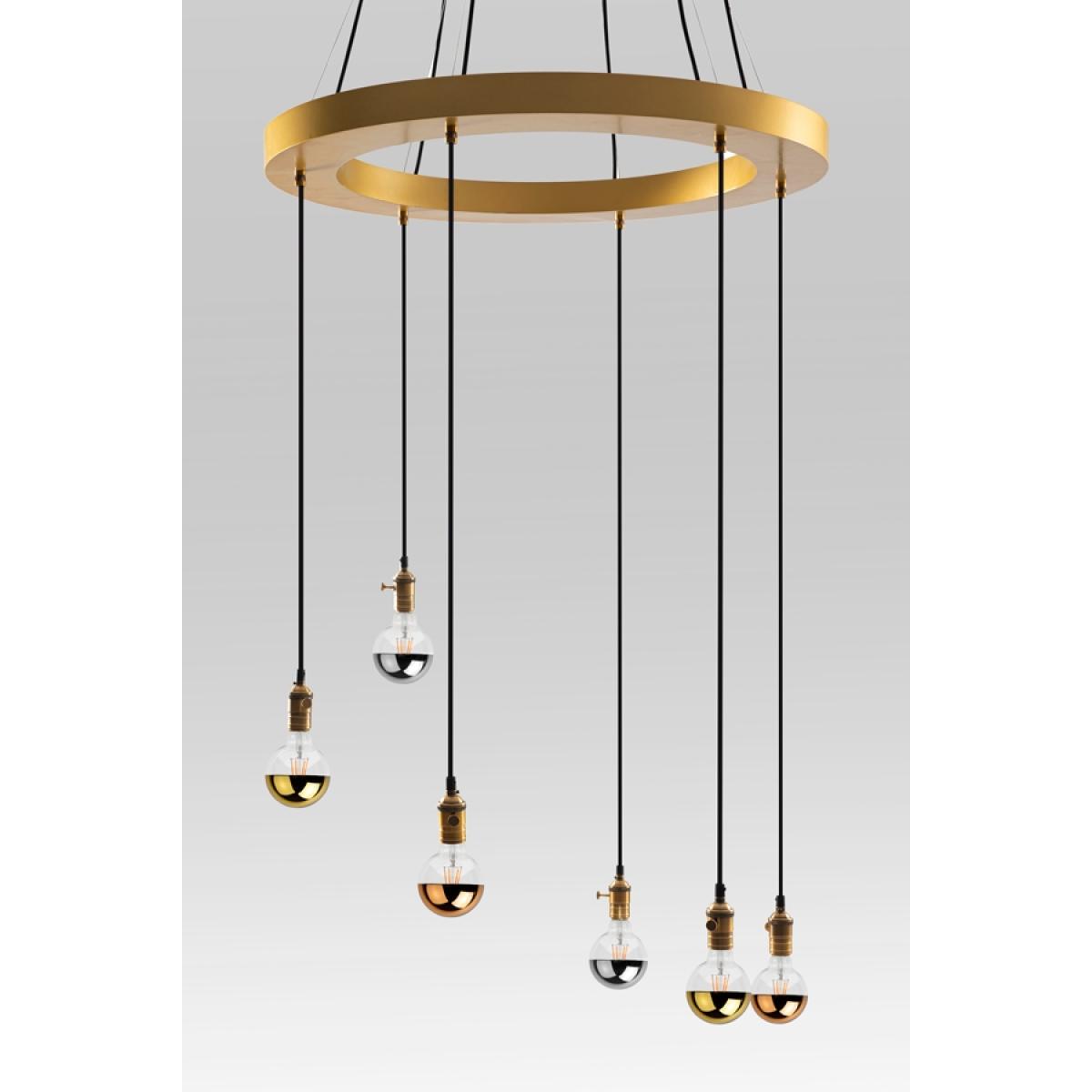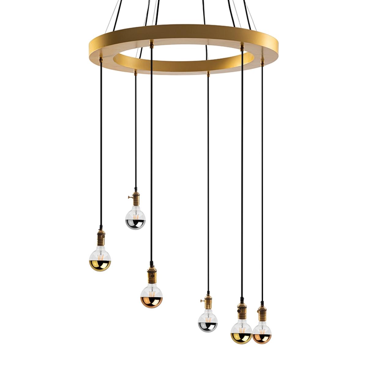 A magnificent centrepiece which will create an unforgettable focal point. Steel with brushed brass finish. Ideal for Stairwells, restaurants, bars and clubs. The six individual cables and bulbs can be height adjusted before or after installation, allowing for various configurations to suit mood or situation. The finely engineered height adjusters and cable management trough keep things neat and simple to use. Supplied complete with two brass, two silver and two copper capped G95 bulbs. Each bulb holder has an individual on off switch. Due to the size and weight of this item we recommend a two man installation by qualified electricians. Weight 12 kilogrammes.