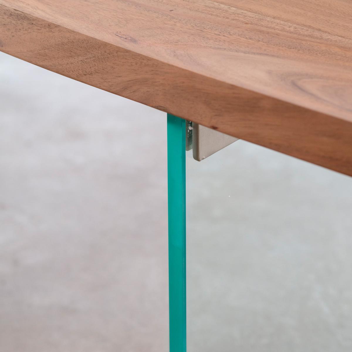 Sit in style on the ultra-classy and contemporary Basca Dining Bench. Perfect to combine alongside the matching Basca Dining Table, this bench in a solid wood finish with clear tempered glass legs allows light to flow and amplifies space through the transparency. Includes: 1 x bench top, 2 x bases & fixtures.