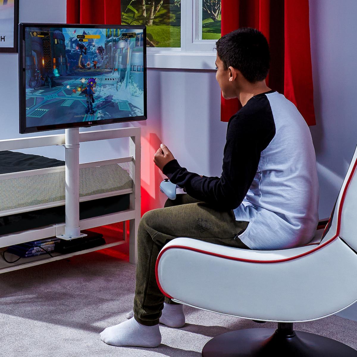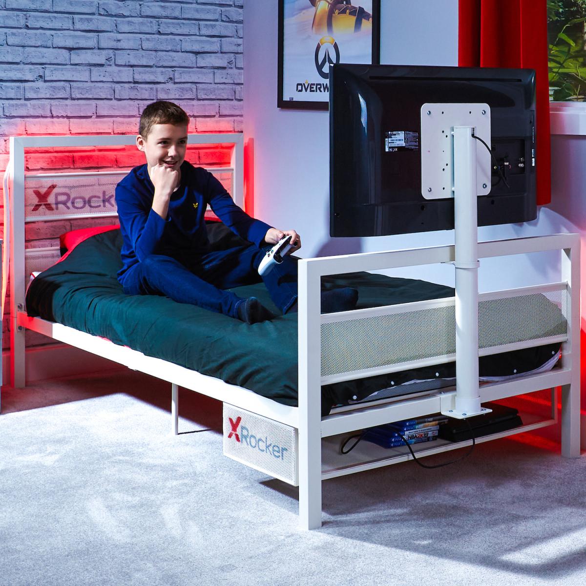 Introducing X Rocker's innovative TV bed with a twist. The Basecamp single bed is ready for gaming day or night, with a rotating TV platform that provides a secure fit for any TV up to 32 inches. Equipped with a mesh undercarriage that protects your consoles and keeps hardware cool by allowing optimal airflow. Perfect for overnight gaming or movie marathons.