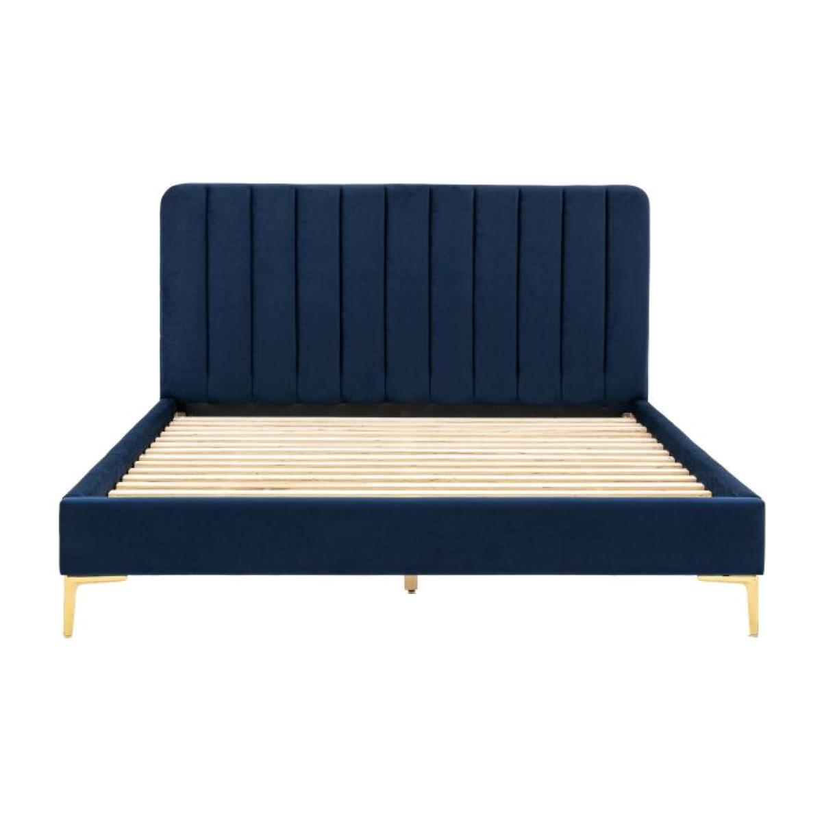 Add a touch of luxe to your bedroom with this lavish double bedstead. Upholstered in dark blue velvet the panelled headboard is cushioned with vertical stitch detailing and is complemented by the slim gold toned metal legs, adding that final touch of luxury. Also available in other sizes and colours. Material: MDF 30% / Polyester 30% / Foam 20% / Wood Slat 10% / Iron 10%. Colour/Finish: Indigo.