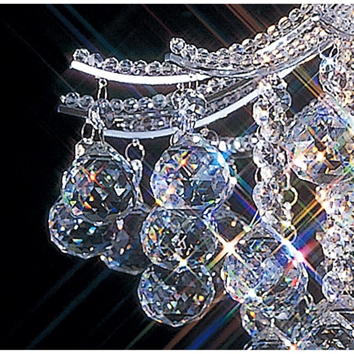 An illustrious Polished Chrome or Gold finish fitting filled with an abundance of tightly arranged large Asfour crystal spheres. The curved framework is trimmed in small crystal beads and finished with strands of octagon crystal and a crystal sphere. The combined radiance of colour from the crystal is extraordinary. Complimenting wall lamps are also available from the Atla range.