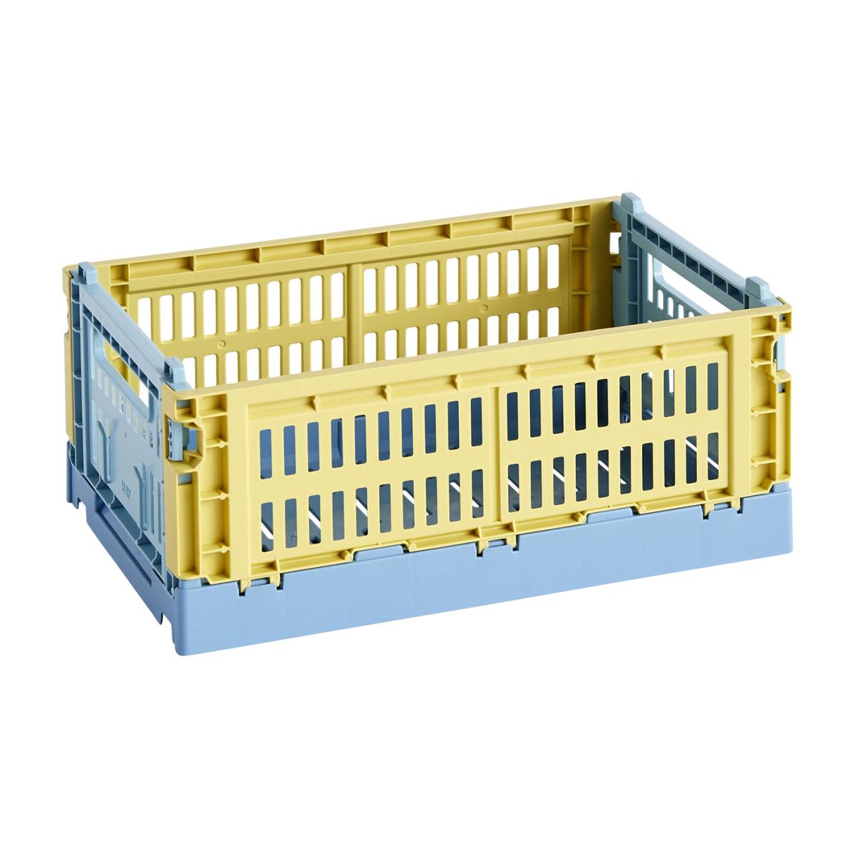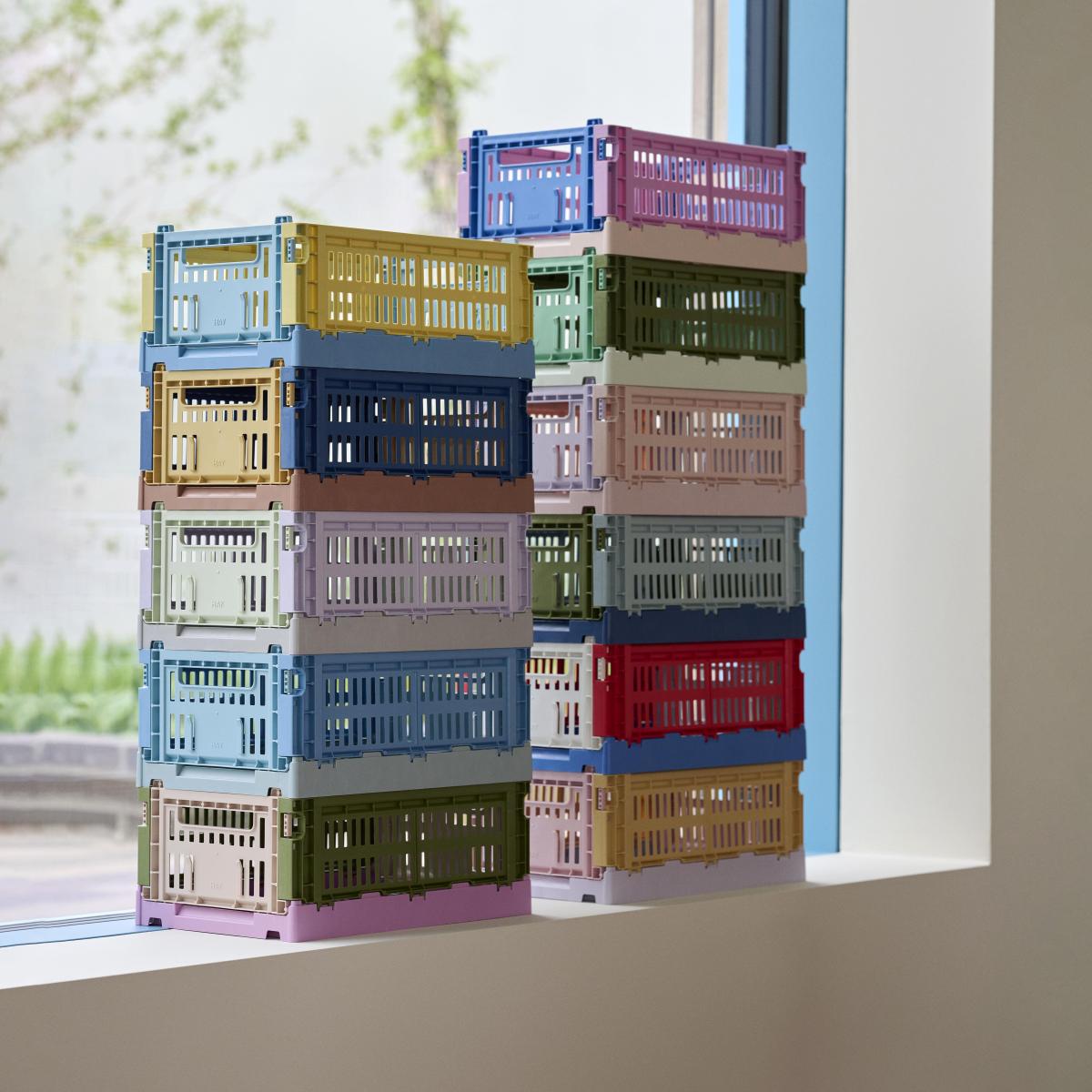 These eco-friendly, colourful baskets are made with recycled polypropylene sourced from post-consumer plastic waste. Hay revises the classics and gives us a fun, colourful version of traditional vegetable crates. Available in a superb palette of current colours, these plastic storage solutions offer up an industrial, quirky, trendy look. True bestsellers from the Danish brand Hay, Colour Crate storage units are both decorative and ultra-functional. Colour Crate boxes are stackable, folding, light, strong and easy to clean. They let you organise everything: from the kitchen to the office, via the bedroom, bathroom, laundry room and garage... These storage units can safely come into contact with food: you can put fruit and vegetables in them. These storage units are also perfect for organising the contents of your fridge or cupboards. To brighten up your décor, feel free to mix the colours!