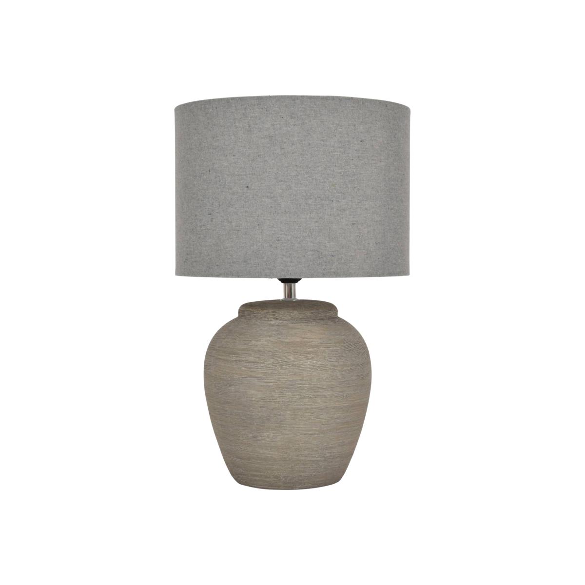 The Baslow ceramic table lamp is sophisticated in its simplicity. A chic accent for contemporary interiors. Why you'll love it. Naturally stunning. Modern design. Etched details add extra texture. Elegant rounded base. Wide linen-look shade. Perfect for lounges, hallways or bedrooms. Individually crafted for Furniture Village. What you need to know. No two lamps are the same. Ceramic base. Fixed switch on cable. Screw cap E27 bulb (not included). For indoor use only. Dimensions. Height: 58 cm (23 in). Width: 38 cm (15 in). Depth: 38 cm (15 in). Shade Height: 25 cm (10 in). Shade Width: 38 cm (15 in). Shade Depth: 38 cm (15 in).