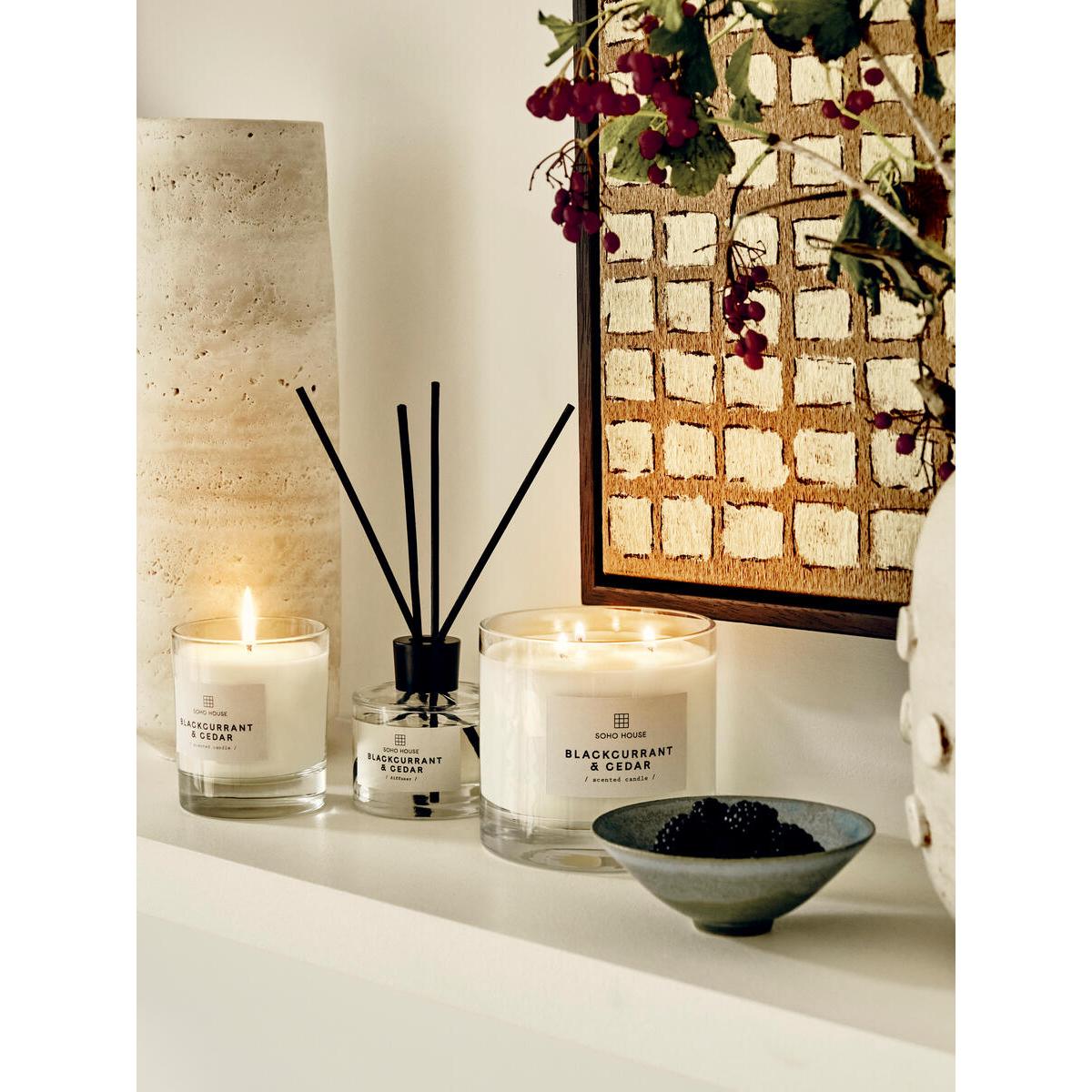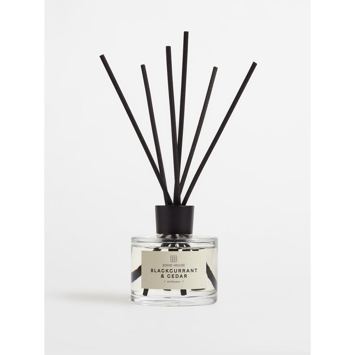 Characterised by a minimal design that complements any interior style, our Blackcurrant & Cedar diffuser captures the essence of an autumnal break at Soho Farmhouse. Infused with notes of Cassis and warm spices, it's grounded by a base of Cedar, Amber and earthy Patchouli, bringing the fragrant notes of the Orchard and Walled Garden to your home. Scent notes Top: Cassis Middle: Spices Base: Amber Diffuser with Blackcurrant & Cedar fragrance Porous black rattan reeds soak up and emit fragrance Lasts up to 12 weeks Housed in a glass bottle with metal lid Bespoke fragrance created by an expert perfumer for Soho House Inspired by Soho Farmhouse and Babington House