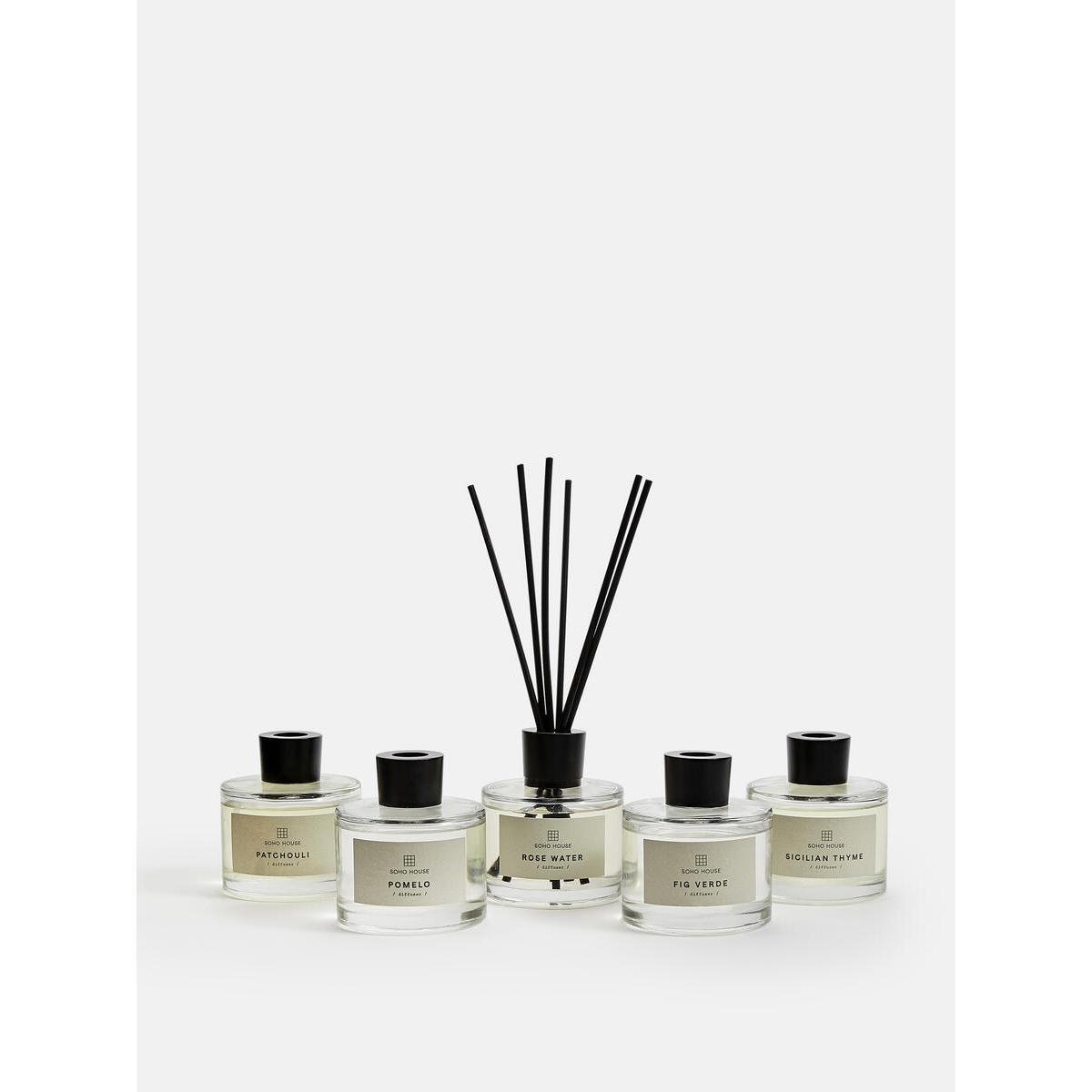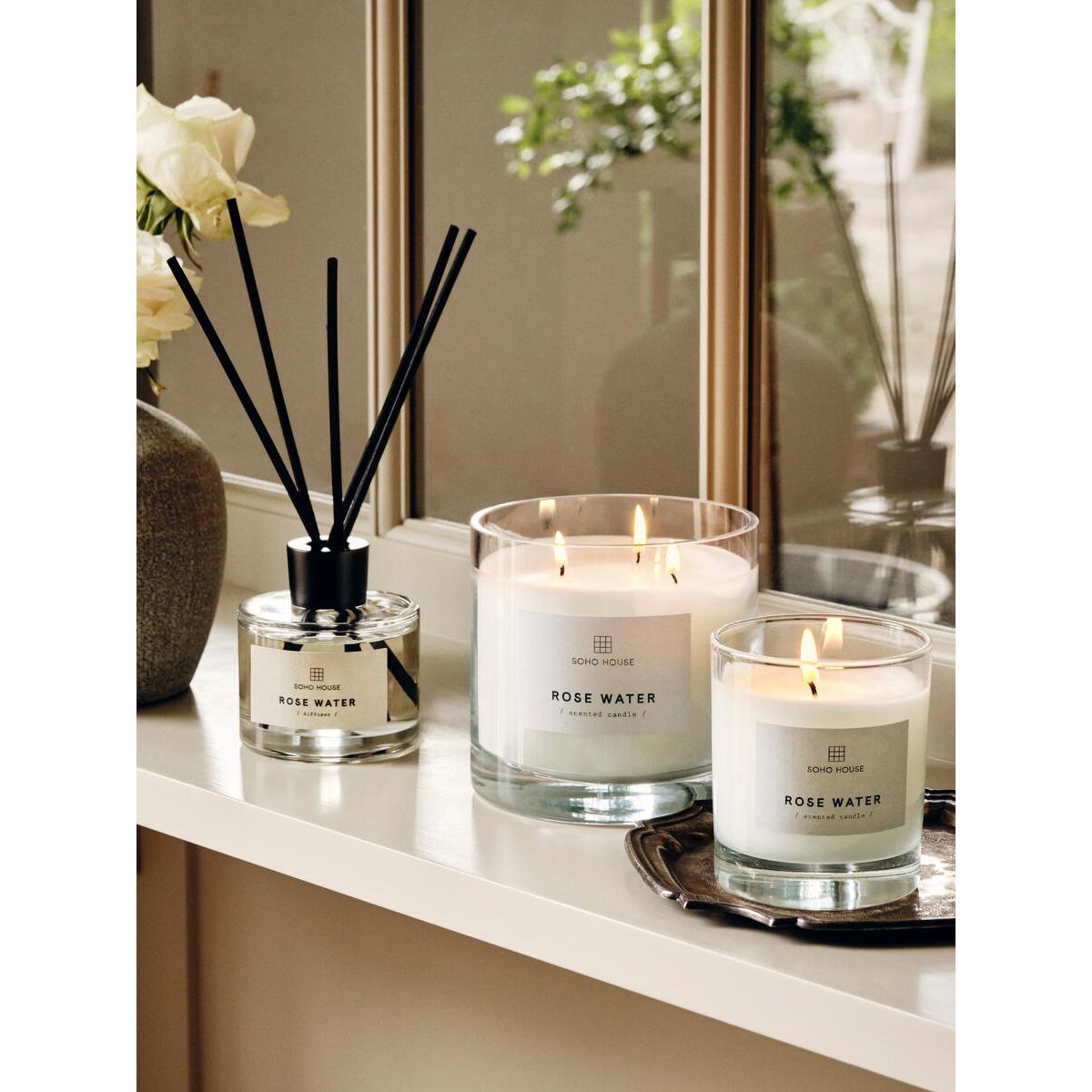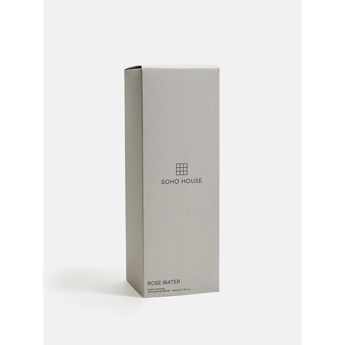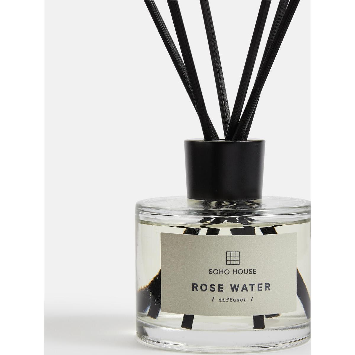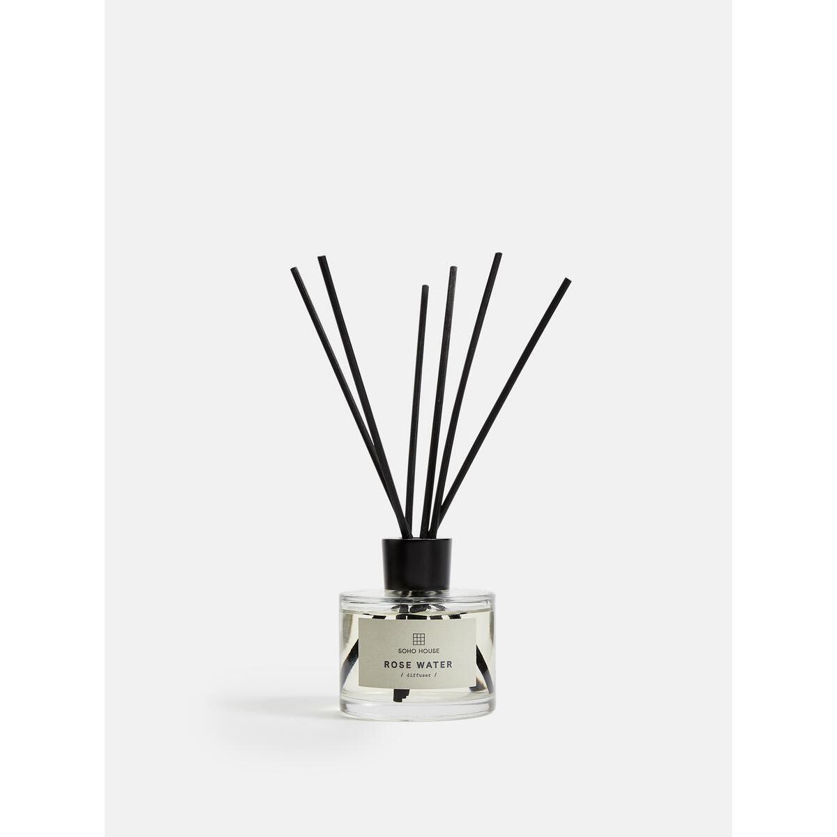Characterised by a minimal design that complements any interior style, this scent is an ode to the English rose and inspired by the Walled Garden at Babington House. Freshly picked petals combine with delicate notes of Geranium, Lemon and Bergamot, as Guaiac Wood, Musk and Ginger round it off with a hint of spice. Scent notes Top: Lemon Middle: Geranium Base: Guaiac Woods Scent inspired by Babington House Diffuser with Rose Water fragrance Porous black rattan reeds soak up and emit fragrance Lasts up to 12 weeks Housed in a glass bottle with metal lid Bespoke fragrance created by an expert perfumer for Soho House