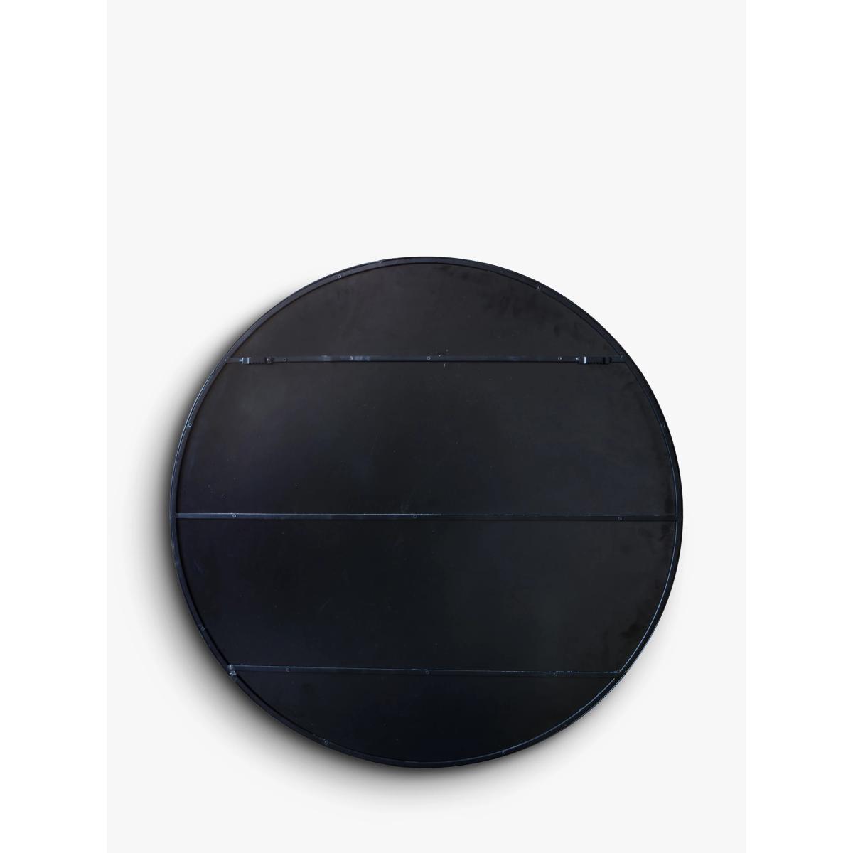 I love this round black mirror for its versatile and slightly edgy aesthetic, making it an easy addition to a variety of interiors. It works particularly well in modern or industrial spaces, where its antiqued glass finish adds subtle texture and character. When styling, consider hanging it above a console table or fireplace to create a focal point, or use it in a hallway to give the illusion of a larger space. Practical tip: pair it with matte black fixtures or accents to enhance its contemporary appeal, and consider layering it with artwork or lighting for added depth in your decor.