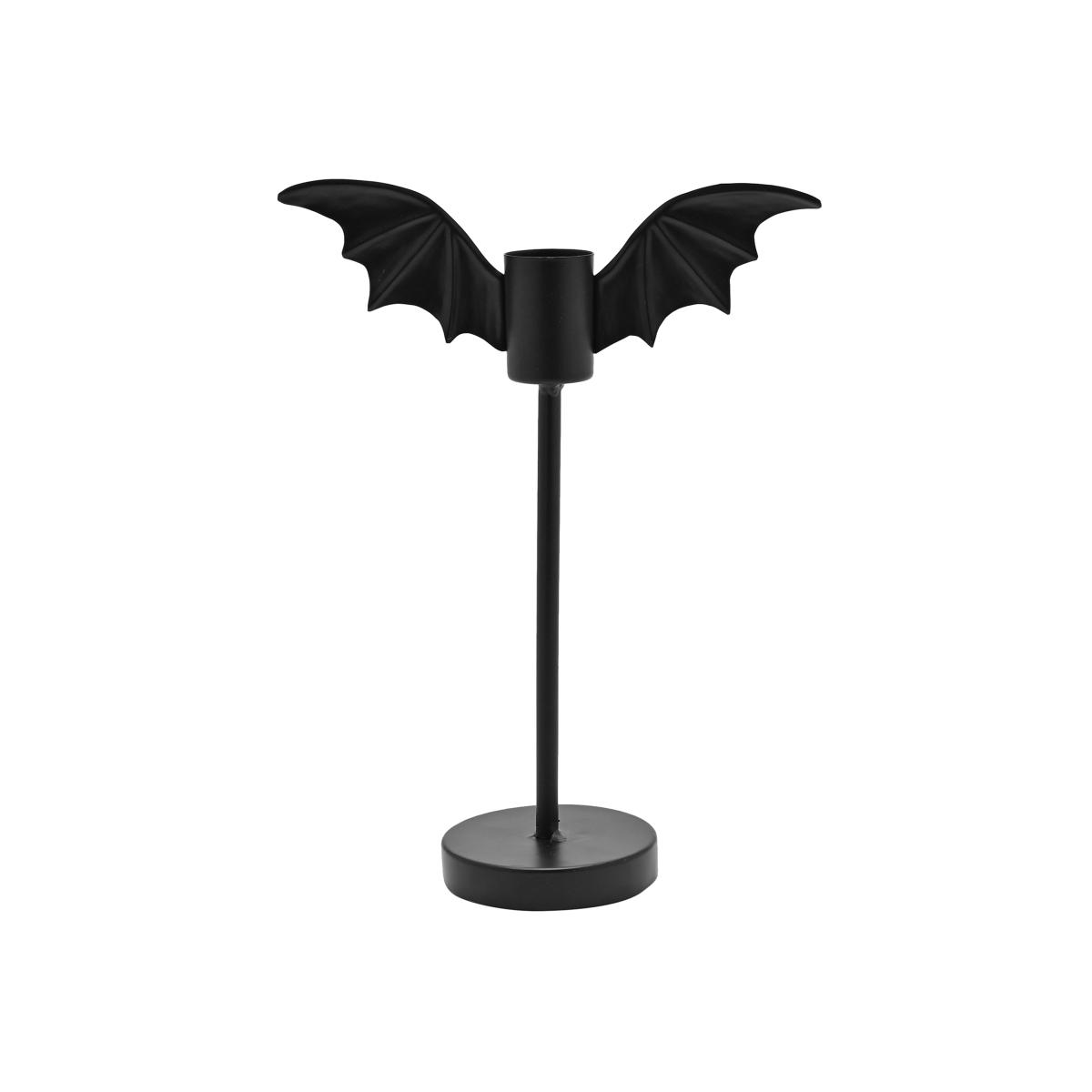 * Suitable for taper candles* Great centrepiece* Metal* Black matt finish Add a touch of gothic charm to your Halloween décor with this bat candlestick holder. Made from high-quality metal and finished in sleek matt black, it’s perfect for setting a spooky atmosphere. Suitable for taper candles.
