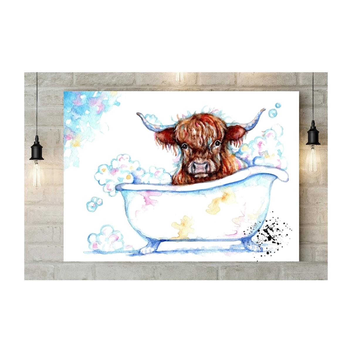 Inspired by the beauty of nature, Be Coventry originally painted this whimsical scene of a highlander in the bath in professional watercolours. Now recreated in print on a box canvas, this artwork will enhance any room in your home. The watercolour design is printed onto 260gsm Matte Polyester canvas, and attached to quality pine timber. The canvas is taped on the rear and is supplied with a wall-hanging kit.