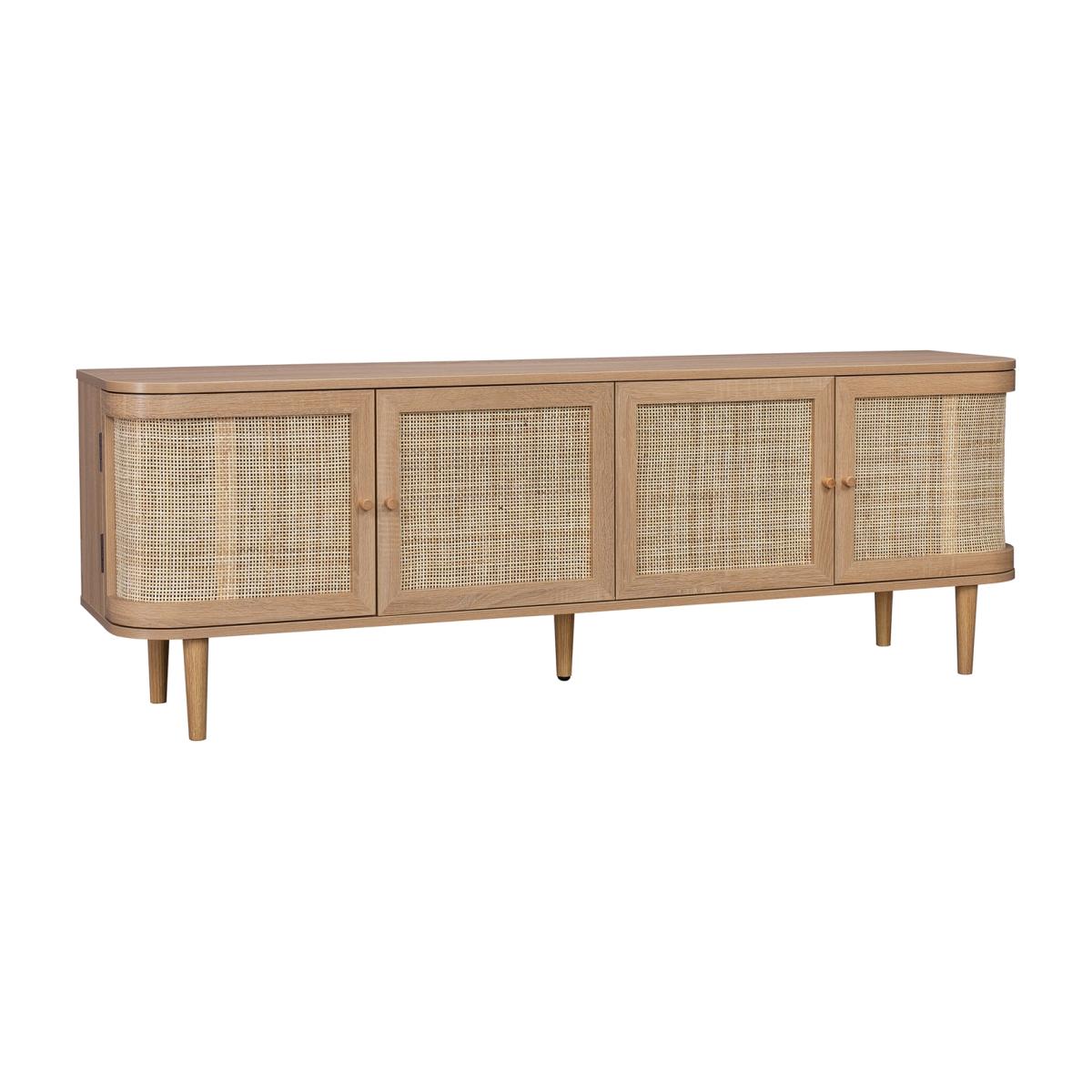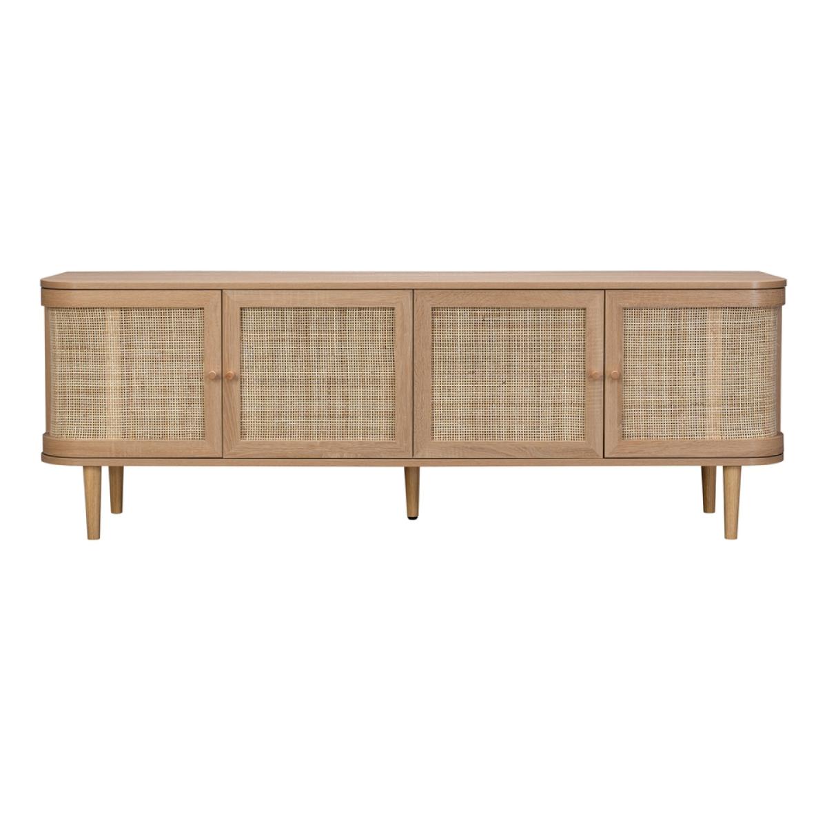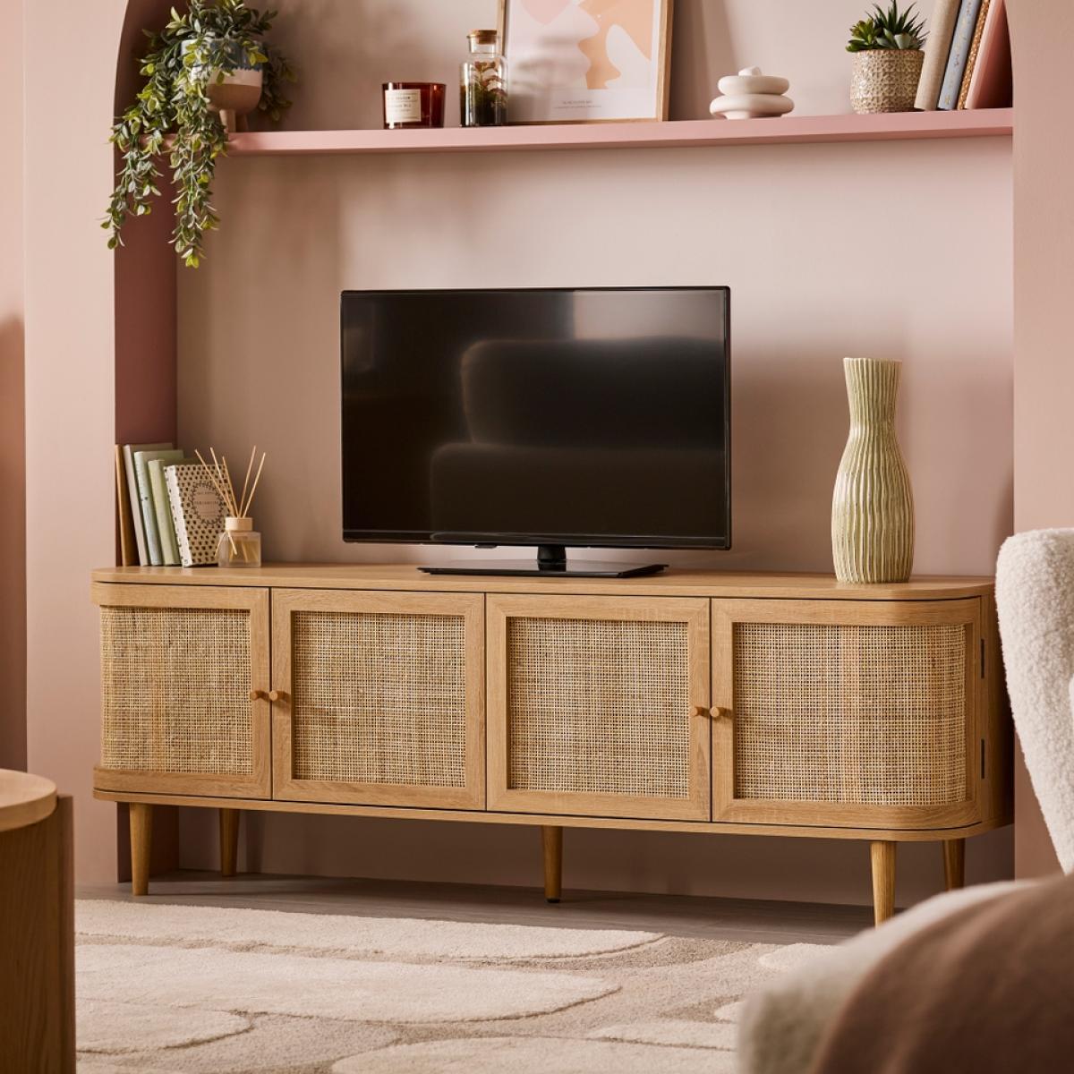 Batu is bringing retro back. Real woven cane doors and smooth, curved corners, this is a combination we can get on board with! The Batu TV stand is complete with clean lines giving it an elegant silhouette. The oak effect finish give a light minimalist feel while the rattan effect door fronts add texture and a distinctive look. The four doors hide two storage compartments that provide ample space along with two rear cable holes, allowing you to organise your media devices and cables neatly.