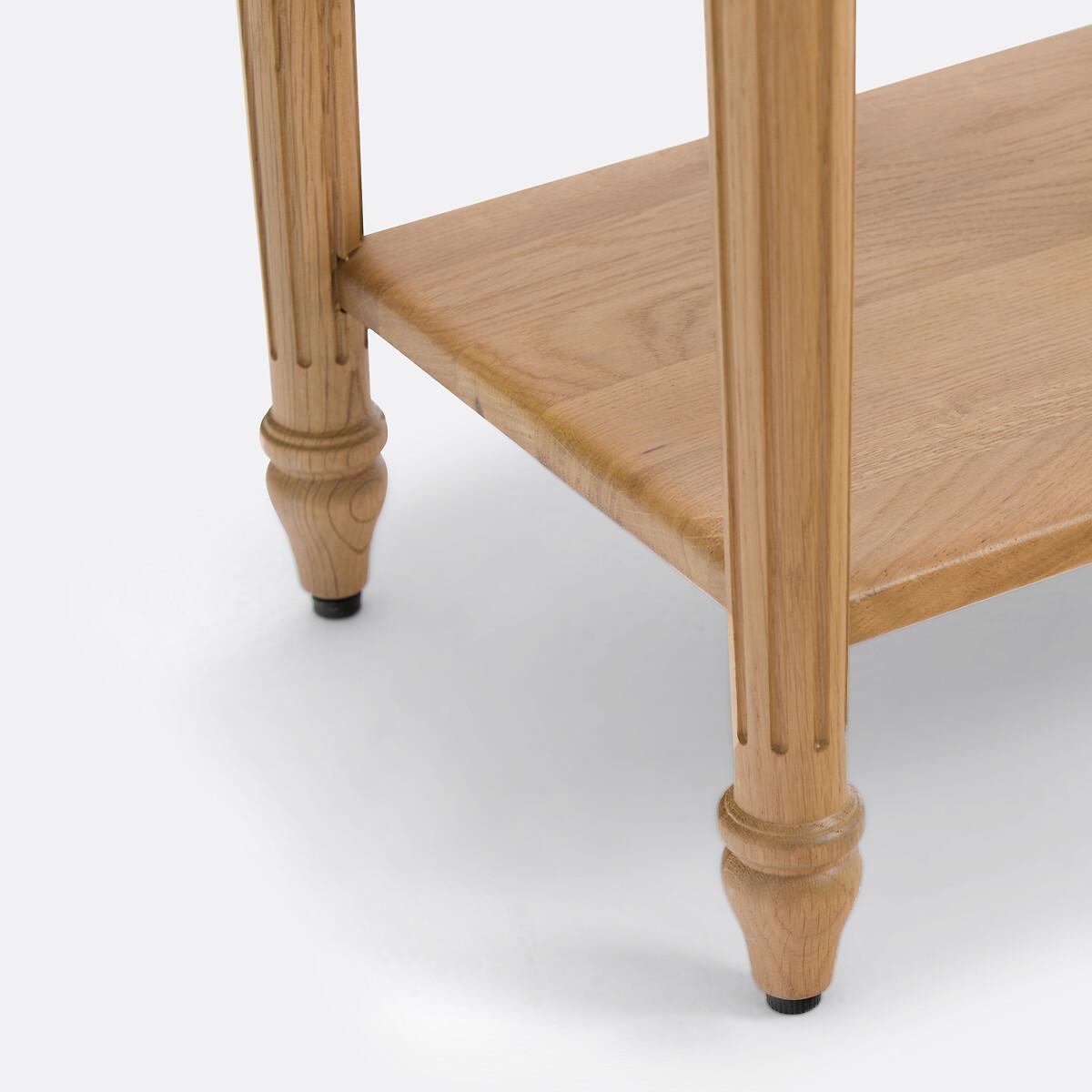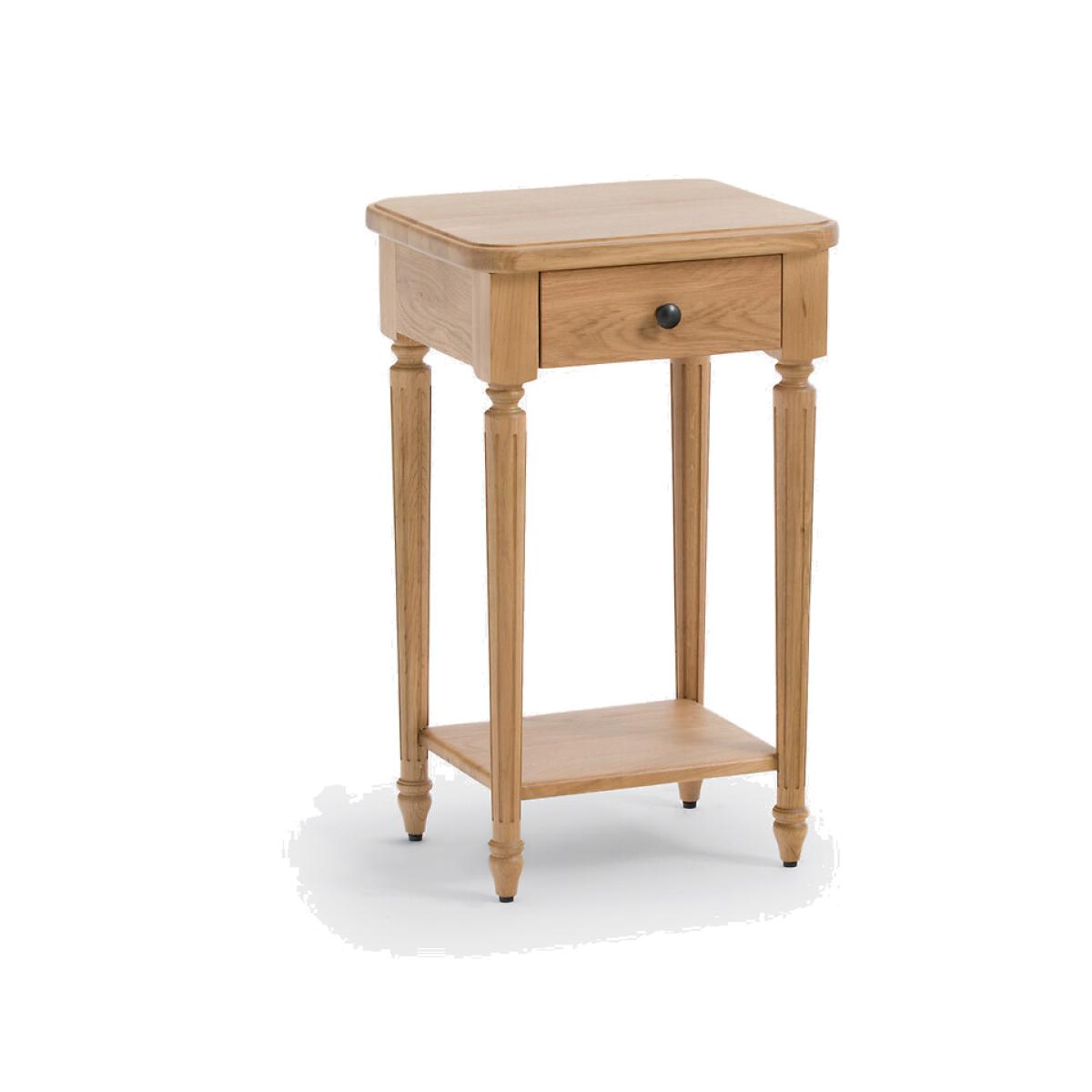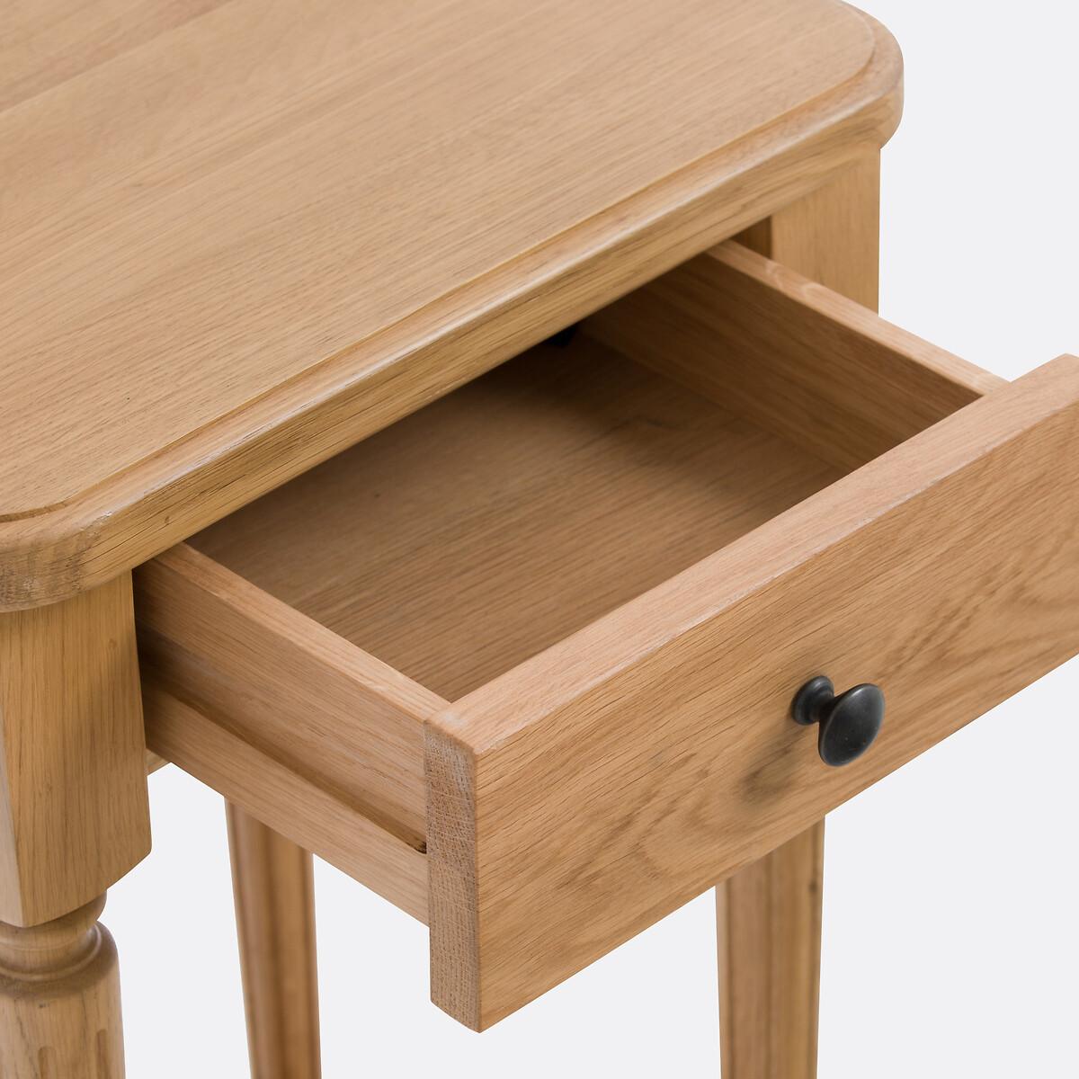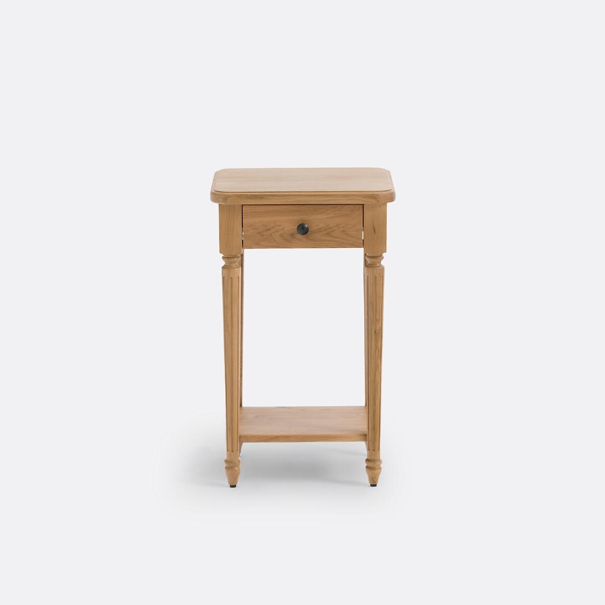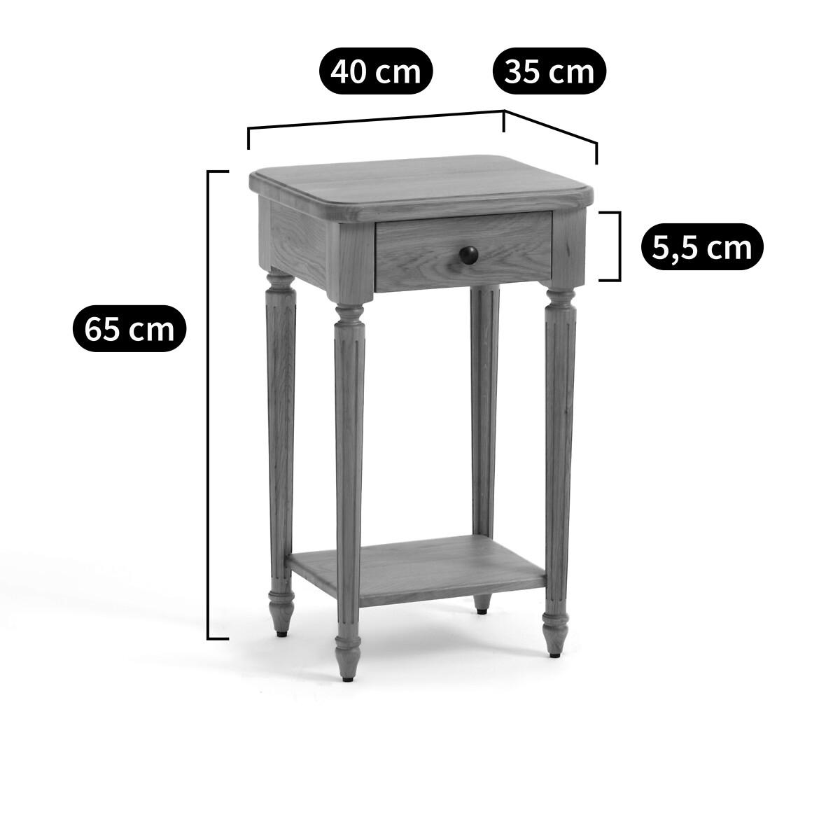 Elegant and romantic. The Baudry range, made in solid oak, is available in the style of reissued classic furniture, as if inherited from the past.. Bringing timeless charm to your home. Created by La Redoute Interiors. Product Details • Solid oak, natural colour, nitrocellulose varnish finish • 1 drawer and 1 shelf • Metal knobs • Turned legsDimensions. Overall • Width: 40cm • Height: 65cm • Depth: 35cm • Weight: 9kg. Usable space • Drawer: L21 x H5.5 x D22.5cm • Shelf : L31 x H42 x D26cm • Height of legs: 8.5cm • Sold pre-assembled. • WOOD FROM SUSTAINABLY MANAGED FORESTS. FSC® certified wood comes from forests that are environmentally, socially and economically well managed. Dimensions and weight of parcel1 parcel • L46 x H73.3 x D41cm. 11kg.