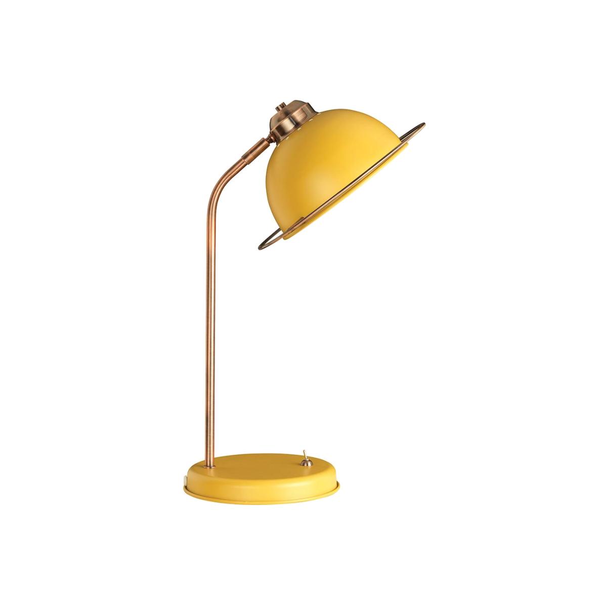 Stylish desk lamp from the Lighting and Interiors Group with a retro design. The Bauhuas Table Lamp features a yellow circular base plate with a copper stem. The stem curves at the top which supports the yellow lamp shade. A copper ring around the lamp head completes the design. The lamp head can be adjusted allowing for the light to be directed where needed. It measures 470mm in height by 300mm in diameter. Requires an ES Golfball light bulb with a maximum wattage of 28w. Lighting and Interiors Group Product Code: HOME1661.