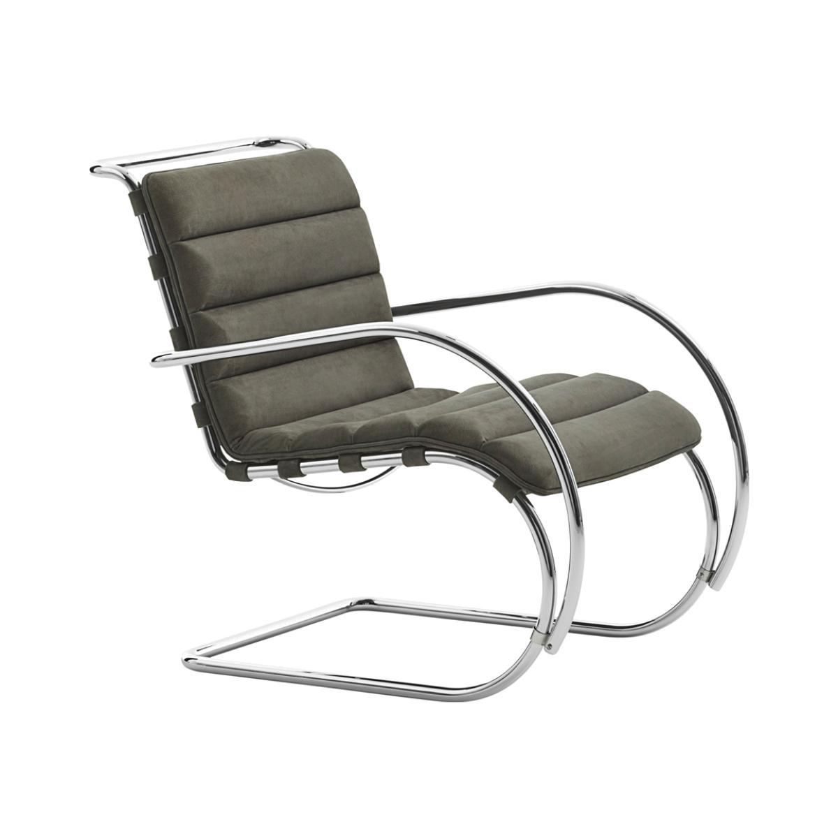 Ludwig Mies van der Rohe's MR Armchair has received an update in celebration of the centenary of the Bauhaus. Originally designed in 1929, Knoll has re-released the iconic design in a chrome and Velour suede finish. One of Mies van der Rohe's earliest steel designs, the chair boasts a strikingly contemporary silhouette that is widely considered to be a modern interpretation of traditional rocking chairs. The MR Armchair's immediately identifiable silhouette is achieved through a curved frame crafted using polished-chrome tubular steel. Available upholstered in luxurious Velour suede in a range of warm hues, the chair is padded using removable foam cushions and finished with leather-covered structural straps in either black, white beige or dark brown to match your upholstery choice.