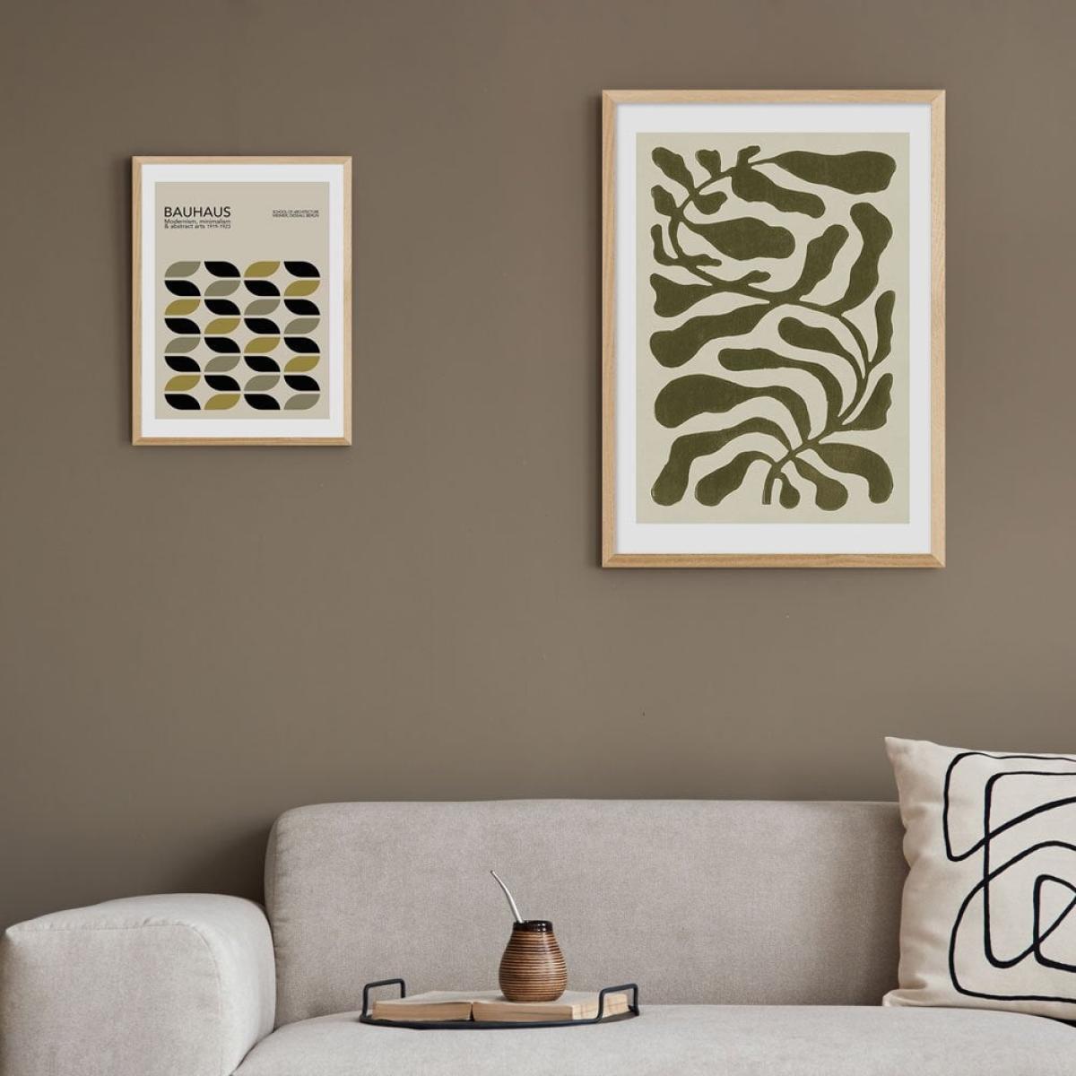 Inspired by the Bauhaus, this cool geometric design in muted green hues is made to conquer your home. Perfect for hallways and living rooms, this print is the ideal retro addition that will match any mid-century and modern homes. Only giclée printing processes are used for this print resulting in the highest quality museum-level colours and sharpness. Choose between a number of different coloured frames and three sizes for the perfect print for your space.