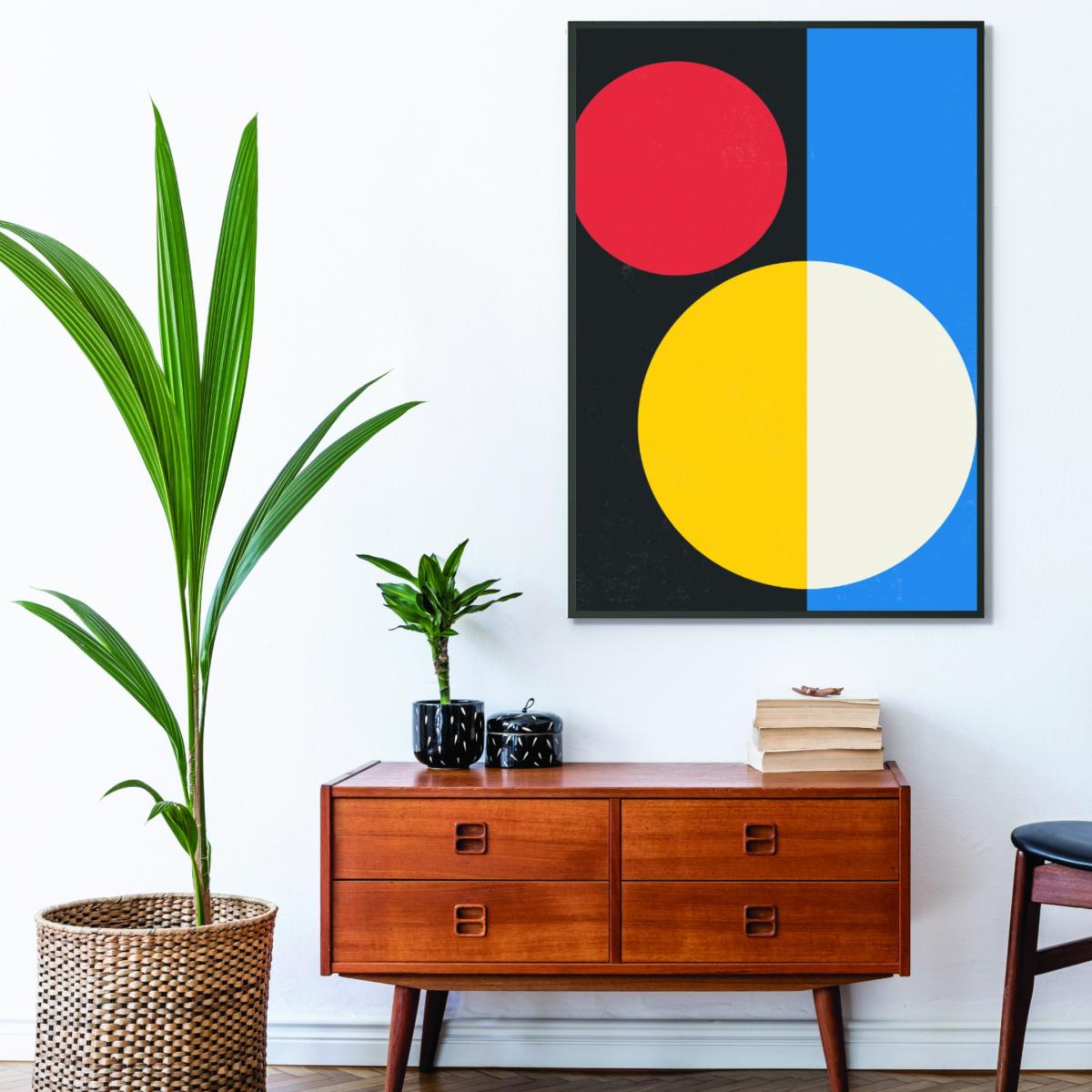 The Bauhaus Vibe Series #3 is a striking piece that works brilliantly in modern and eclectic interiors. Its bold geometric shapes and primary colours make it a versatile statement, especially suited for spaces that embrace minimalism or mid-century modern aesthetics. I love how it adds an artistic punch without overwhelming a room; it’s perfect for a feature wall in a living room or above a console table in an entryway. When styling, consider pairing it with simple, understated furnishings to let the artwork take centre stage, or team it with vintage pieces to create a cohesive retro-modern vibe. Its large size makes it ideal for filling sizeable wall space, making it a focal point that grounds the room with its colour and shape.