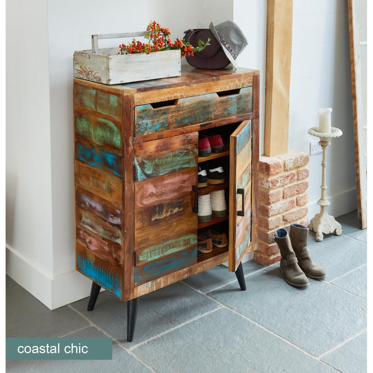 I love this beachy little shoe cupboard for its relaxed, coastal vibe and colourful distressed finish-it's perfect for adding a touch of laid-back charm to an entryway or hallway. It works well in interiors that embrace a vintage, bohemian, or eclectic style, providing both function and style in one piece. Practical styling tips include keeping small accessories like umbrellas or keys in the top trays, while the cupboard space is ideal for storing everyday footwear out of sight. Pair it with woven baskets, rustic mirrors, or natural textures to enhance its seaside feel, making it a versatile yet breezy addition to any home.
