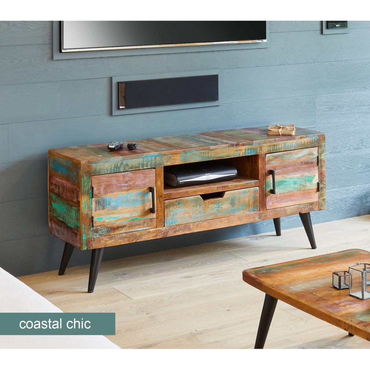 I love this media unit for its relaxed coastal vibe combined with practical design - it's perfect for adding a touch of casual elegance to various interiors. It works beautifully in beach-inspired or Scandinavian-style settings, where natural materials and muted tones are key. When styling, consider keeping accessories minimal and light - perhaps some maritime-themed decor or simple ceramics - to emphasise its coastal charm. Its spacious top surface provides great flexibility for enhancing with decorative lamps, greenery or picture frames, while the open middle shelf is ideal for electronic devices or media accessories. The tapered legs add a nod to retro design, making it versatile enough to sit comfortably alongside both modern and vintage-inspired interiors.