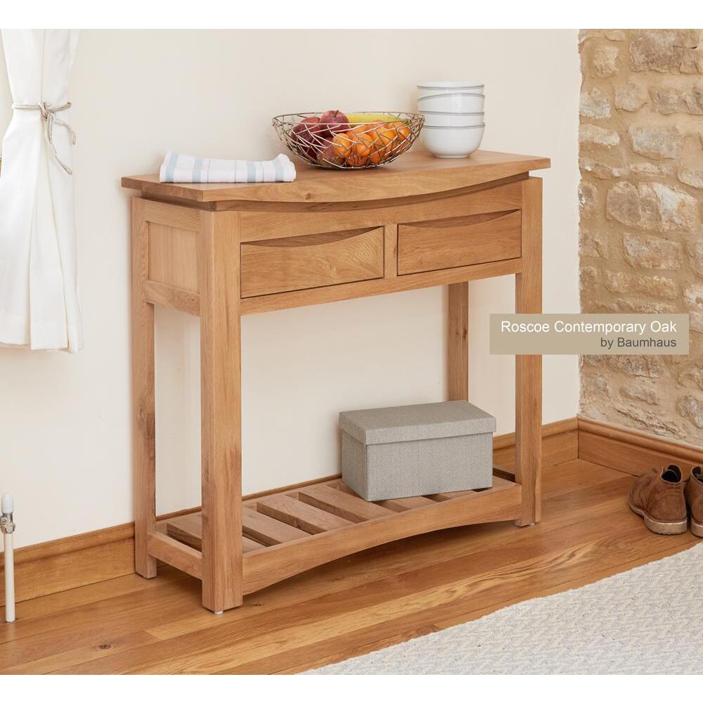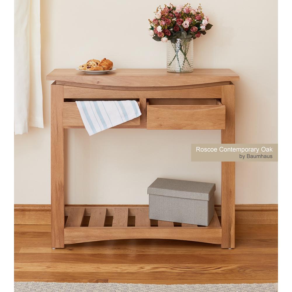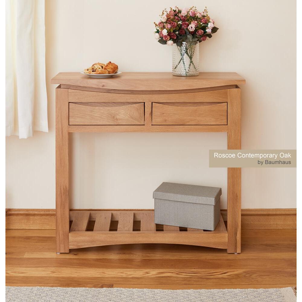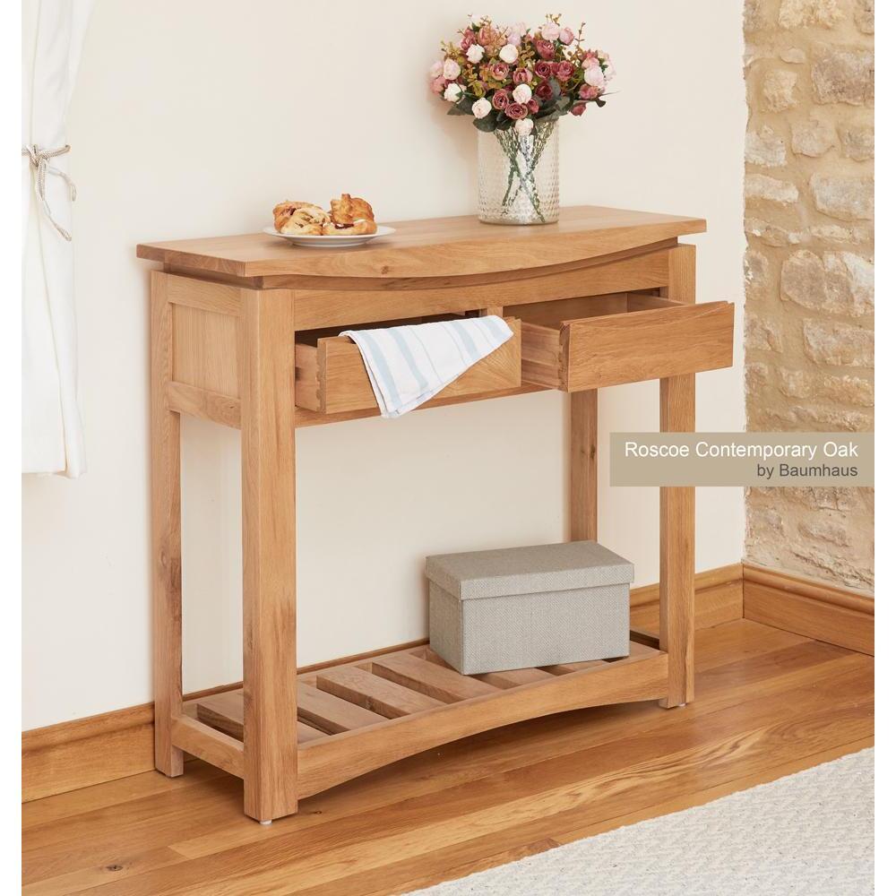 A superb solid oak console with two drawers. Crafted from solid oak and with a lovely, eye-catching design, the Roscoe range will add timeless elegance to your home. Finished in a resilient, clear satin lacquer to enhance the natural beauty of the wood while offering protection. The overall dimensions of the console table are H77.5 x W87 x D28 cm. Two drawers and a large open shelf offer useful storage. The internal dimensions of the two drawers are H8 x W31 x D19 cm. Built to the highest standard with dovetailed joints on drawers and tongue and groove backs. Exceptional build quality, designed to last a lifetime. No veneers are used. This is a solidly constructed piece; no assembly is required. Heavy duty packaging. Can be mixed and matched with the rest of the Roscoe Solid Oak Range.