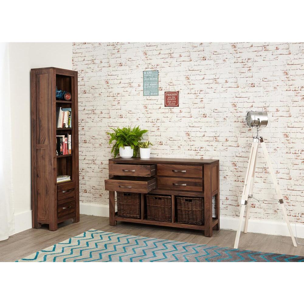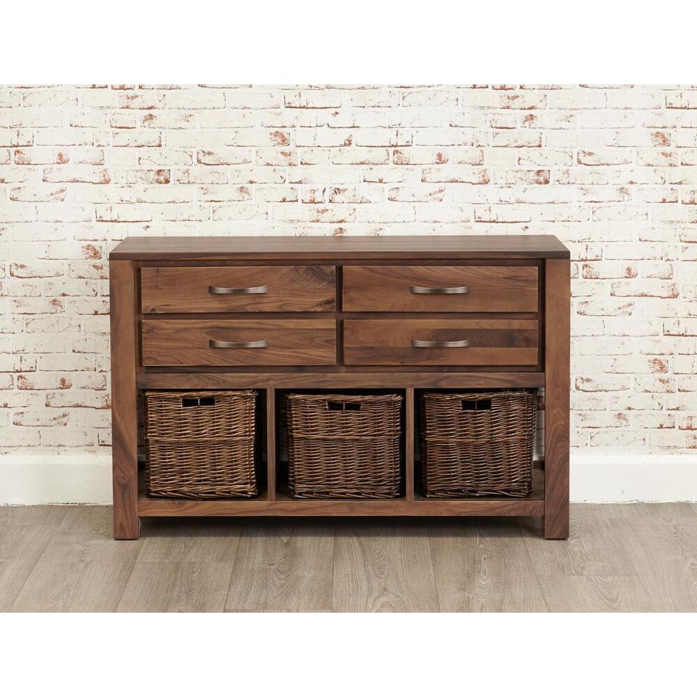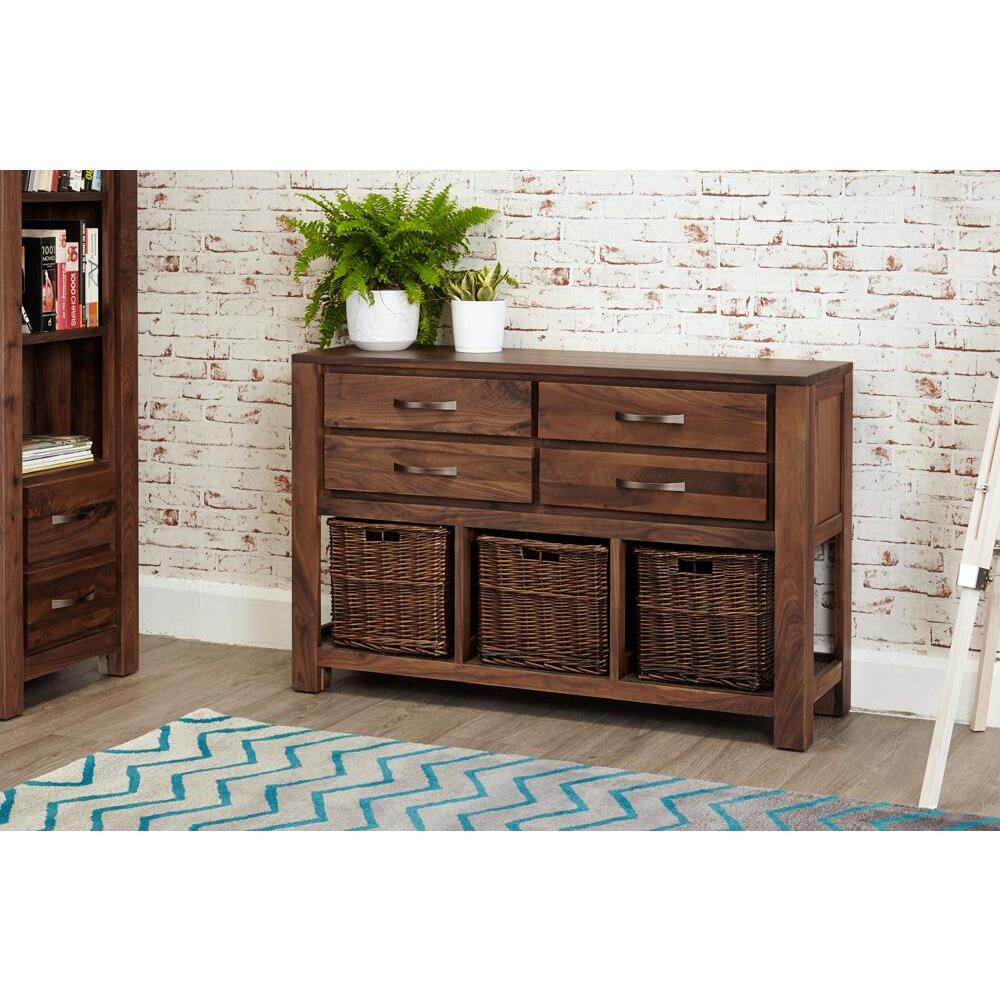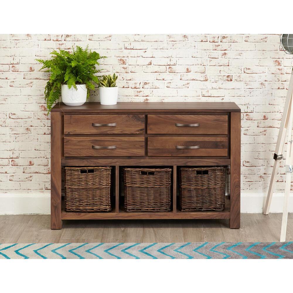 Superb four drawer walnut console table. Constructed using solid walnut. Walnut is a very high quality timber with a dense grain, this makes it the perfect choice for building stunning and unique furniture. This stylish four drawer console table provides great storage space within its three large wicker baskets. The overall dimensions of the console table are H76 x W120 x D35 cm. Internal measurements of each drawer are H9 x W47 X 25 cm. The overall dimensions each basket are H33 x W33 x D27 cm. Crafted from the highest grade selected solid walnut. Exceptional build quality - designed to last a lifetime. Fully dovetailed drawers. Stylish antiqued bronze handles. Resilient satin lacquer finish. This is a solid piece of furniture and no assembly is required. Heavy duty packaging. Part of our Baumhaus Mayan furniture collection.