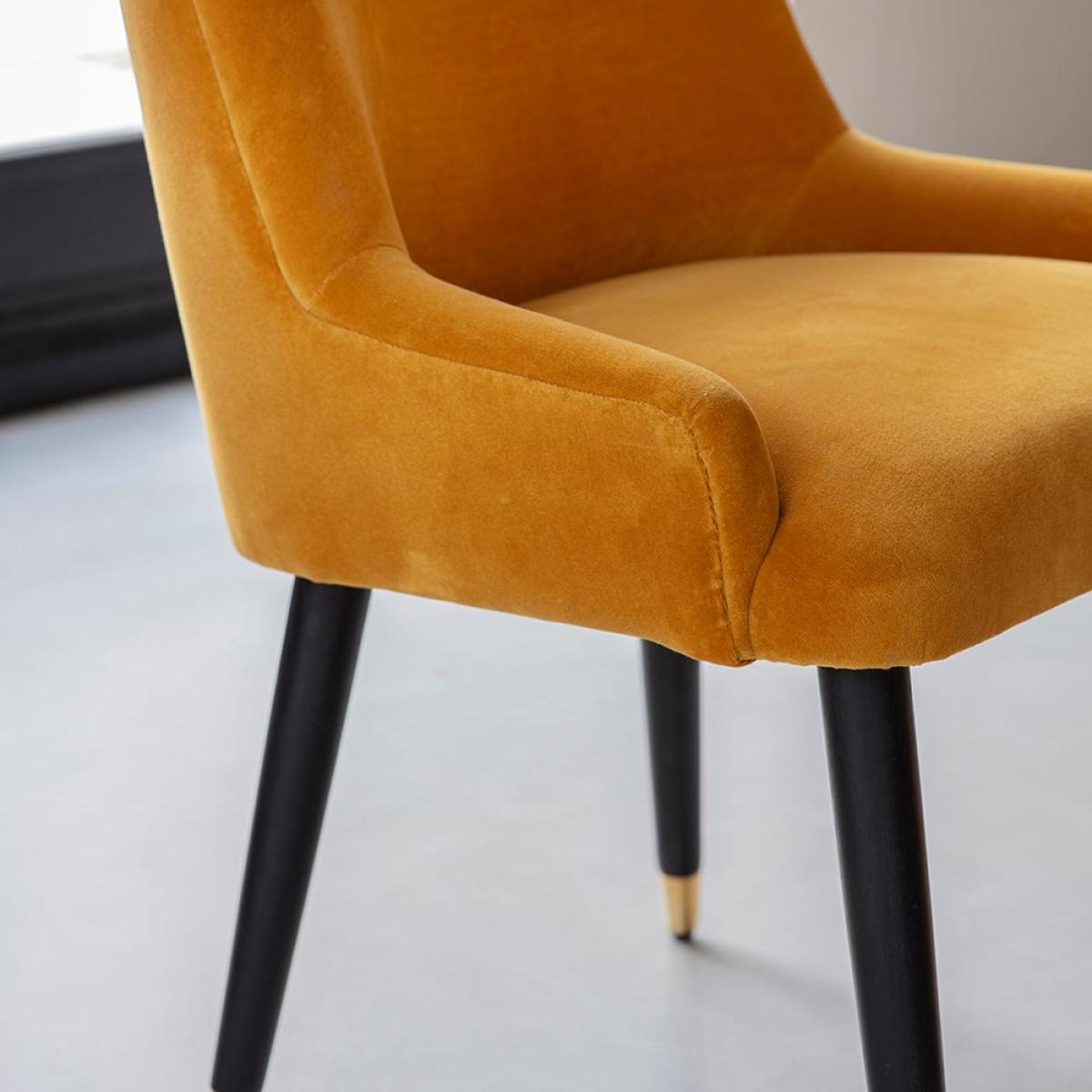 Dine in comfort and style with our Baxter Velvet Dining Chair in Amber Yellow. Luxurious in both design and feel, this amber yellow dining chair is expertly upholstered in luxurious cotton velvet with black stained solid wooden tapered legs with classic brass cap detail. Taking its inspiration from mid-century style, this yellow velvet dining chair has a generously sized seat pad and full back rest for excellent back support while feet gliders protect floors from scuffs and marks. The yellow velvet colourway is bold and distinctive and pairs beautifully with any of our dining table designs.