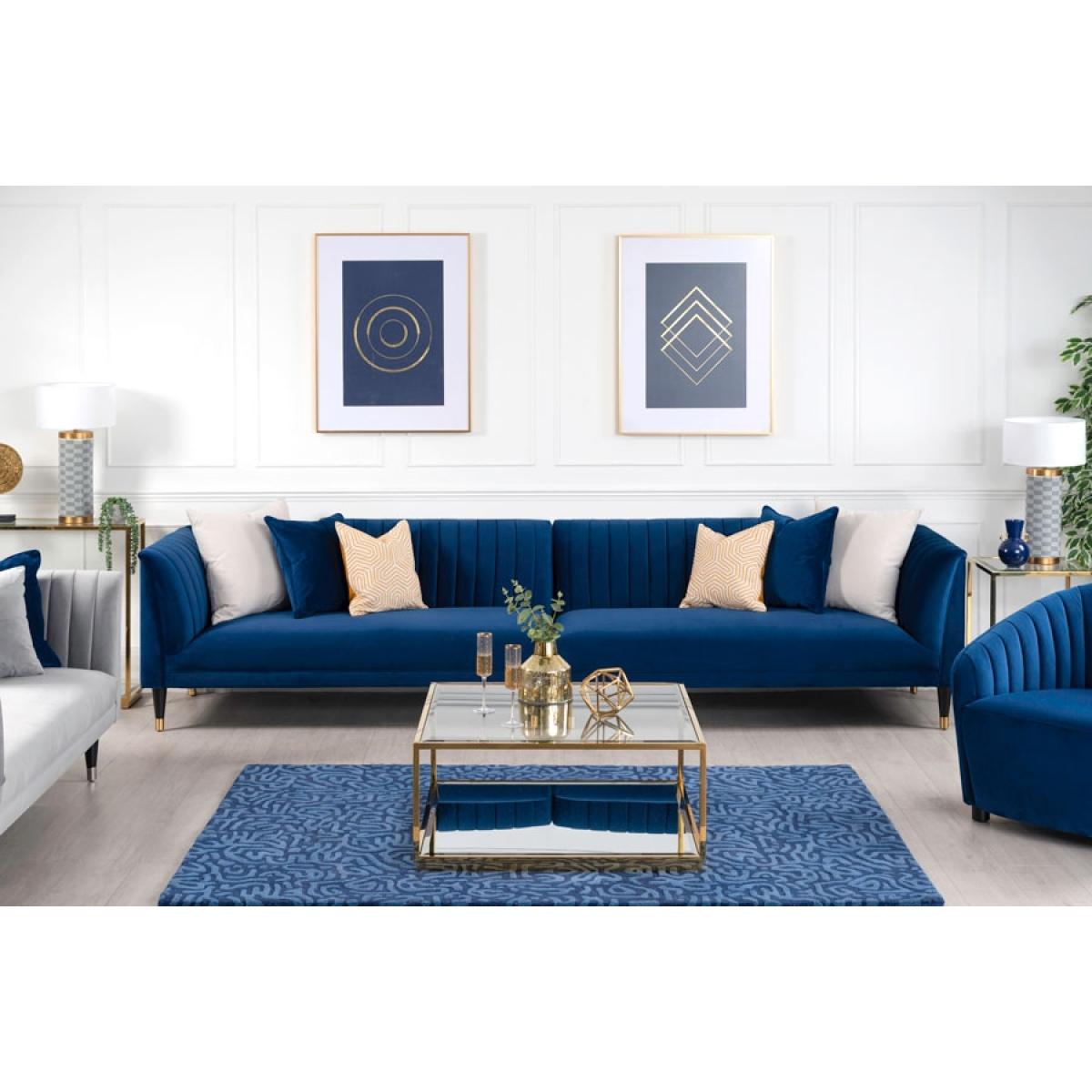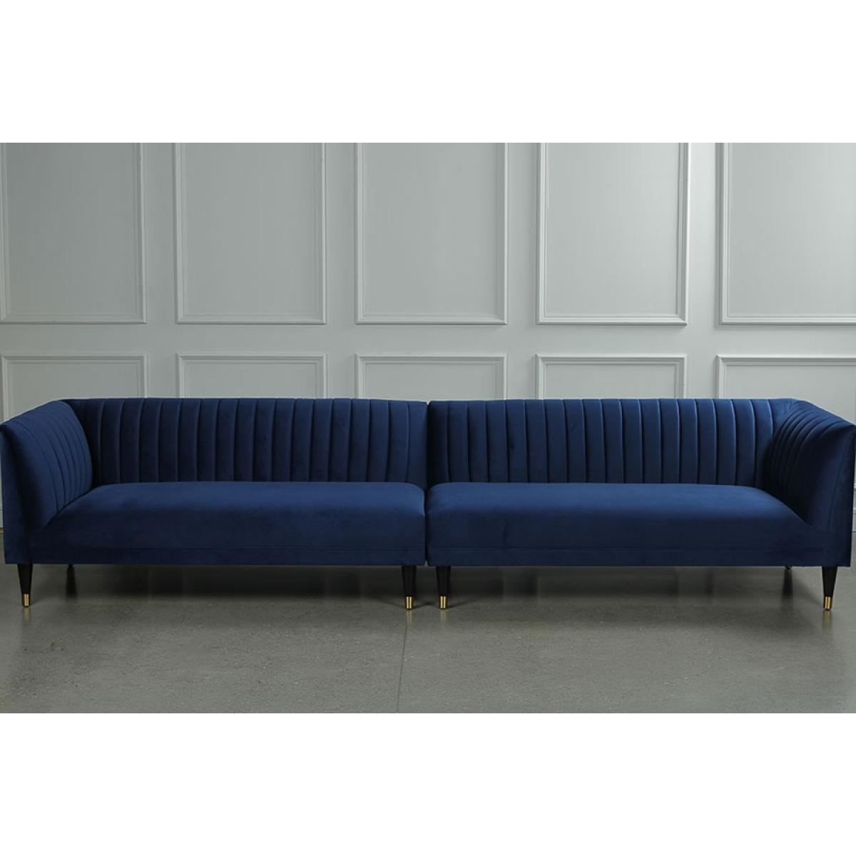 Handsome large scale sofa inspired by highly collectable Mid-Century American furniture. Fluted upholstery. Solid oak legs with dark brown polished finish and brass ferrules. Comfortable foam and fibre seat with sprung base. Velvet upholstery fabric. Supplied in two parts for ease of transport and installation. In the unlikely event that you are dissatisfied with your sofa let us know (within 7 days) and we will happily collect it and fully refund you , including the return shipping cost.