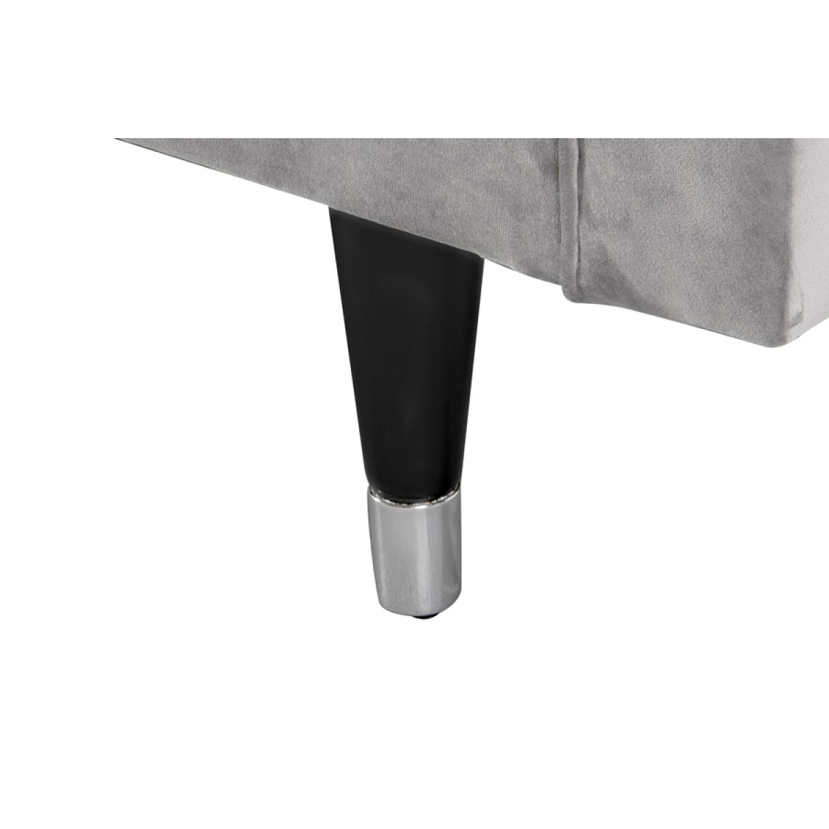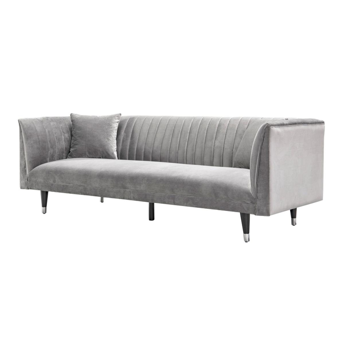 An extremely handsome three seat sofa inspired by highly collectable Mid-Century American furniture. Fluted upholstery. Solid oak legs with black polished finish and chrome plated ferrules. Comfortable foam and fibre seat with sprung base. Velvet upholstery fabric. Scatter cushions included. Delivered assembled.