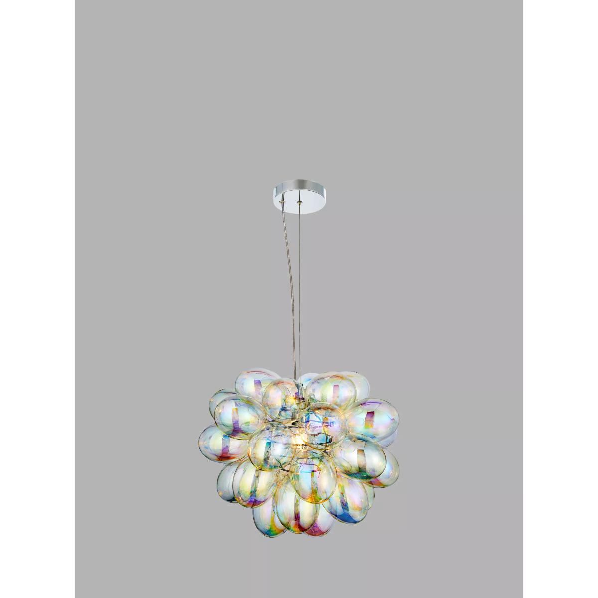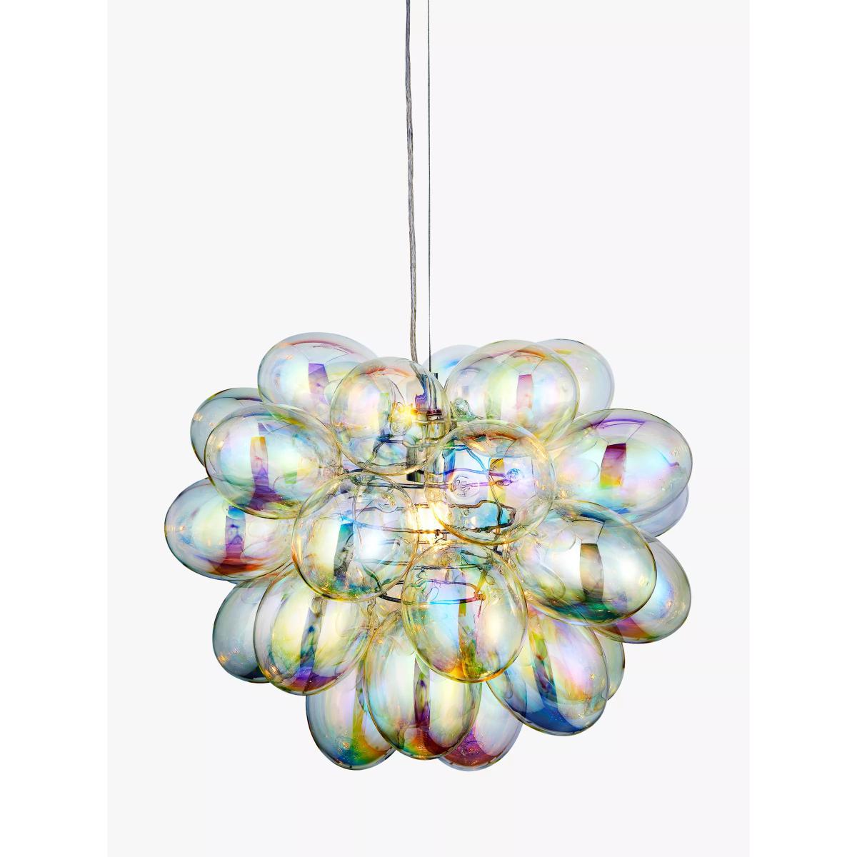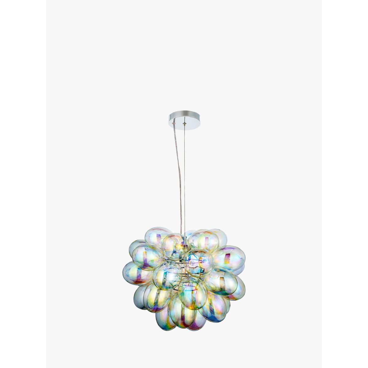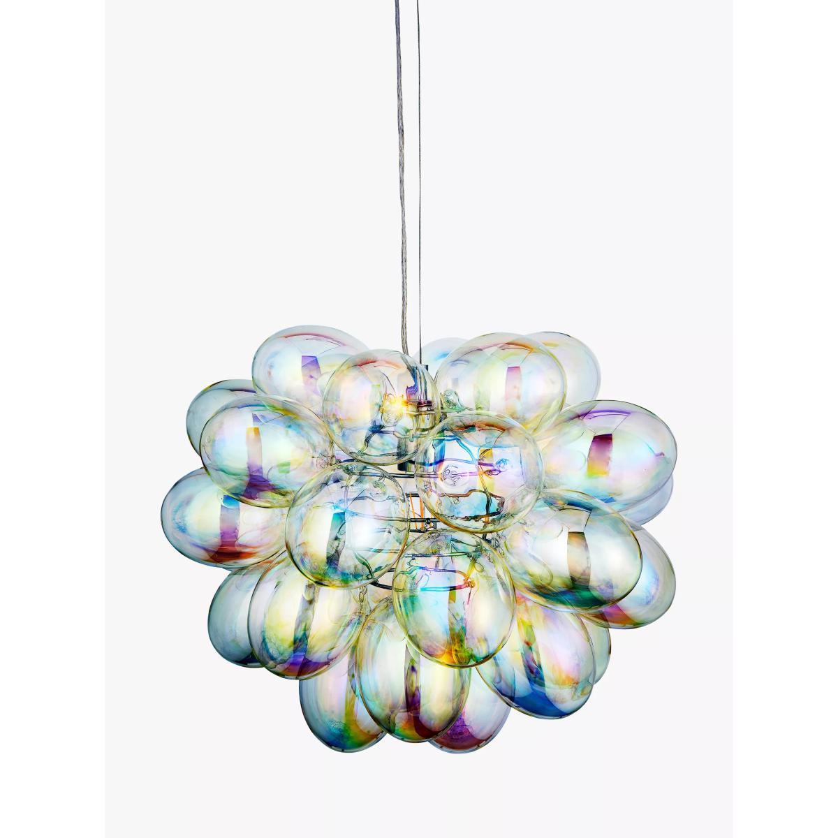 Made from a constellation of iridescent glass shades, this ceiling light will draw the eye in your home. It offers a warm glow of light with subtle shades of colour visible when illuminated. It's suspended from a height-adjustable wire cable and clear flex, and it's complemented with chrome-plated metal.