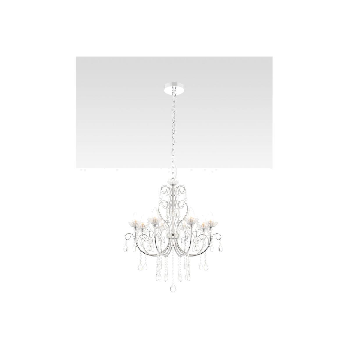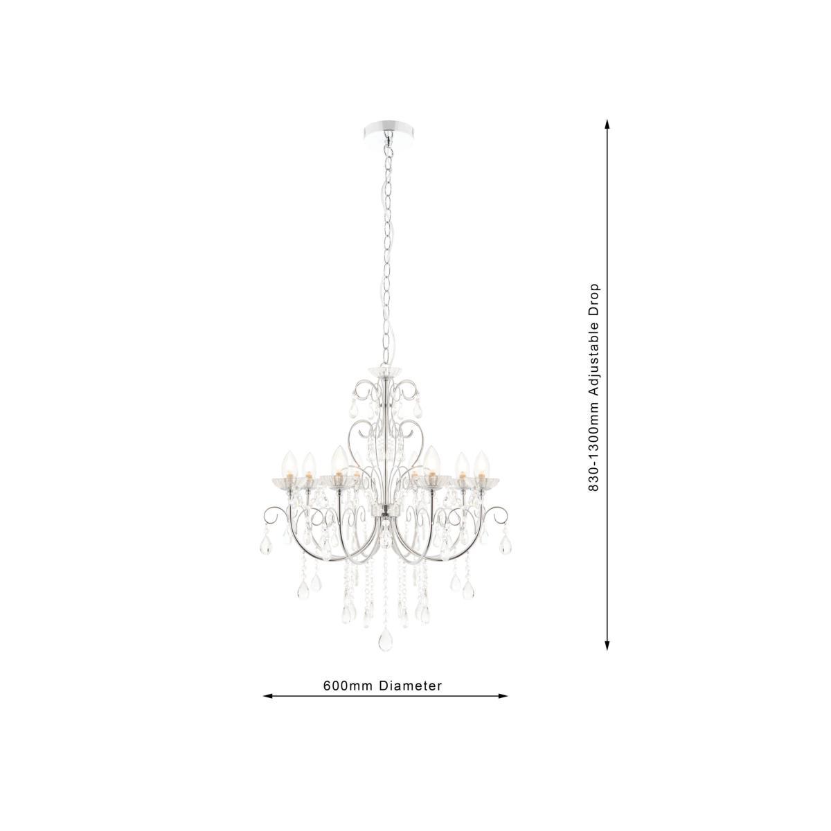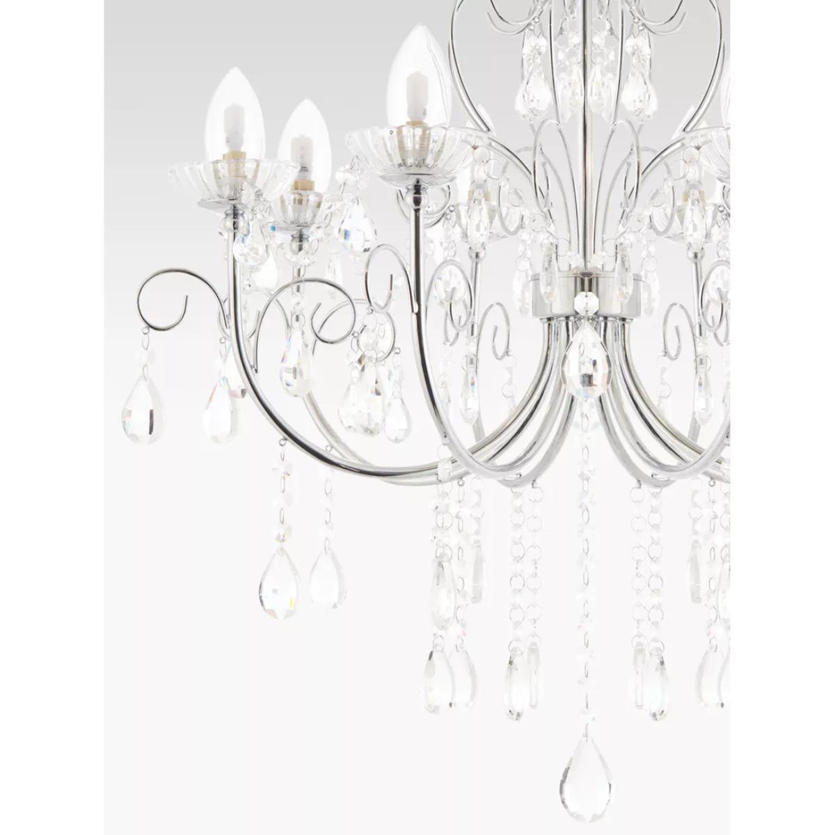 This classic ceiling light features crystal glass droplets and a sculpted, polished chrome frame that accommodates eight bulbs. Suspended from a height-adjustable cable, it provides a functional light output around your space and the IP44 rating means it can also be installed in your bathroom.
