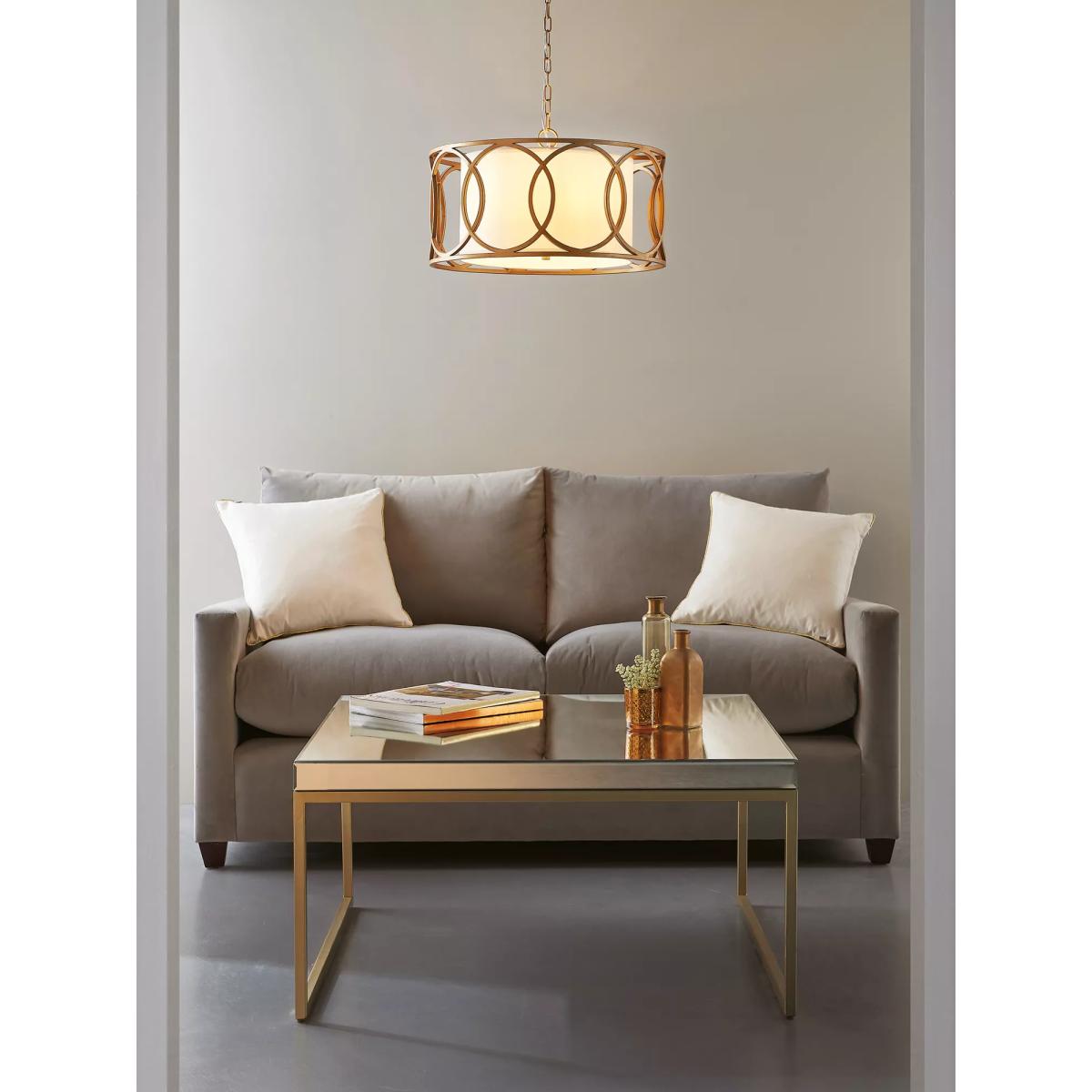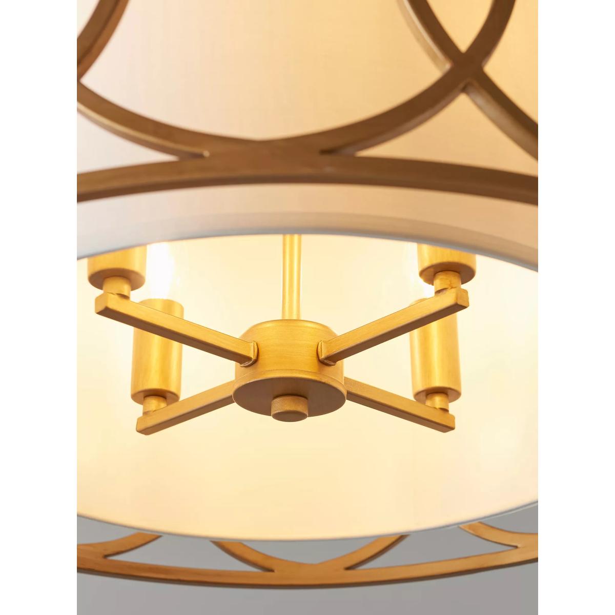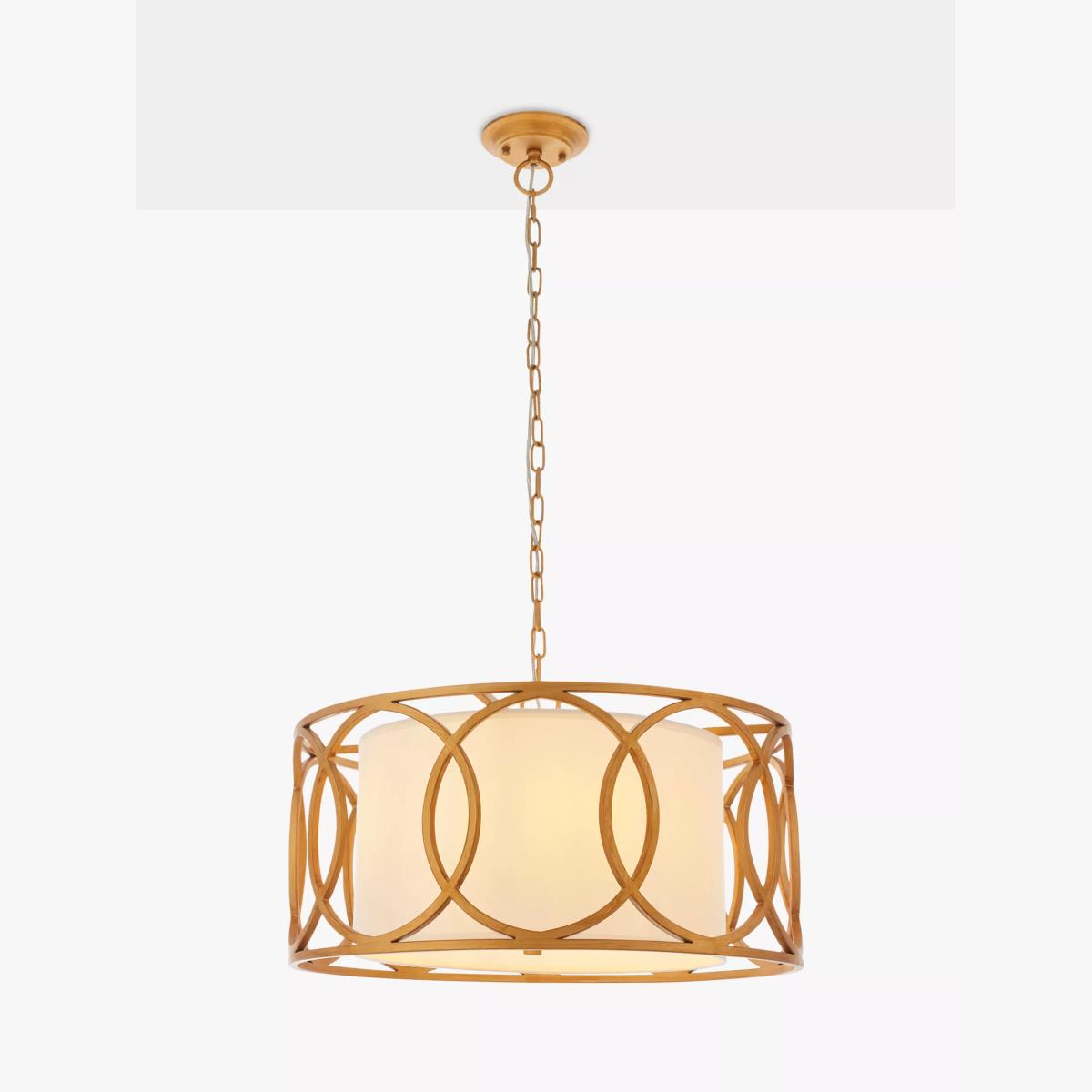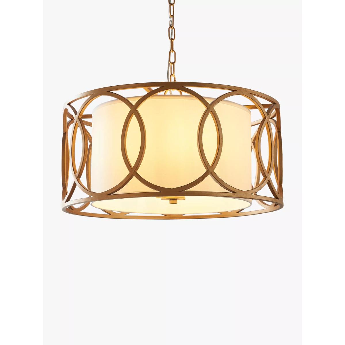 Mix modern styling with a classic shade and discover a new elegant pendant for your home. This ceiling light showcases brushed gold metal work with a matching finish inside, giving space for four bulbs. The cylindrical shade adds warmth to this light, allowing it to suit both traditional and modern interiors.