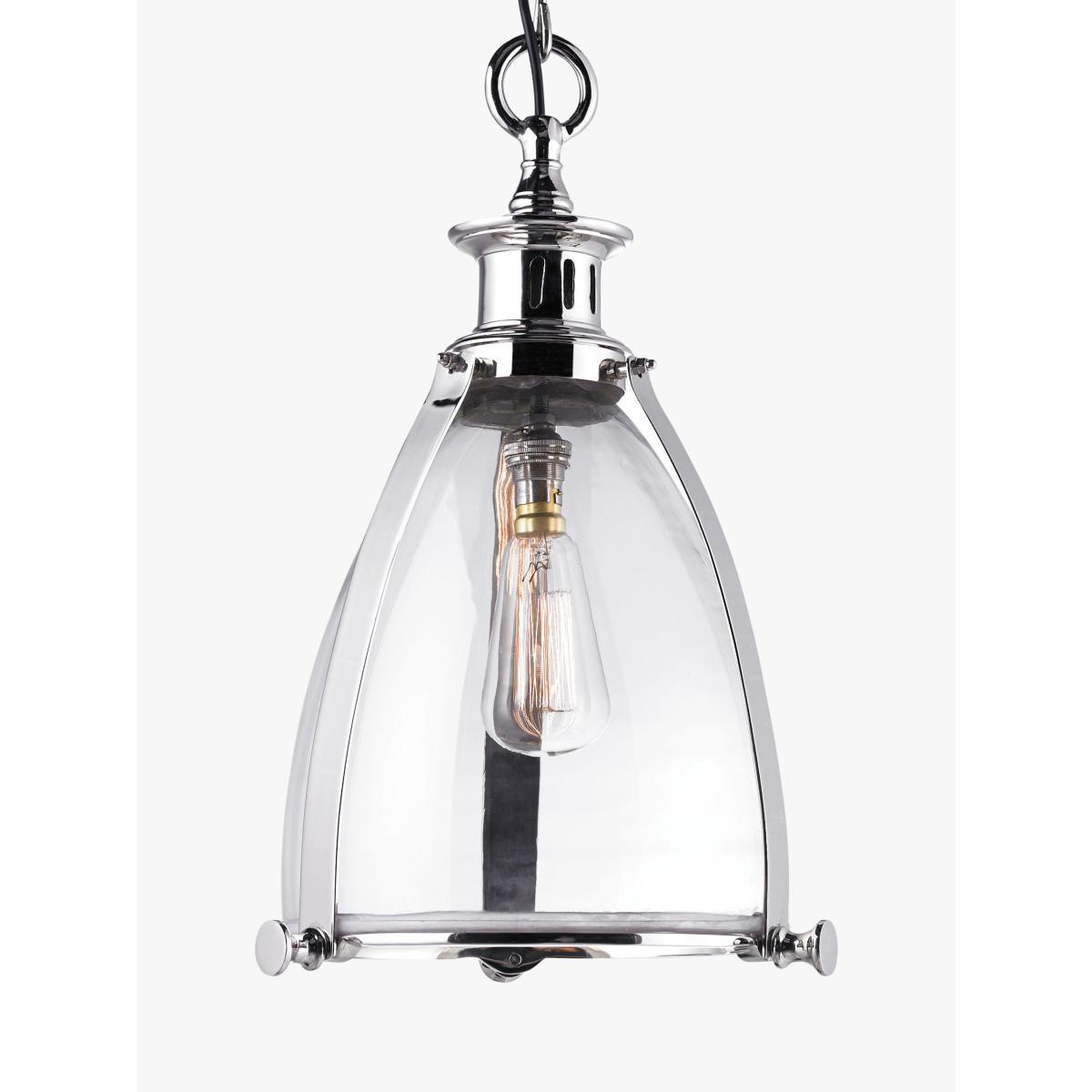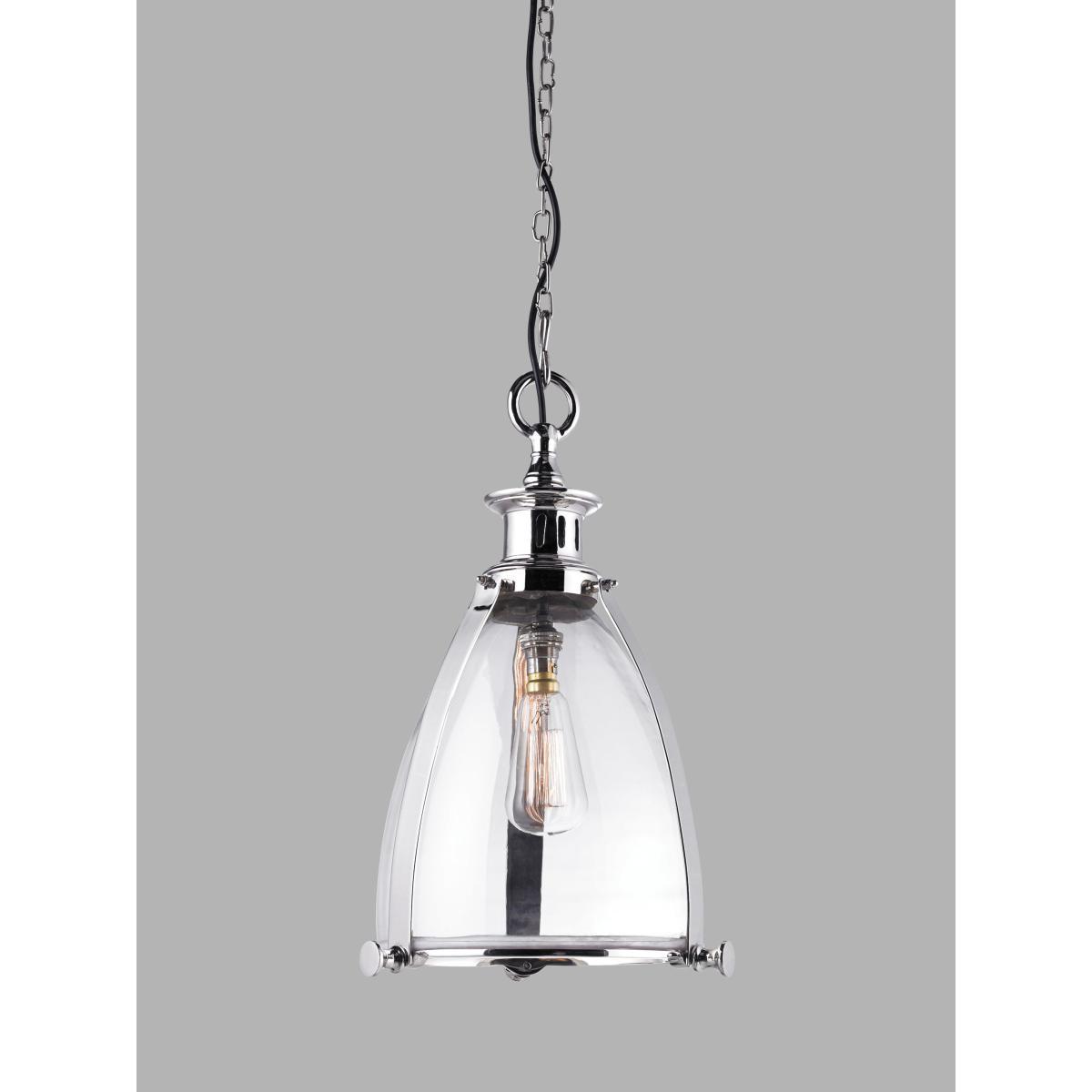 A timeless glass pendant in this larger size, framed by metal banding in a smart polished finish. Suspended from a height-adjustable chain. Choose an LED bulb with a decorative filament for an eye-catching look.