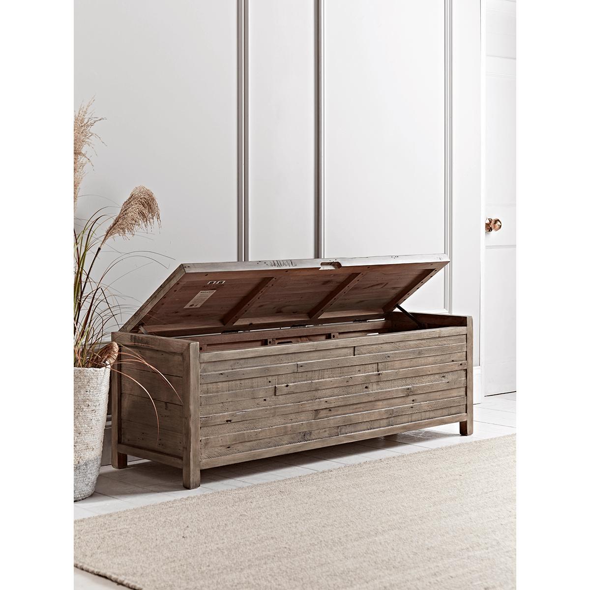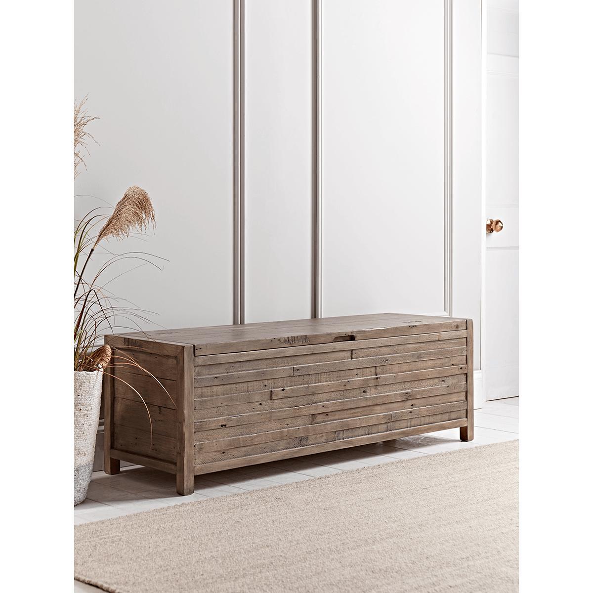 Our Bay collection is handcrafted from solid reclaimed wood timbers which in their nature are wonderfully characterful. With a unique patina and grain, each carefully placed piece appears to have its own story to tell. Here our Bay Storage Bench offers ample storage, raised upon four feet and within a hinged lid. Charm washes over this piece with its genuine aged appearance, subtle marks and variations, to make this a unique and functional addition to your room.