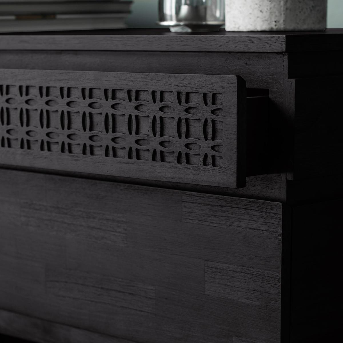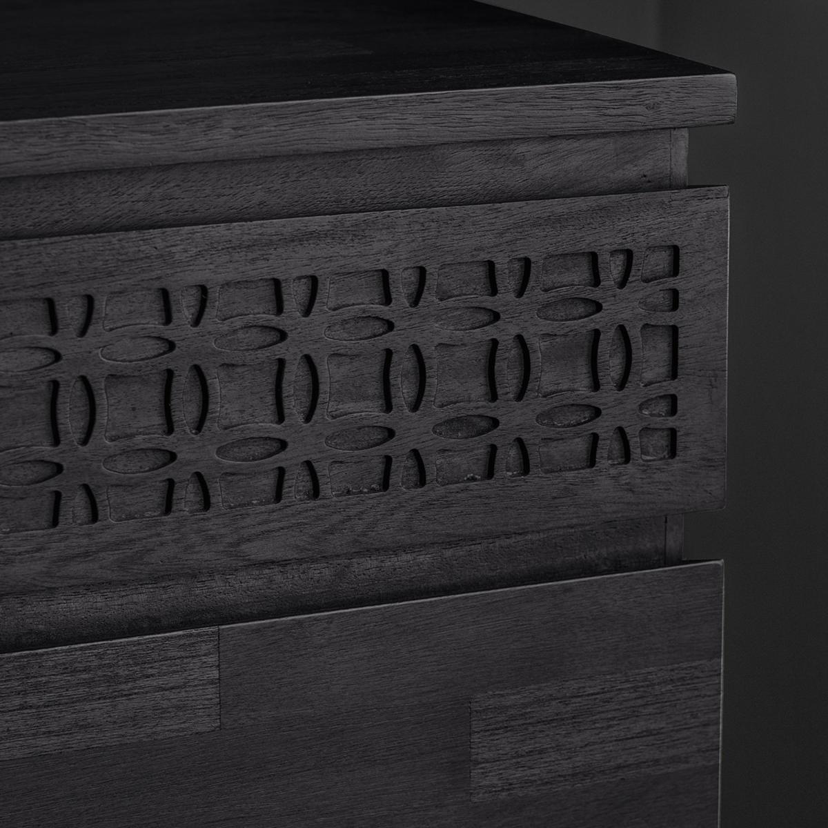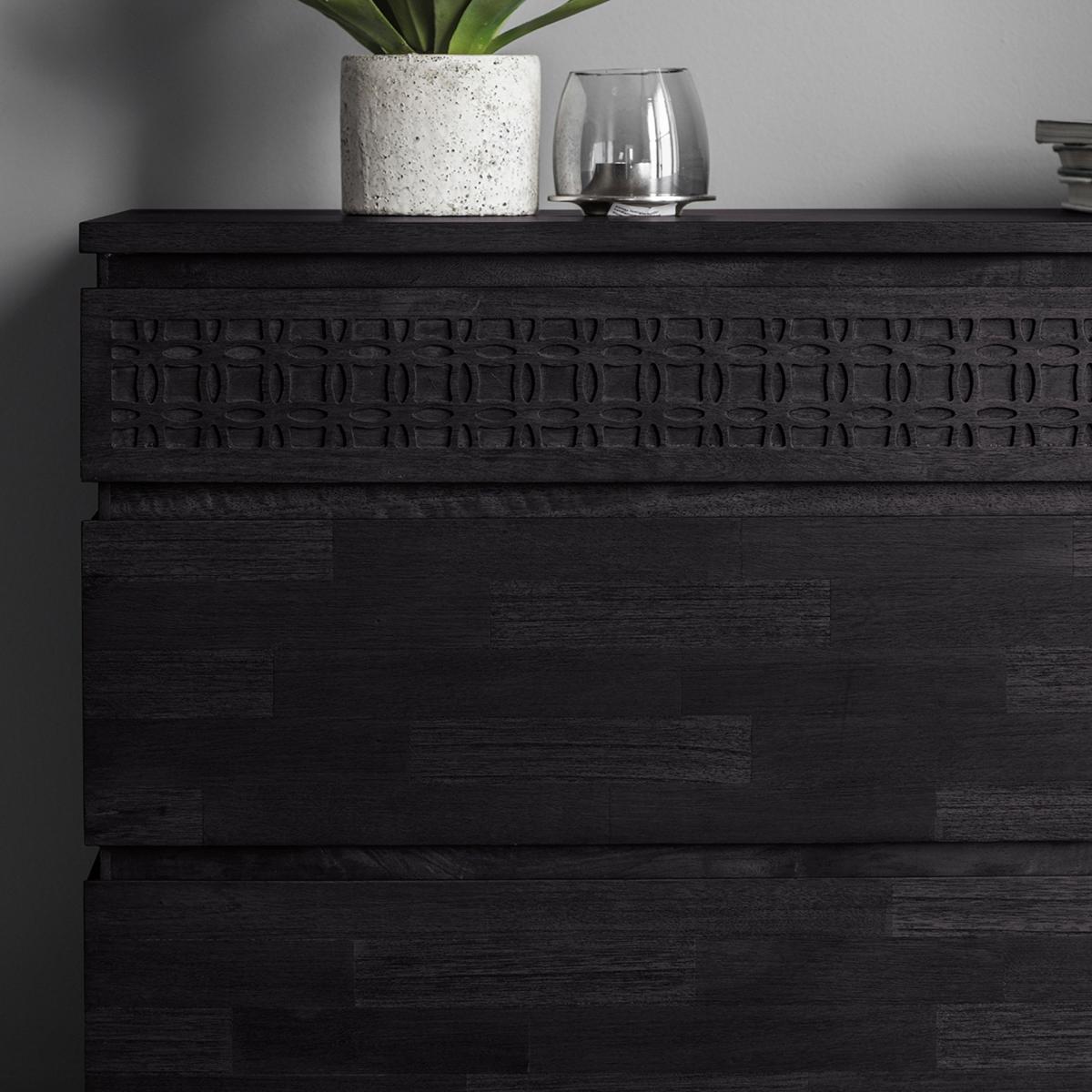 * Inlaid pattern which stands out* Can be mixed with modern or classic pieces in an eclectic living space* The chest features a patterned frieze of blind fret work along the front of the top drawer, made from solid mango wood. * It has a stunning matt black charcoal finish* Offering a global traveller look that has an intricate design detail* 4 Drawers The Baytown Boutique 4 Drawer Chest features an inlaid pattern that stands out, offering a unique addition to eclectic living spaces. The chest showcases a patterned frieze of blind fretwork made from solid mango wood, coupled with a stunning matt black charcoal finish, creating a global traveller look enriched with intricate design details across its four drawers.