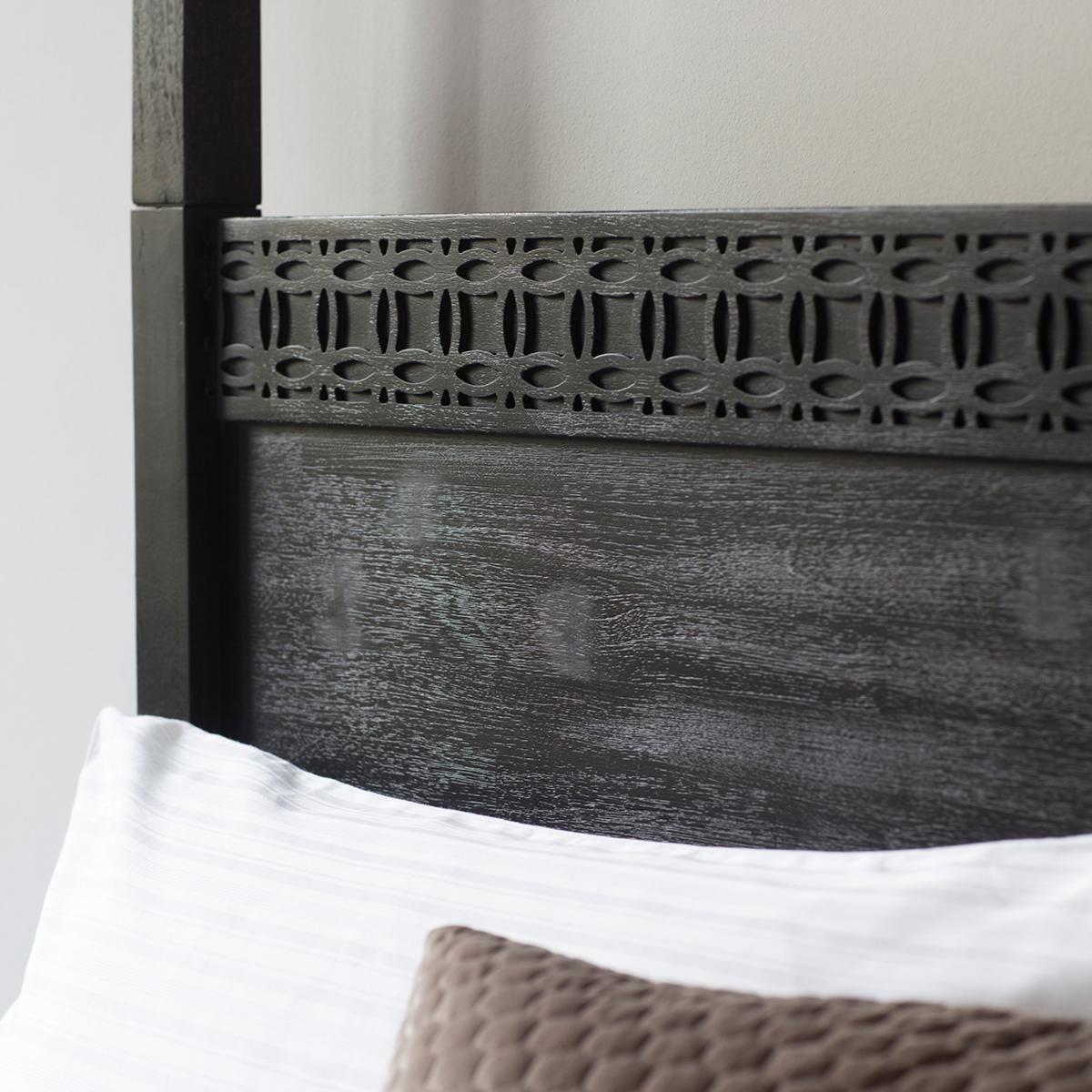 * Inlaid pattern which stands out* Can be mixed with modern or classic pieces in an eclectic living space* 4 Poster bed* Matt black charcoal finish* Offering a global traveller look* Different sizes available This Baytown Boutique 4 Poster Bed boasts an inlaid pattern that captures attention, making it a versatile choice to complement modern or classic pieces in an eclectic living space. The 4 Poster bed features a stunning matt black charcoal finish, offering a global traveller look with a hint of intricate design detail. Explore the different sizes available to bring a touch of sophistication to your bedroom.
