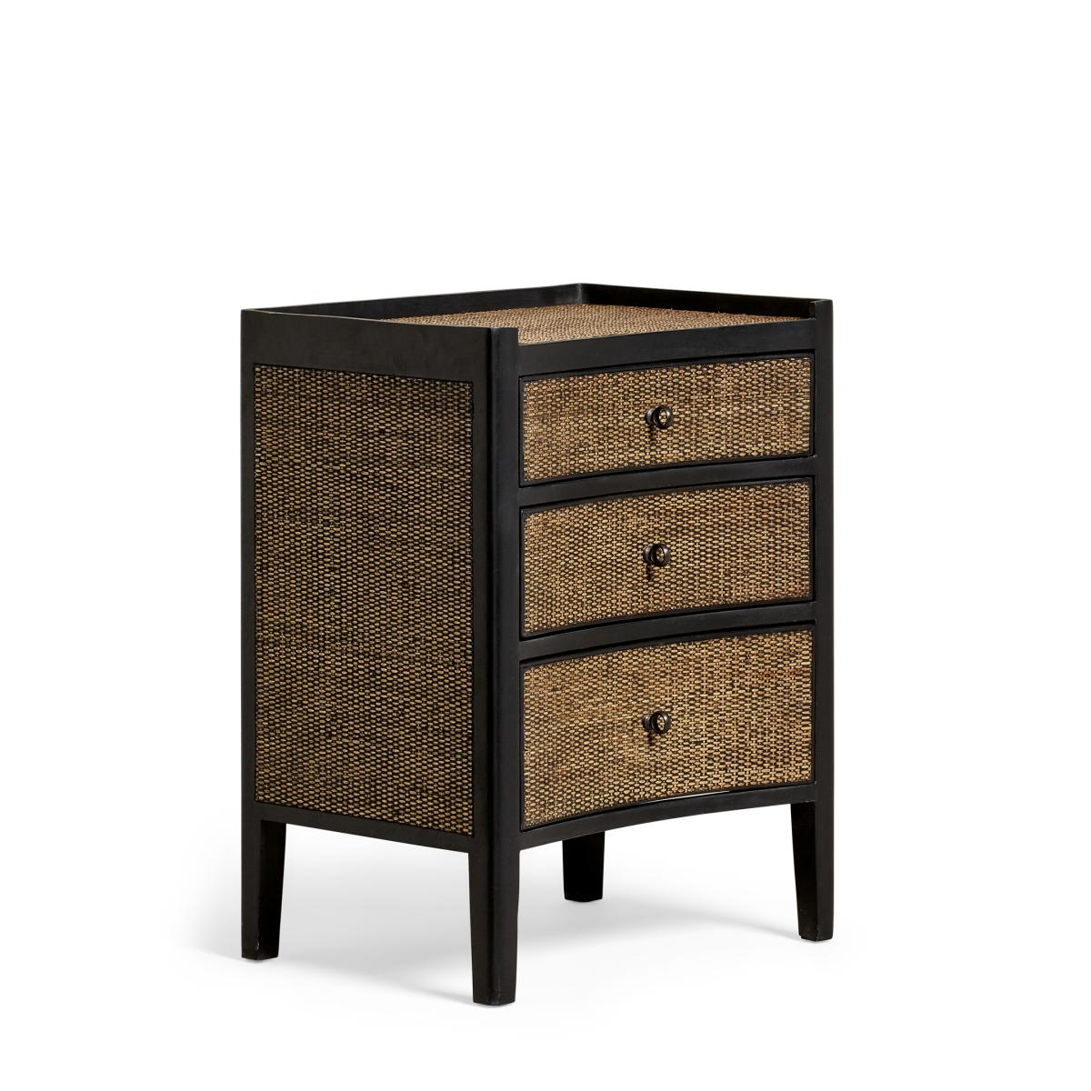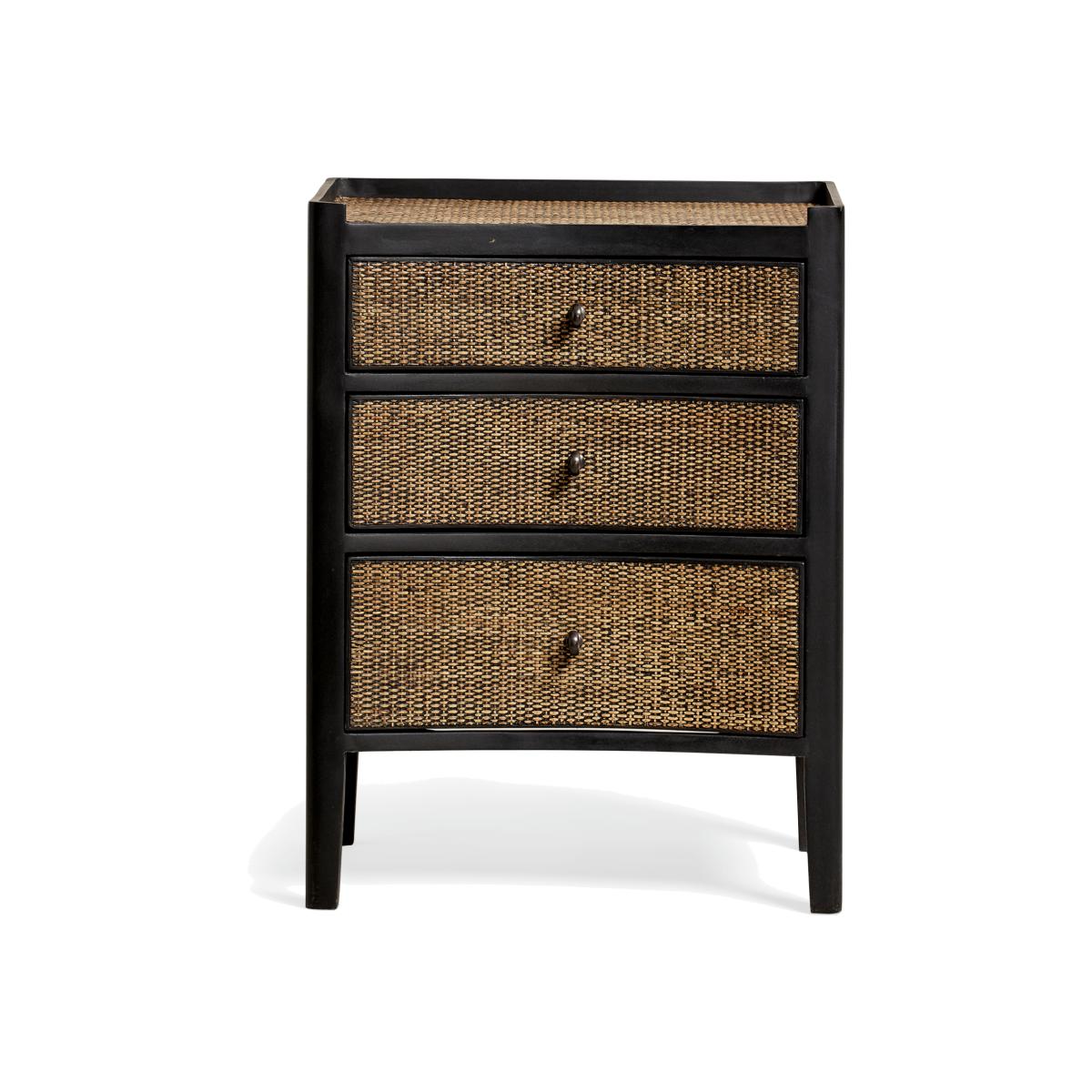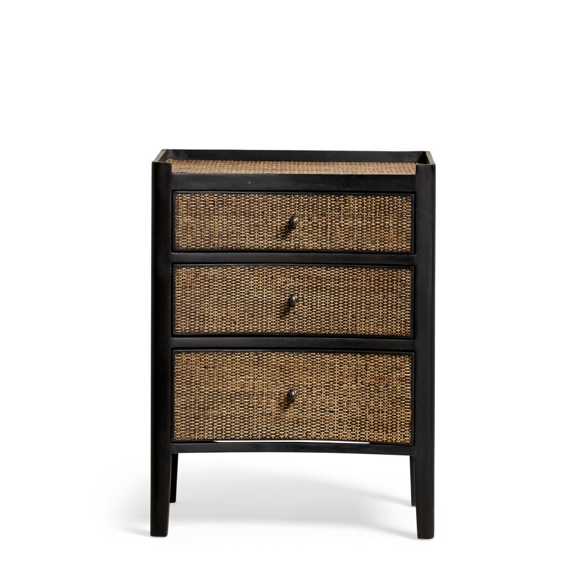 I love this small ebony chest of drawers for its sleek, contemporary design with a hint of natural texture from the woven rattan drawers. It works particularly well in modern, boho, or eclectic interiors, adding warmth and a bit of visual interest without overwhelming the space. Practical tips include styling it as a bedside unit in bedrooms or using it in living areas for additional storage while keeping the look uncluttered. Pairing it with matte black or brass accents and minimalistic accessories will enhance its sophisticated yet relaxed vibe. Its compact size makes it versatile and perfect for smaller spaces, providing both function and style seamlessly.