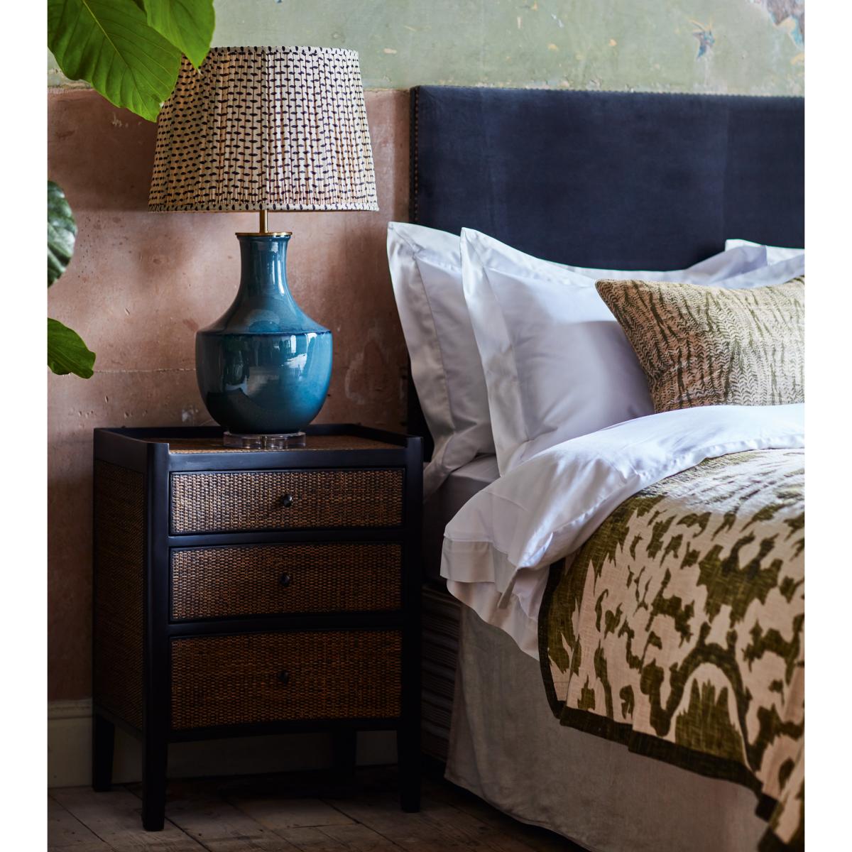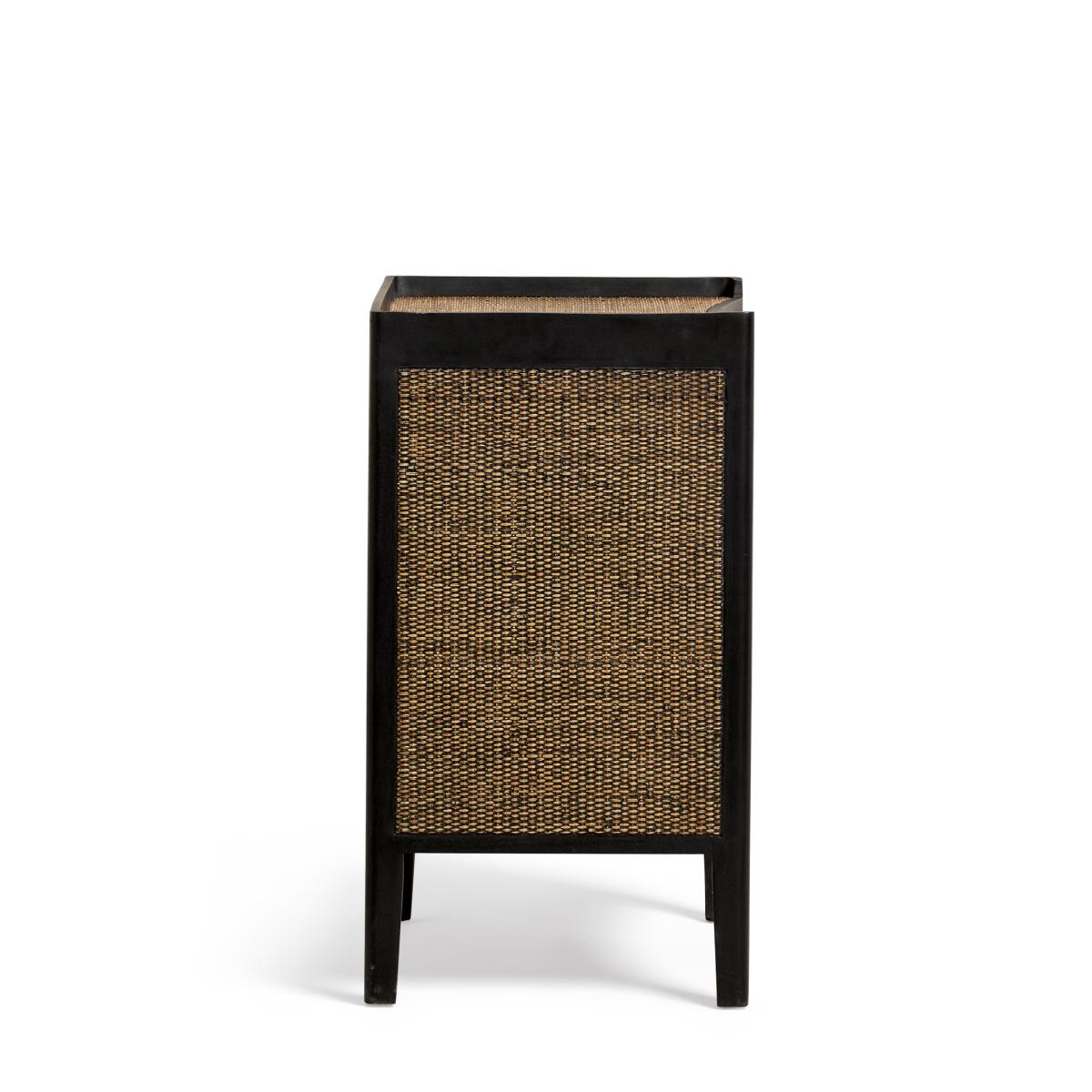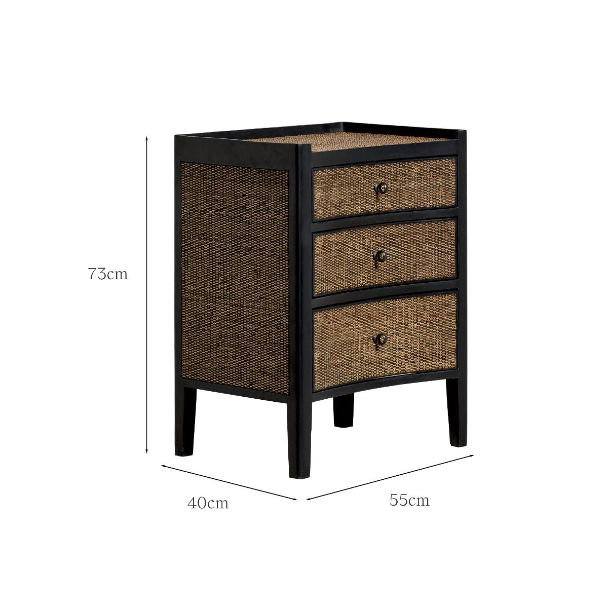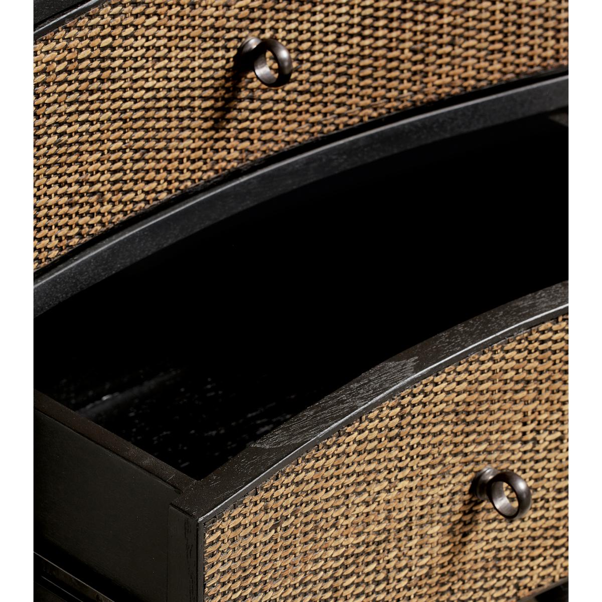 I love this small ebony chest of drawers for its sleek, contemporary design with a hint of natural texture from the woven rattan drawers. It works particularly well in modern, boho, or eclectic interiors, adding warmth and a bit of visual interest without overwhelming the space. Practical tips include styling it as a bedside unit in bedrooms or using it in living areas for additional storage while keeping the look uncluttered. Pairing it with matte black or brass accents and minimalistic accessories will enhance its sophisticated yet relaxed vibe. Its compact size makes it versatile and perfect for smaller spaces, providing both function and style seamlessly.