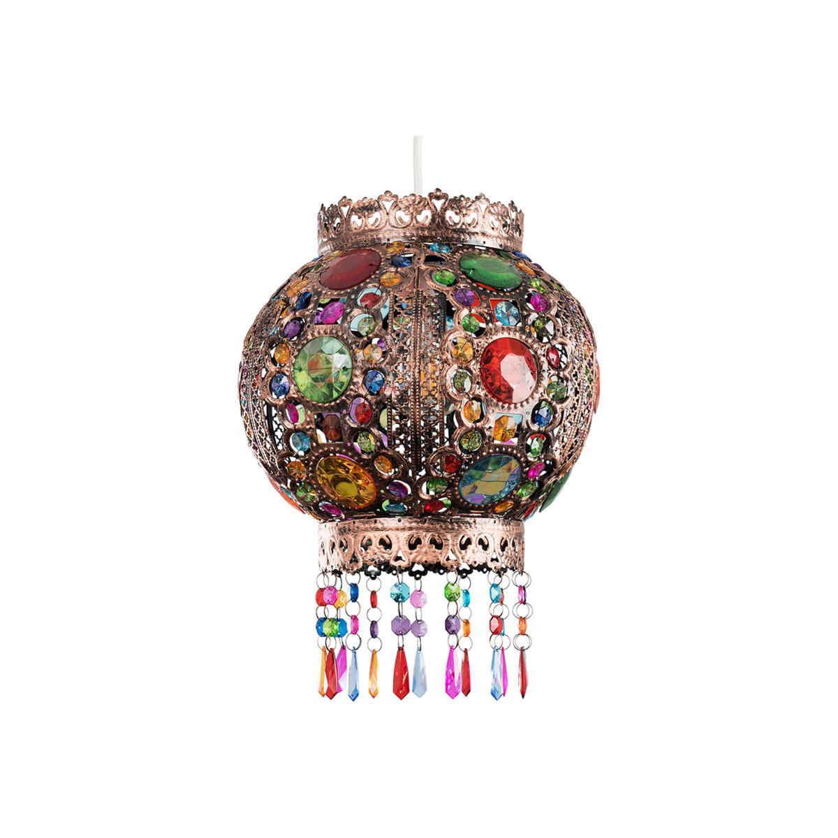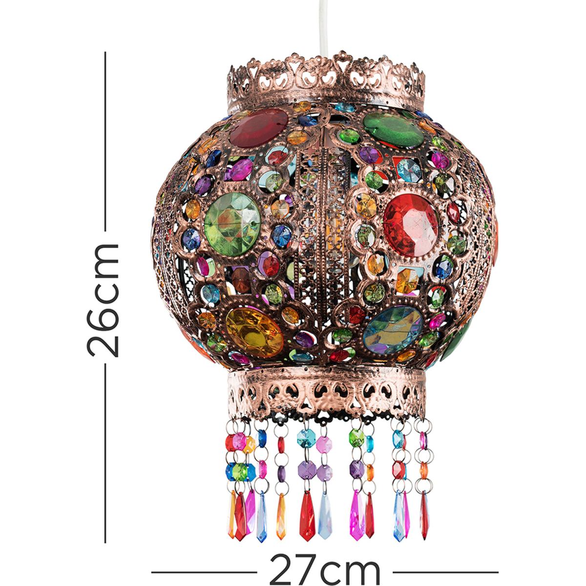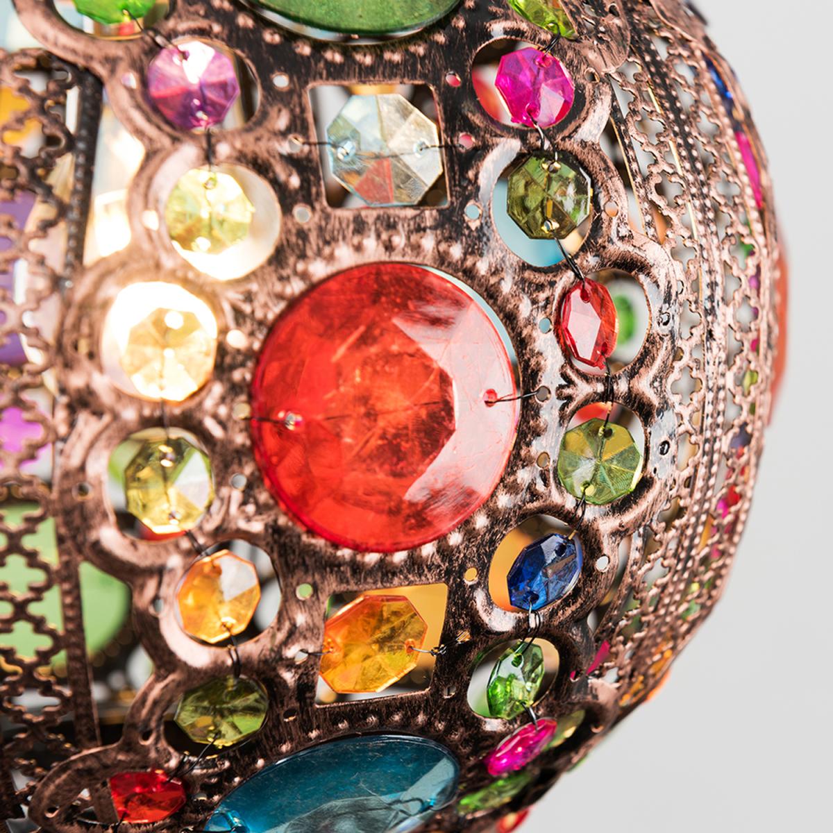 Beautiful moroccan bazaar style ceiling pendant light shade chandelier. Features light-reflecting multi coloured acrylic jewel droplets suspended from a bronze plated metal sphere frame, which casts the light beautifully around the room. Ideal for lounges, dining rooms, bedrooms and hallways. A non electric ceiling pendant shade is a quick and economical way to update your room in seconds! Easy to fit to your existing lamp holder no electrician required.
