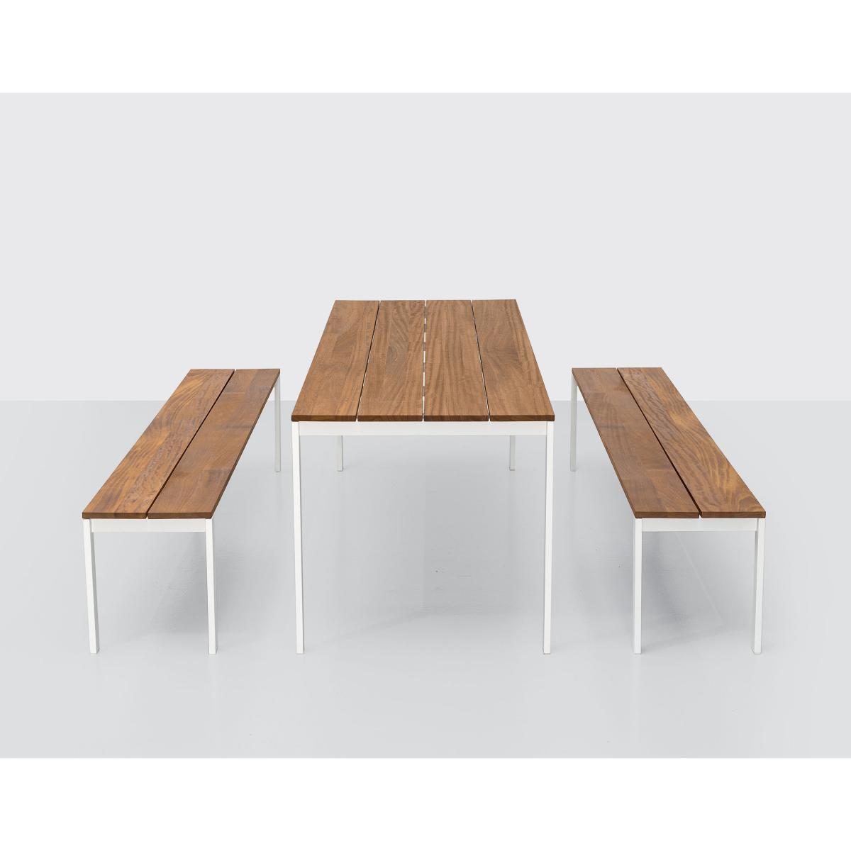 The be-Easy collection consists of elegant, warm furniture that’s at home both in the house and in the garden. With its sober, clean lines, it stands out for its elegance, simplicity and comfort. The be-Easy bench consists of a structure and four legs in white lacquered steel and a seat with teak slats, a naturally resistant material that’s FSC-certified. Teak can take on a natural patina over time to display a silver colour. If you want to keep its natural shade, we recommend you treat it with oil. It combines perfectly with tables from the same collection, with which it promises great times spent together.