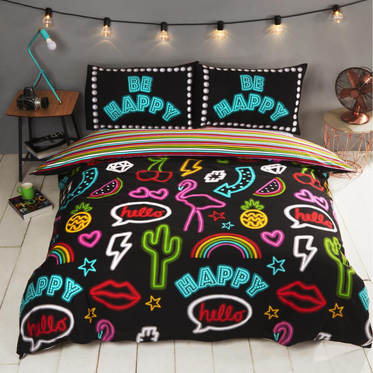 Bright and funky reversible duvet covers with a neon print design and coordinating stripe reverse. Featuring on trend cactus, flamingo and pineapple motifs, this contemporary print would work well throughout any bedroom.
