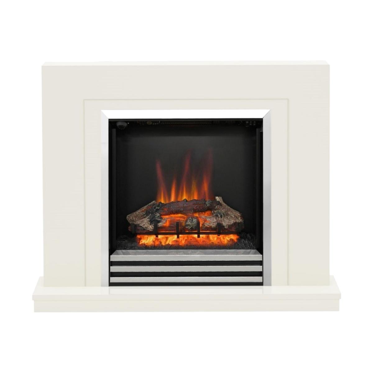 White Freestanding Log Effect Electric Fireplace Suite - Flare By Be Modern Colby Widescreen electric fire with Chrome trim and 3 bar fret 1kW - 2kW heat settings Thermostat control for energy efficiency Flame effect only setting Latest flame technology for long life and low energy consumption Realistic glowing log bed No chimney or recess required - flat wall fix 1KW setting= 13p per hour 2KW setting= 26p per hour
