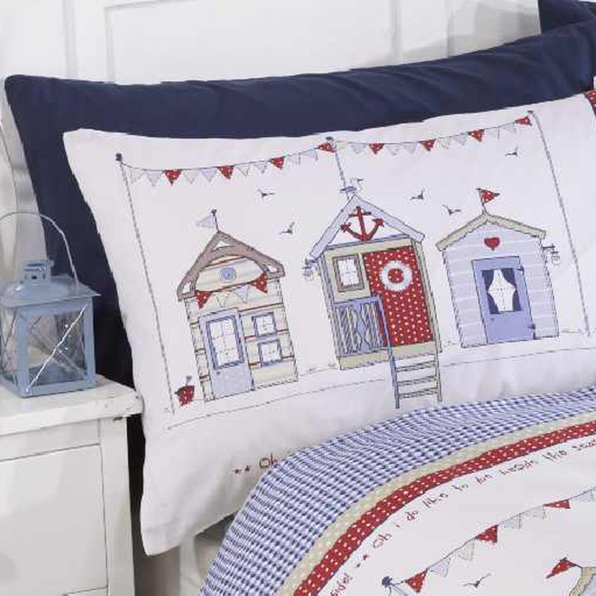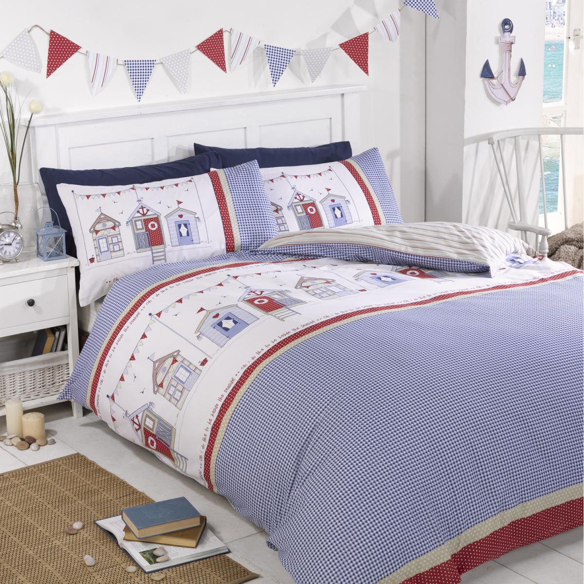 Our beach hut duvet covers have a retro nautical theme that brings back memories of british beach holidays. This classic beach design is in shades of blue and red will be a stylish addition to any bedroom.