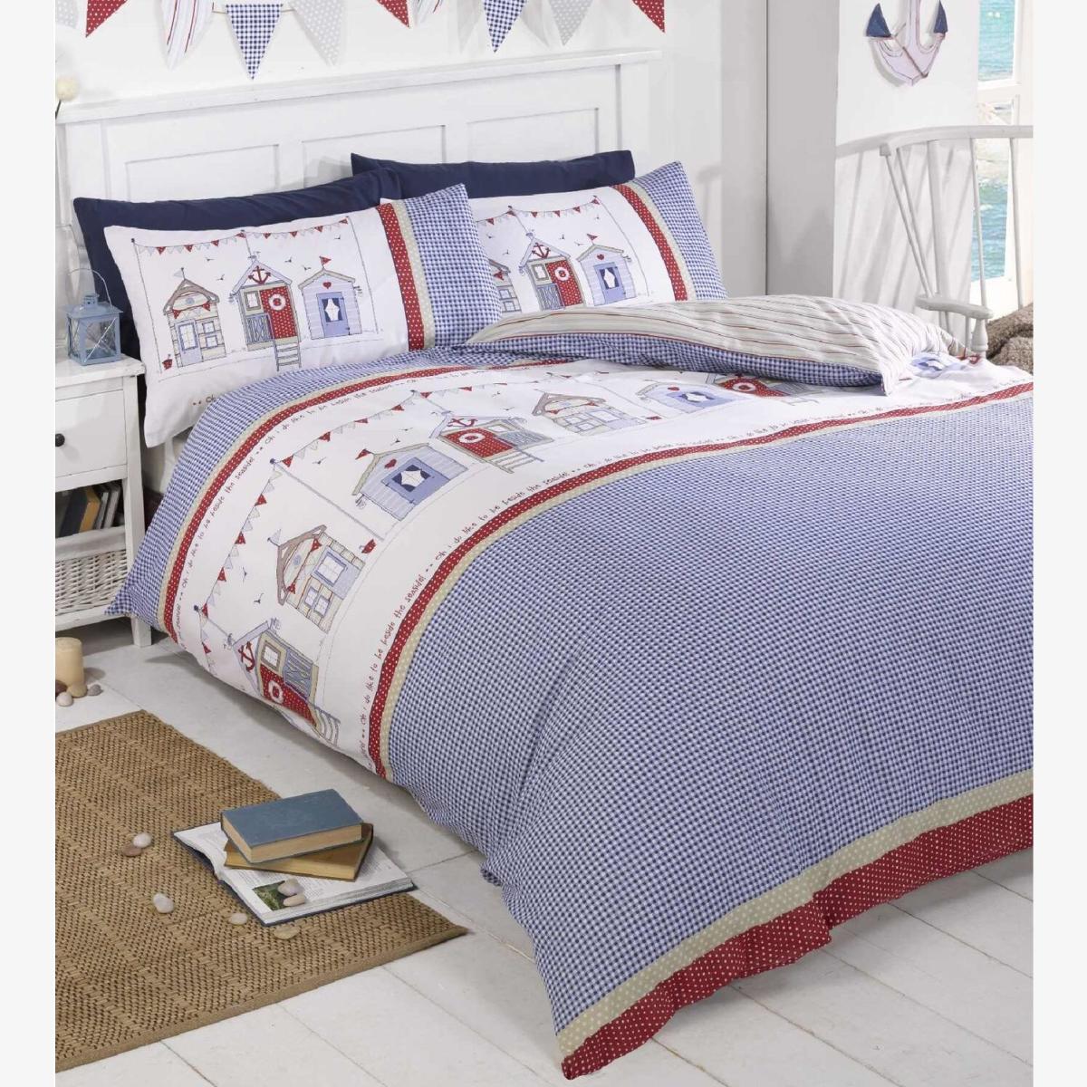 If you like to be beside the seaside, you'll love these beach hut duvet cover bed sets! The design features a neat blue and white checked design with strips of red and beige dotted with white polka dots. Also featured is a clean white panel overlaid by beautiful softly coloured beach huts connected by strings of bunting captioned with the text ' Oh I do like to be beside the seaside' in red font. The reverse of the bedding has a stylish red, beige, white, and blue striped design which goes perfectly with the beach theme.