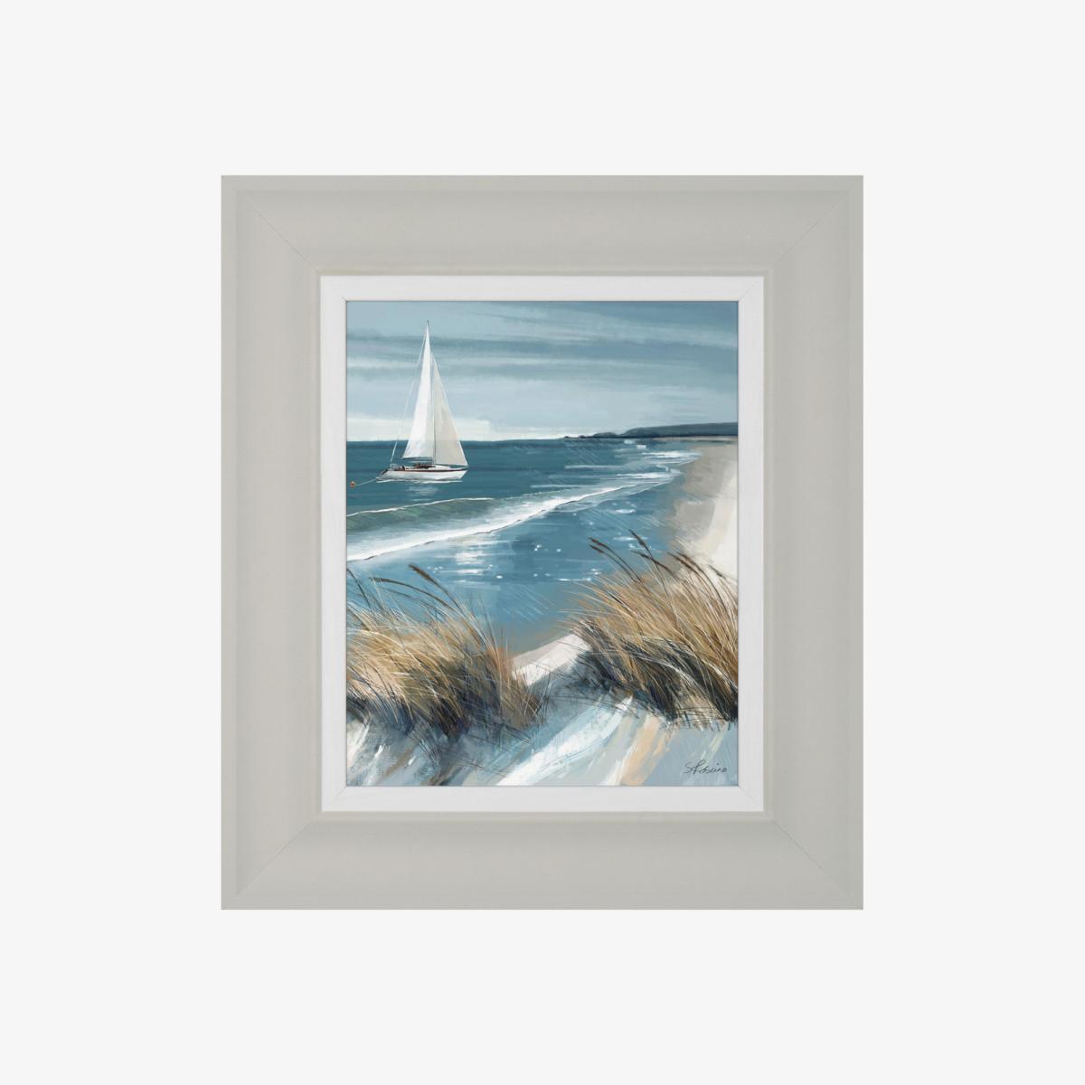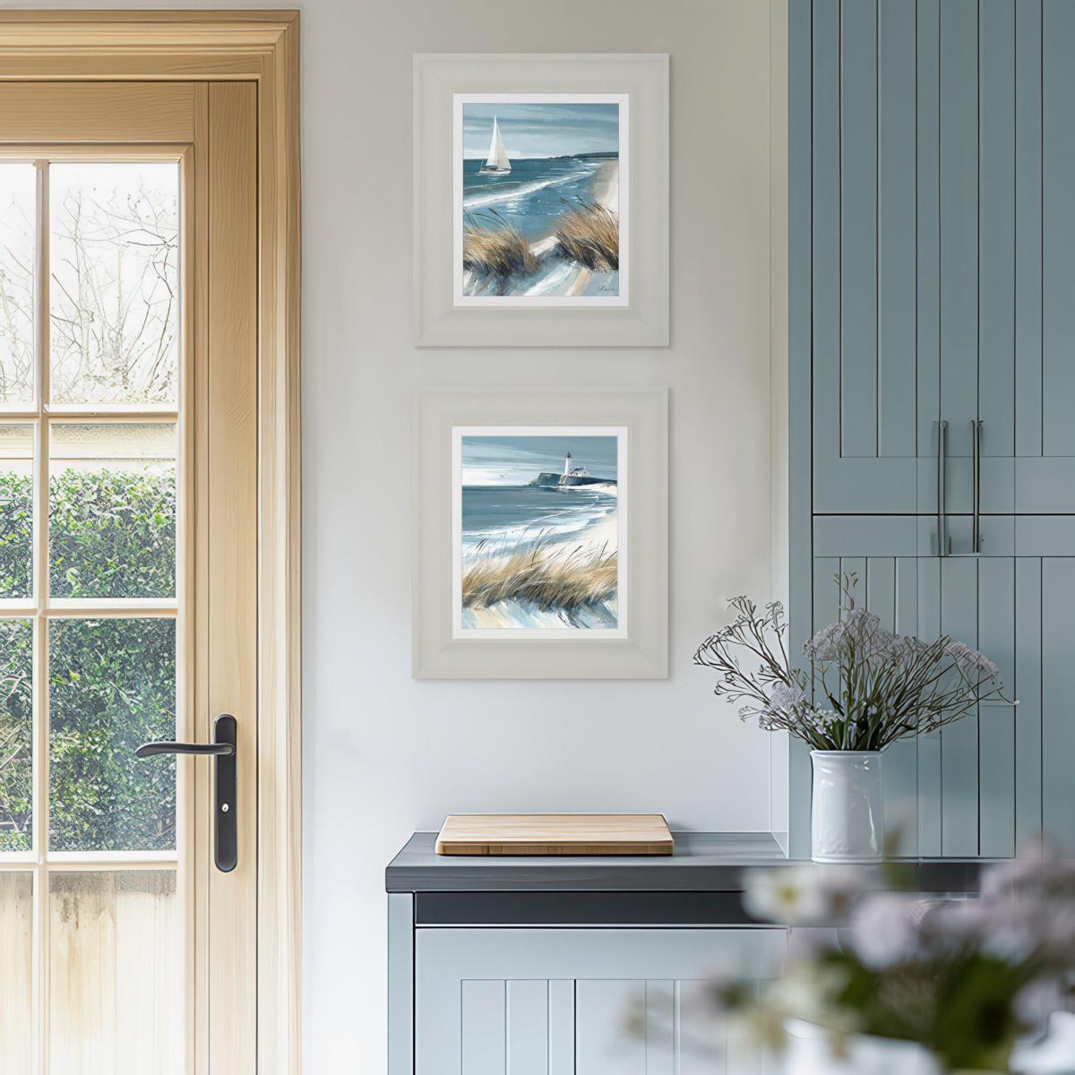I love this set of two prints for its calming coastal vibe, making it a versatile choice for a variety of interiors. It works particularly well in seaside-inspired schemes, beach house interiors, or even modern coastal living rooms where a touch of tranquillity is desired. When styling, consider placing them above a sofa or sideboard, pairing with natural textures like linen cushions or rattan accessories to enhance the relaxed feel. For a balanced display, hang the pair with a slight gap between them, ensuring they’re at eye level for maximum impact. This artwork is an easy way to add a subtle, soothing focal point that invites serenity into the space.