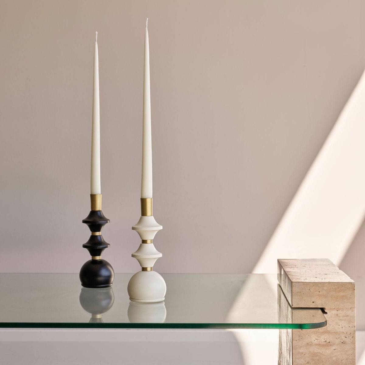 I love this candleholder for its bold yet elegant geometric design and contrasting brass and black tones, making it a versatile statement piece. It works particularly well in modern or contemporary interiors, adding a touch of sophistication to dining tables, sideboards, or mantelpieces. For styling tips, experiment with grouping it alongside other brass accents or minimalist textiles for a balanced look. Its striking shape makes it a focal point on its own, but layering with complementary candles or varying heights can create a warm, inviting vignette. Keep the surrounding decor simple to let its sculptural form shine.