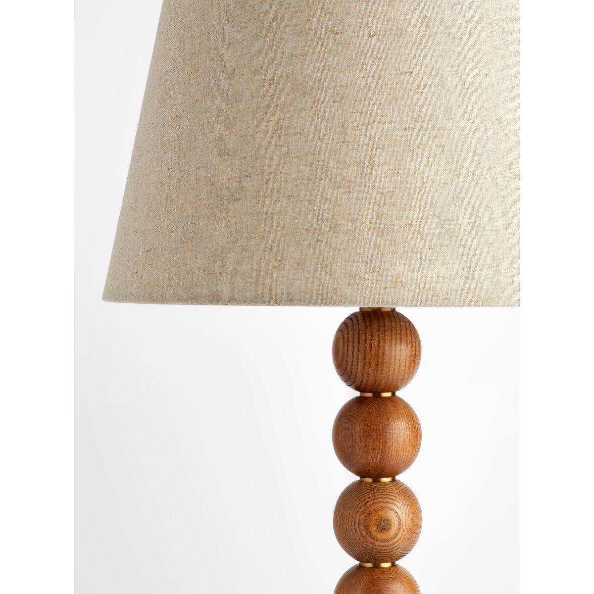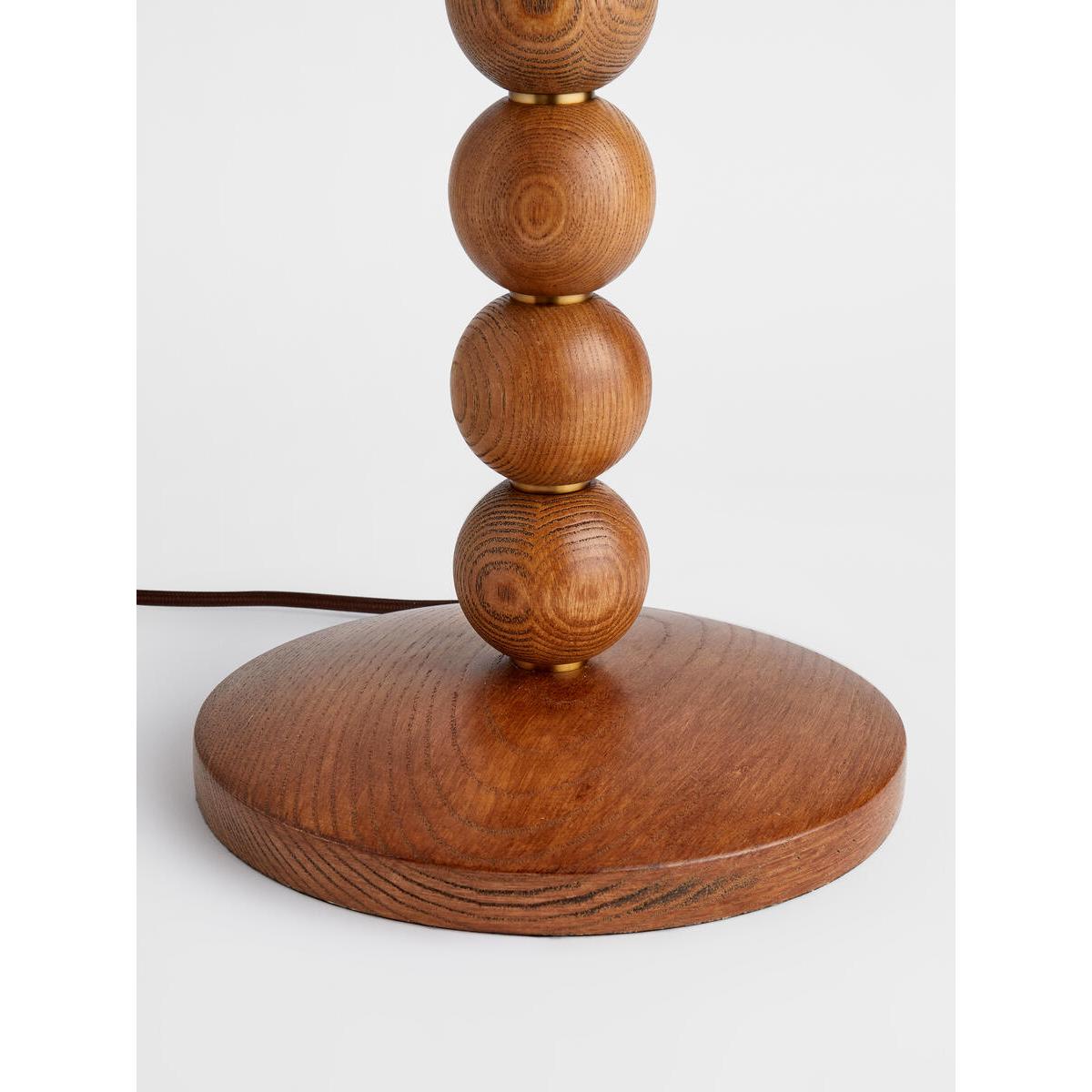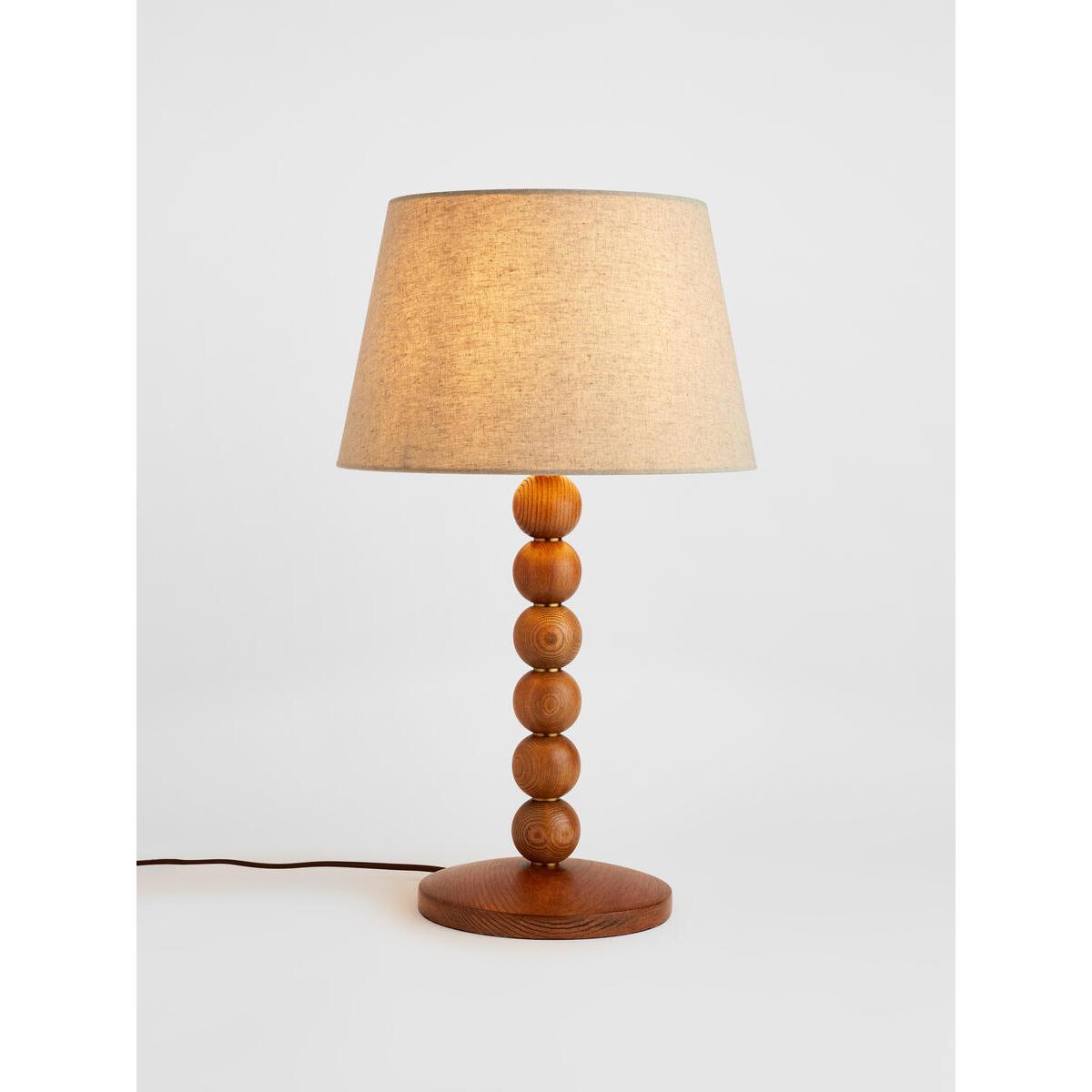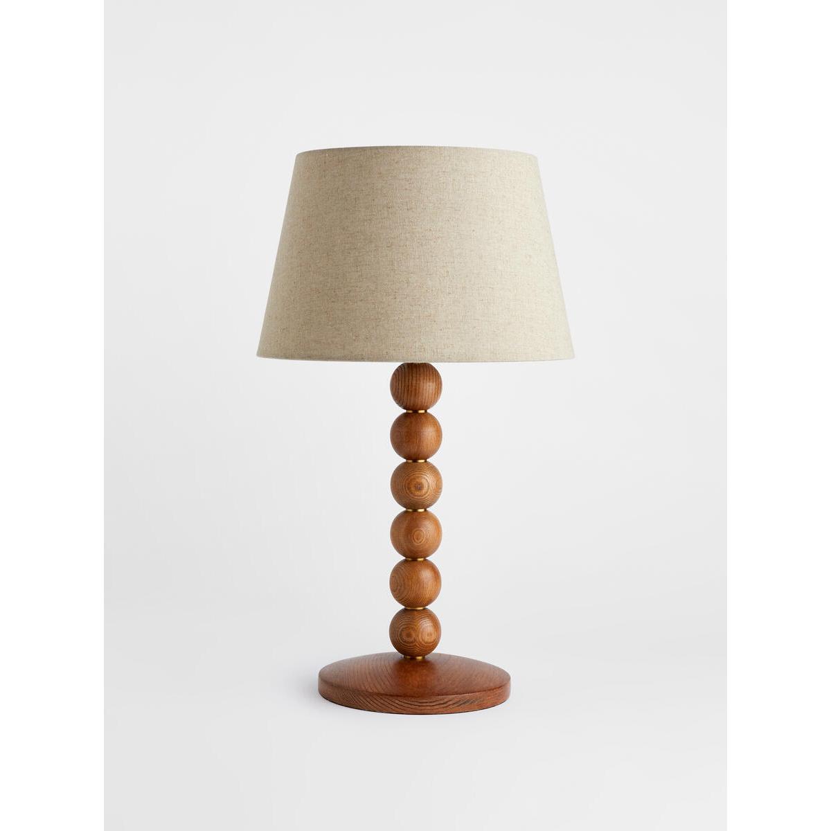 Made from solid oak, our Bead table lamp is characterised bywooden stacking beads, with antique brass finish discs slotted inbetween to mirror the textures at Soho Roc House. It's paired witha natural linen shade in a tapered design. Perch it on a side tableor bedside cabinet to create an ambient glow. Turned solid oak base. Antique brass finish detail. Natural linen tapered shade. Requires 1 x E27 bulb/ max 40. W. Inspired by Soho Roc House.