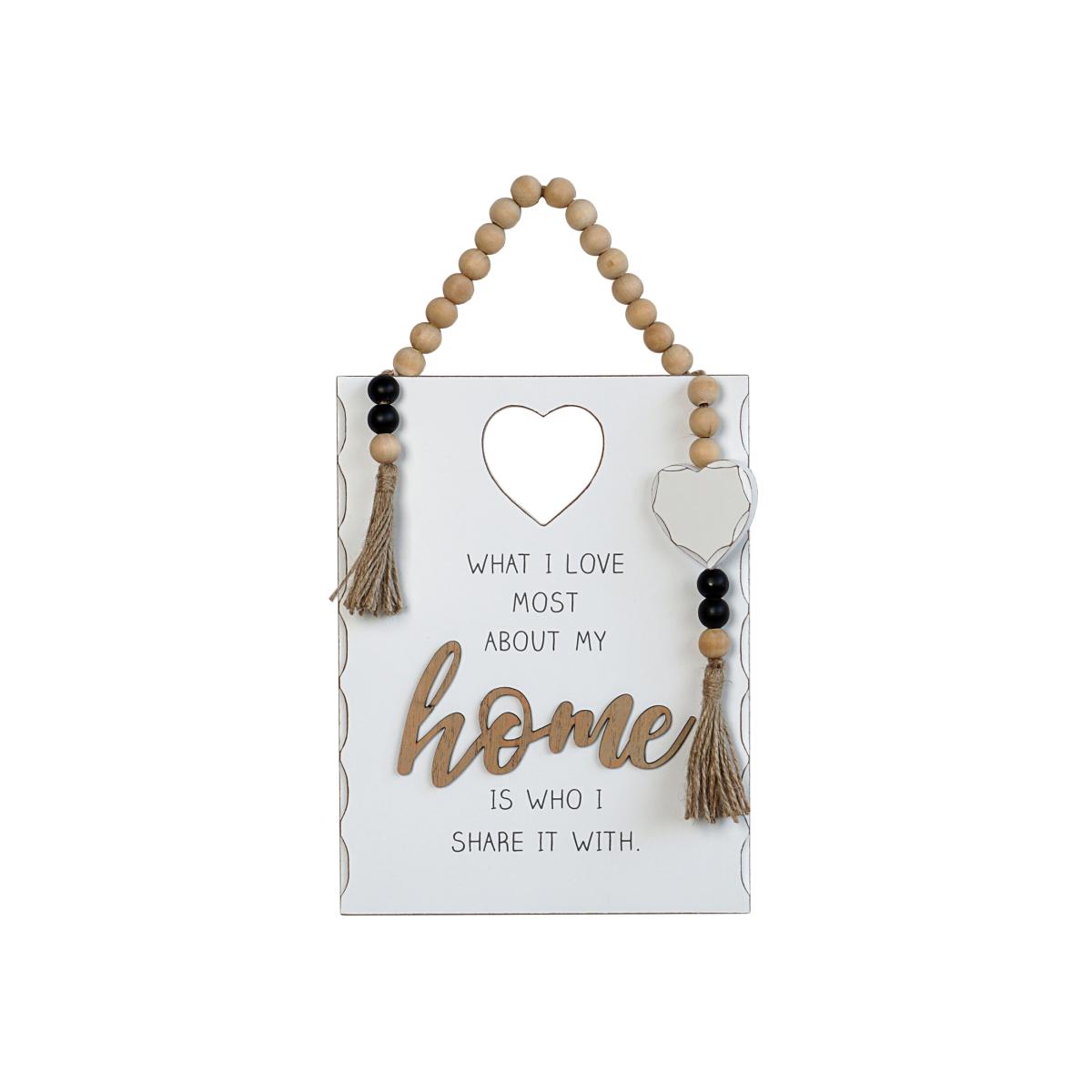 The Beaded Love Home Hanging Plaque is a quaint way to decorate your space and remember what's most important about your home: the people you share it with. The plaque has a cut-out heart design and is finished with a traditional bead hanging with tassels for a rustic, country feel. It's quick and easy to hang and will look lovely in communal areas of the home, such as the living room, kitchen, or hallway.