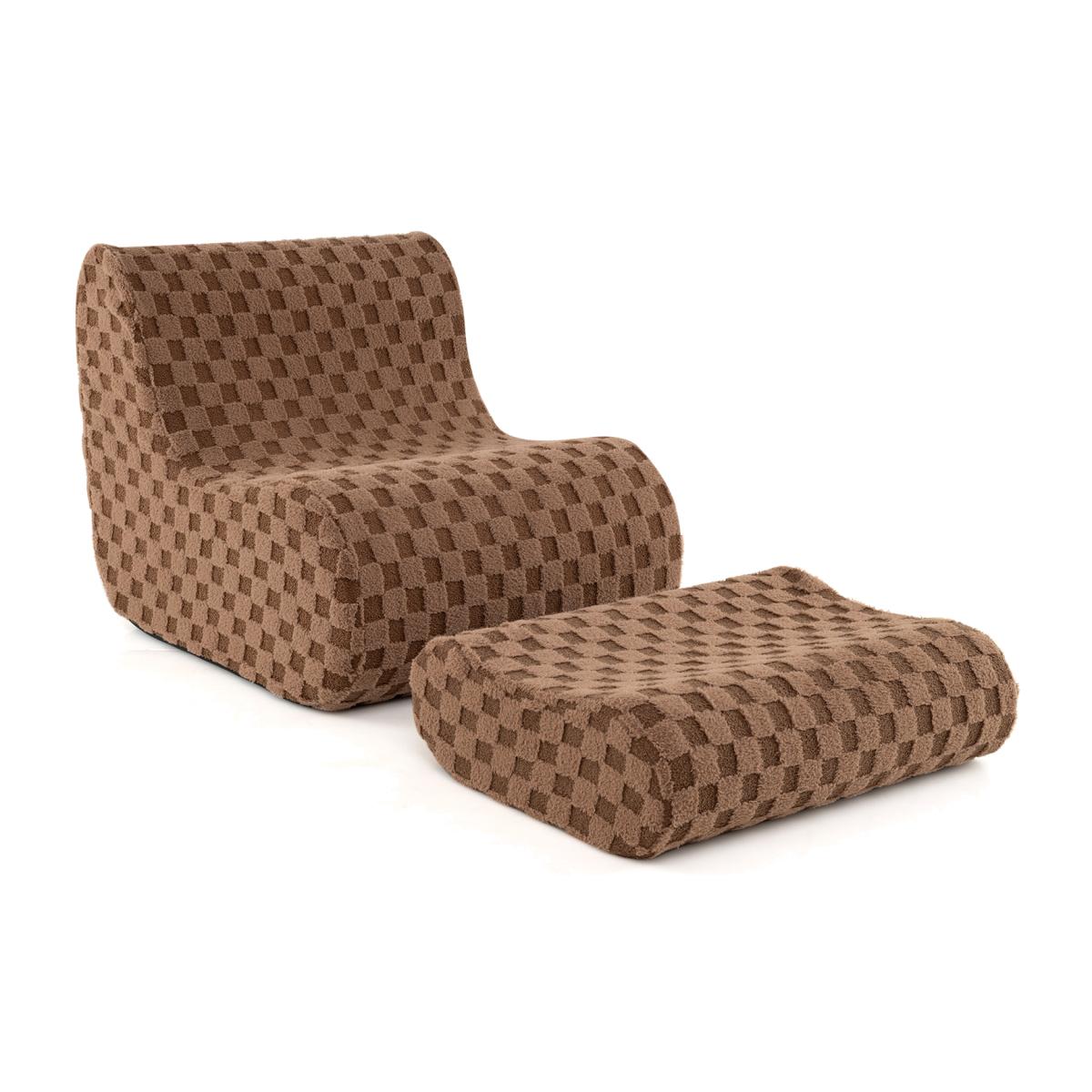 I love this bean bag with its matching ottoman for adding a relaxed, versatile touch to a room. Its warm brown tone and subtle checkered pattern make it easy to incorporate into a variety of interiors, from contemporary to more traditional schemes. It works especially well in casual living rooms, home dens, or even bedrooms, offering comfortable, flexible seating without overwhelming the space. Practical styling tips include pairing it with neutral or earthy tones for a cosy vibe or using it as a contrast piece beside a sleek sofa for a laid-back feel. Its informal aesthetic makes it perfect for creating a welcoming, informal atmosphere, and the ottoman doubles as extra seating or a footrest, adding to its functional appeal.