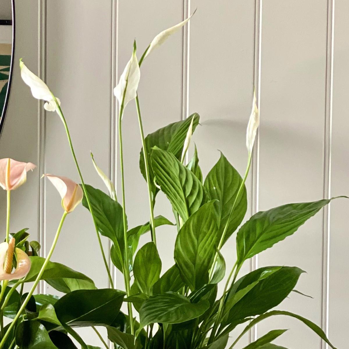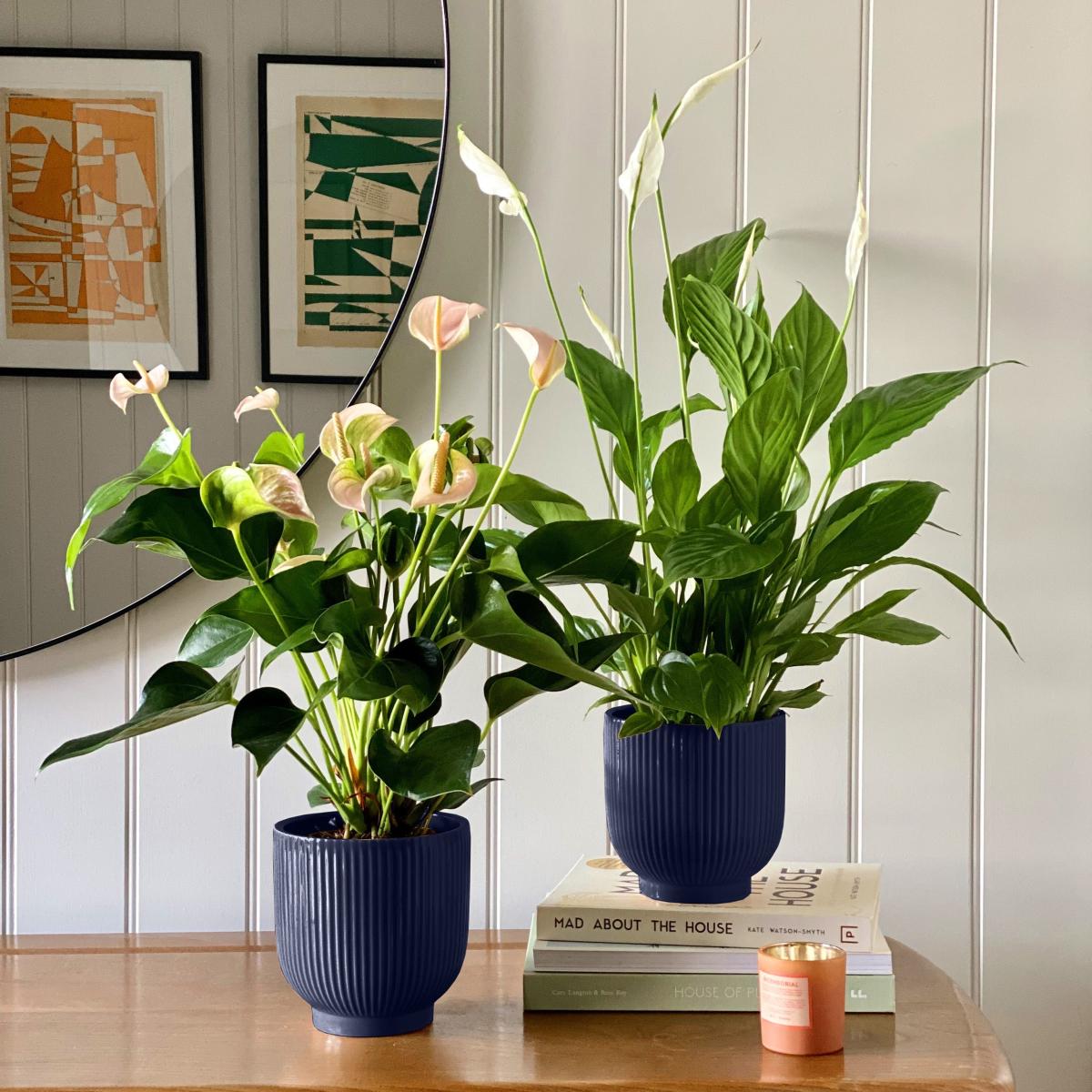 * Light: Enjoys bright, indirect light* Water: Water when the top 2 inches of soil are dry to touch* Expert level: I'm perfect for those new to plant parenthood* Pet friendly: Not pet friendly- keep away from furry friends and little people* Air purifying: I remove the nasties lurking in your room Full of positivity and all round good vibes, this flowering duo are guaranteed to bring a smile to your face. The pretty peach of the Anthurium contrasts beautifully against the delicate, white flowers of the Peace Lily. The Peach Anthurium is commonly known as the Flamingo plant, in reference to its dramatic leaves, and is said to represent happiness and abundance. Whereas the Peace Lily is known for its incredible air purifying qualities and bringing an element of peace and calm to any space. What a powerful pair! Each plant is paired with a perfectly fitting ribbed ceramic pot, making a gorgeous gift. * How to keep me happy:* Light: Enjoys bright, indirect light* Water: Water when the top 2 inches of soil are dry to touch* Expert level: I'm perfect for those new to plant parenthood Please note:As this is a living product your plant may vary to the one photographed. Plant height measurement includes the pot. Width measurement is for the width of the pot only; width of the plant may vary.