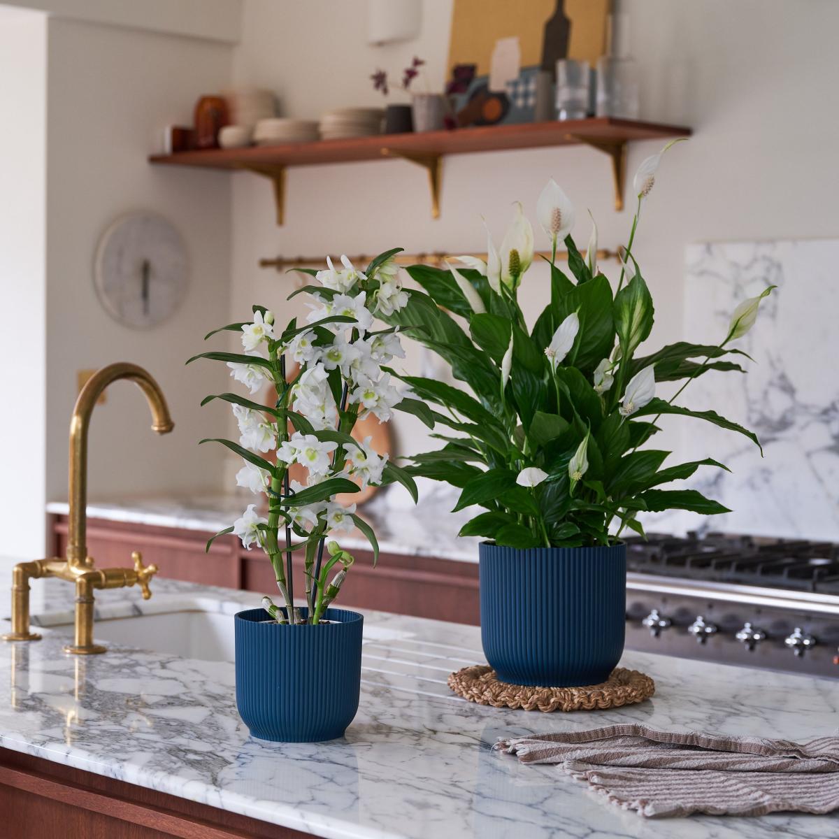 * Light: Enjoys bright, indirect light* Water: Water when the top 2 inches of soil are dry to touch* Expert level: I'm perfect for those new to plant parenthood* Pet friendly: Not pet friendly- keep away from furry friends and little people* Air purifying: I remove the nasties lurking in your room This blooming beautiful pair of plants are about as delicate and graceful as they come. With soft white flowers, contrasted against their bright green leaves, these plants make a truly striking duo. The Bamboo Orchid & Peace Lily might be gorgeously tall & good looking, but there's much more to these plants than first meets the eye. They're both excellent air purifiers and will help rid the air in your home of any toxic nasties, whilst filling your space with clean, fresh air. Paired with our perfectly fitting Vibes pots, made with recycled plastic. * How to keep me happy:* Light: Enjoys bright, indirect light* Water: Water when the top 2 inches of soil are dry to touch* Expert level: I'm perfect for those new to plant parenthood Please note:As this is a living product your plant may vary to the one photographed. Plant height measurement includes the pot. Width measurement is for the width of the pot only; width of the plant may vary.